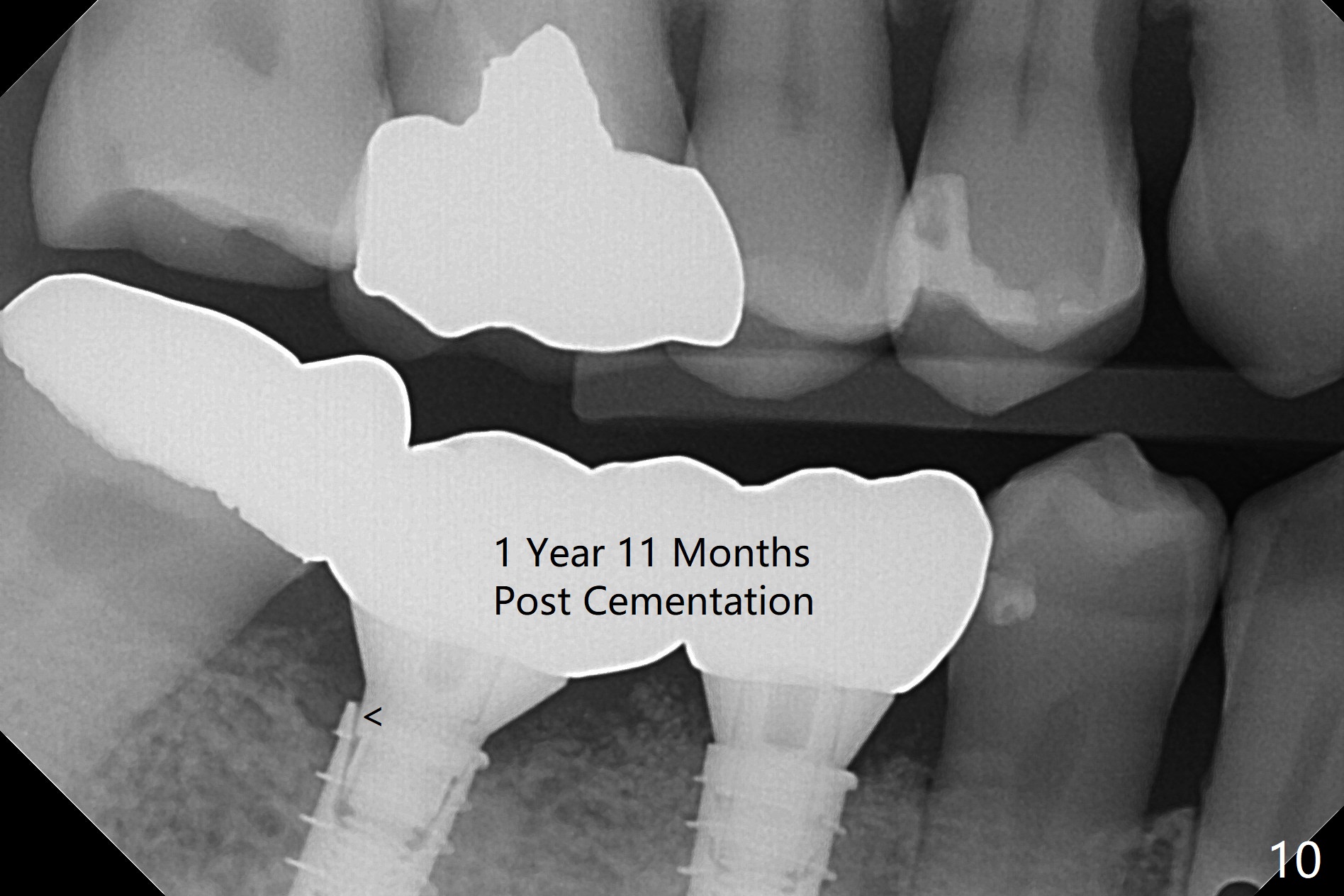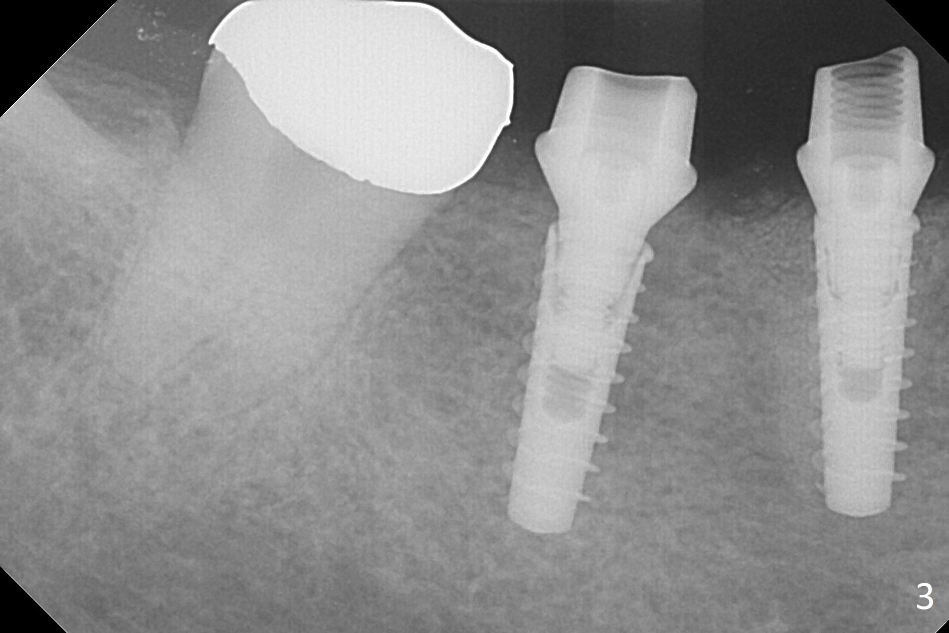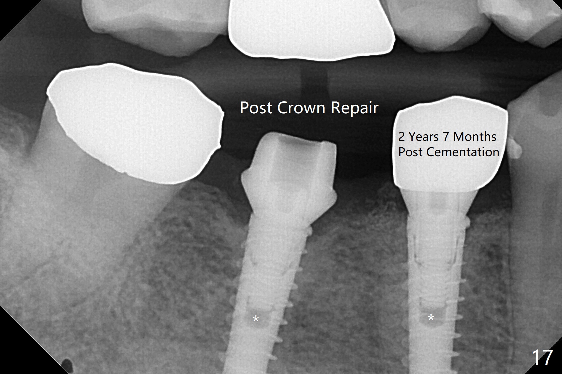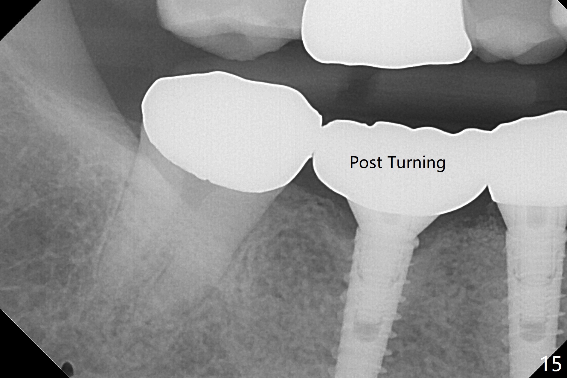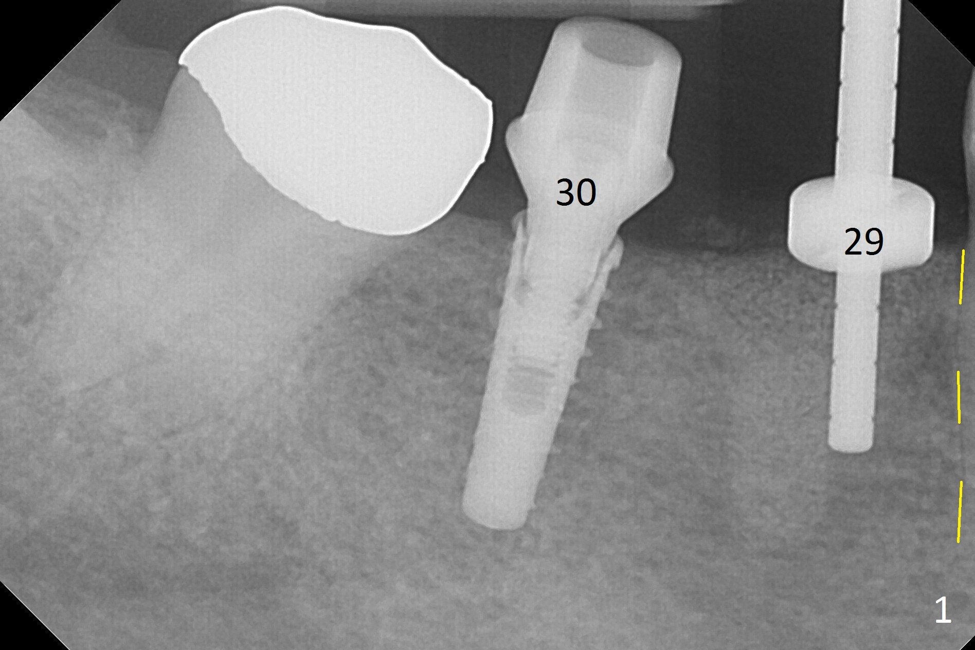 After incision, the ridge at #29 and 30 is found ~ 5 mm wide buccolingually. To place a 4x11 mm IBS implant at #30, the ridge is expanded using BEB technique (bone expansion and bending, Fig.1). It appears that the initial osteotomy at #29 is mesial (Fig.1 yellow dashed line: the distal surface of the root of the tooth #28). After moving the osteotomy distal, the final implant position at #29 (4x11 mm) is within normal limit (Fig.2). The bone at #29 seems to be not so dense that bending (using 1.6 mm drill) is not necessary (using Magic Split and Magic Expanders 3 and 3.8 mm). Later the implant at #30 (4x11 mm) is placed deeper (Fig.3). After placing bone graft around the implants/abutments and suturing, the ridge looks wider with apparent formation of the gingival bands around the abutments (Fig.4 *). Three months and a half postop, bone loss is minimal (Fig.5) and gingival bands forms around the abutments (Fig.6). Fig.7 is taken 1 month post cementation (panoramic X-ray). The patient chews normally 1 year (Fig.8) and nearly 2 years (Fig.9,10) post cementation. The crown at #31 needs recementation 2 years 7 months post #30 cementation; the incomplete seating of the abutment was noted for the first time (Fig.11). Five months later the patient is going to be retired and wants to travel abroad. After approval, the access hole was reopened; articulating paper shows under occlusion of the crown (Fig.12). Since the gap between the abutment and the implant is large, the abutment/crown complex seems to be necessary to be turned (Fig.13 curved arrow). The proximal surfaces of the crown need to be trimmed (straight lines). After turning, the crown sits down with screw tightening; the patient feels pain from the gingival cuff (Fig.14). After turning, the abutment appears to be completely seated (Fig.15). In fact the mesial and distal surfaces of the crown should have clearance from the neighboring teeth (Fig.14) so that pick-up impression is able to hold the crown/abutment complex securely (Fig.16: *). The crown is separated from the abutment after crown repair. They are seated together (loose connection) using the crown as a guide to seat the abutment. BW is taken without the crown. It appears that the abutment remains seated completely (Fig.17). The apical space is equal between #29 and 30 (Fig.17, as compared to Fig.5).