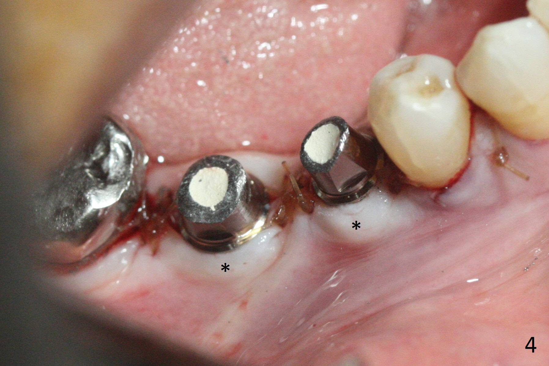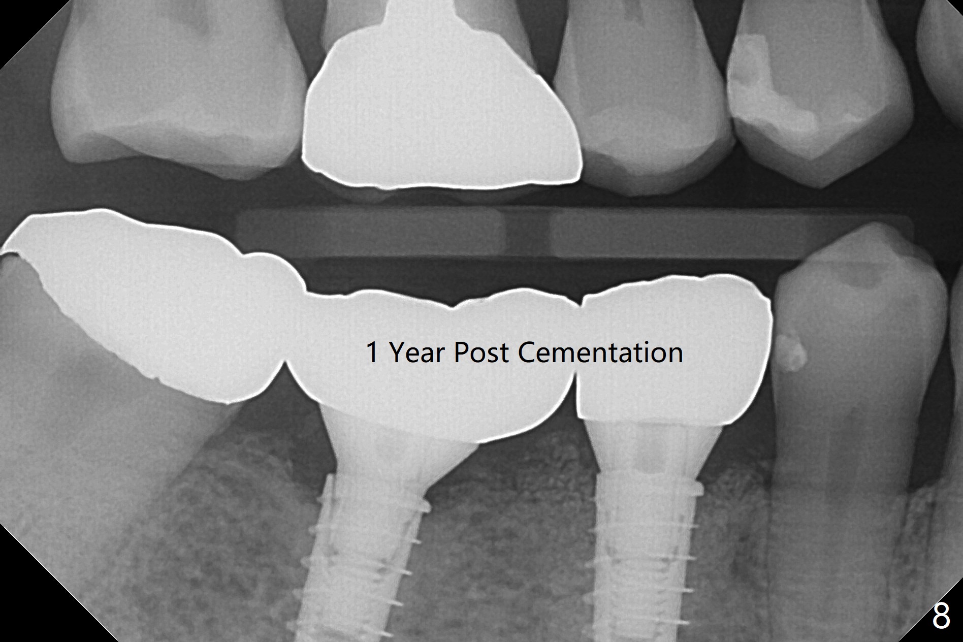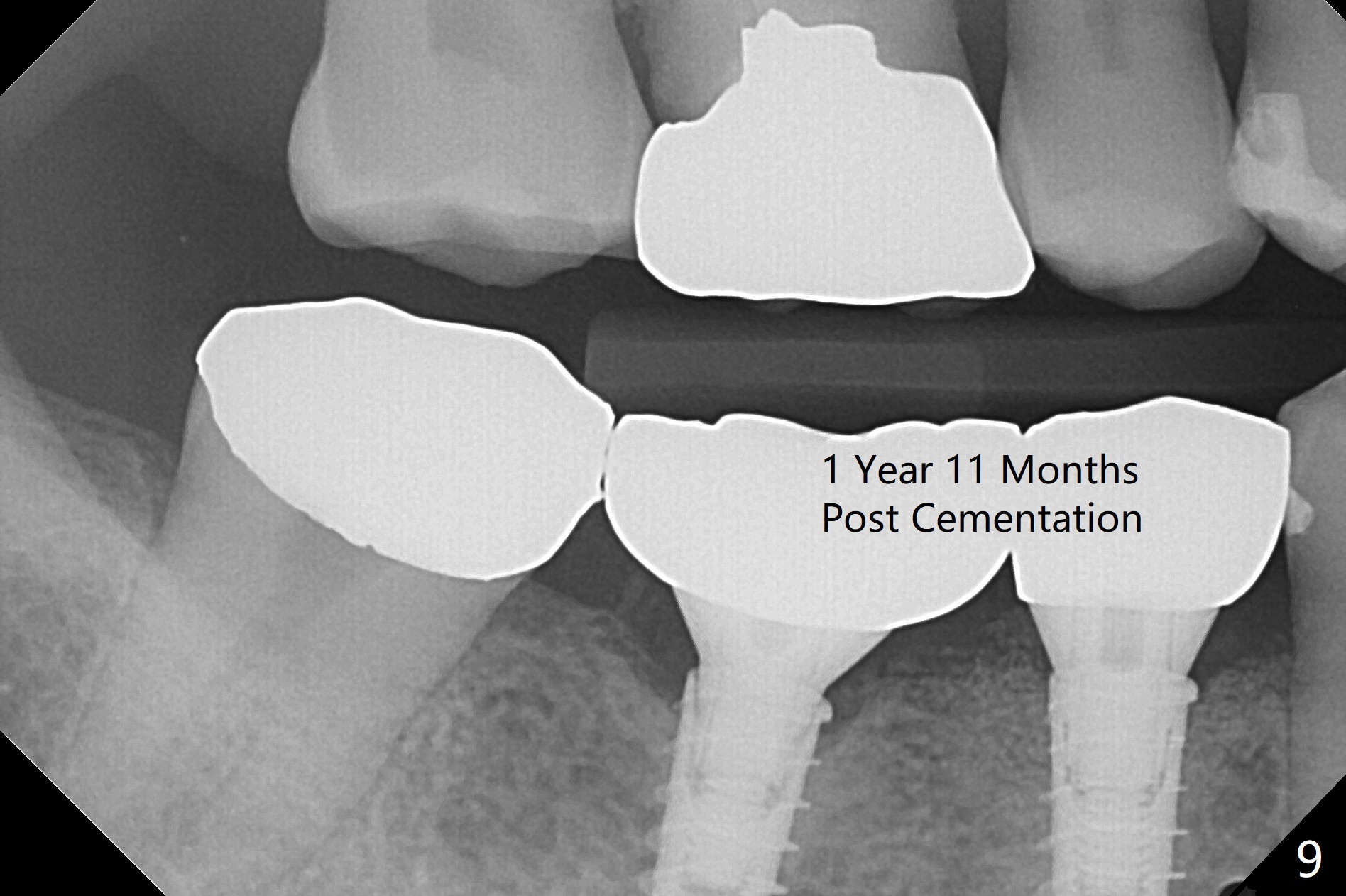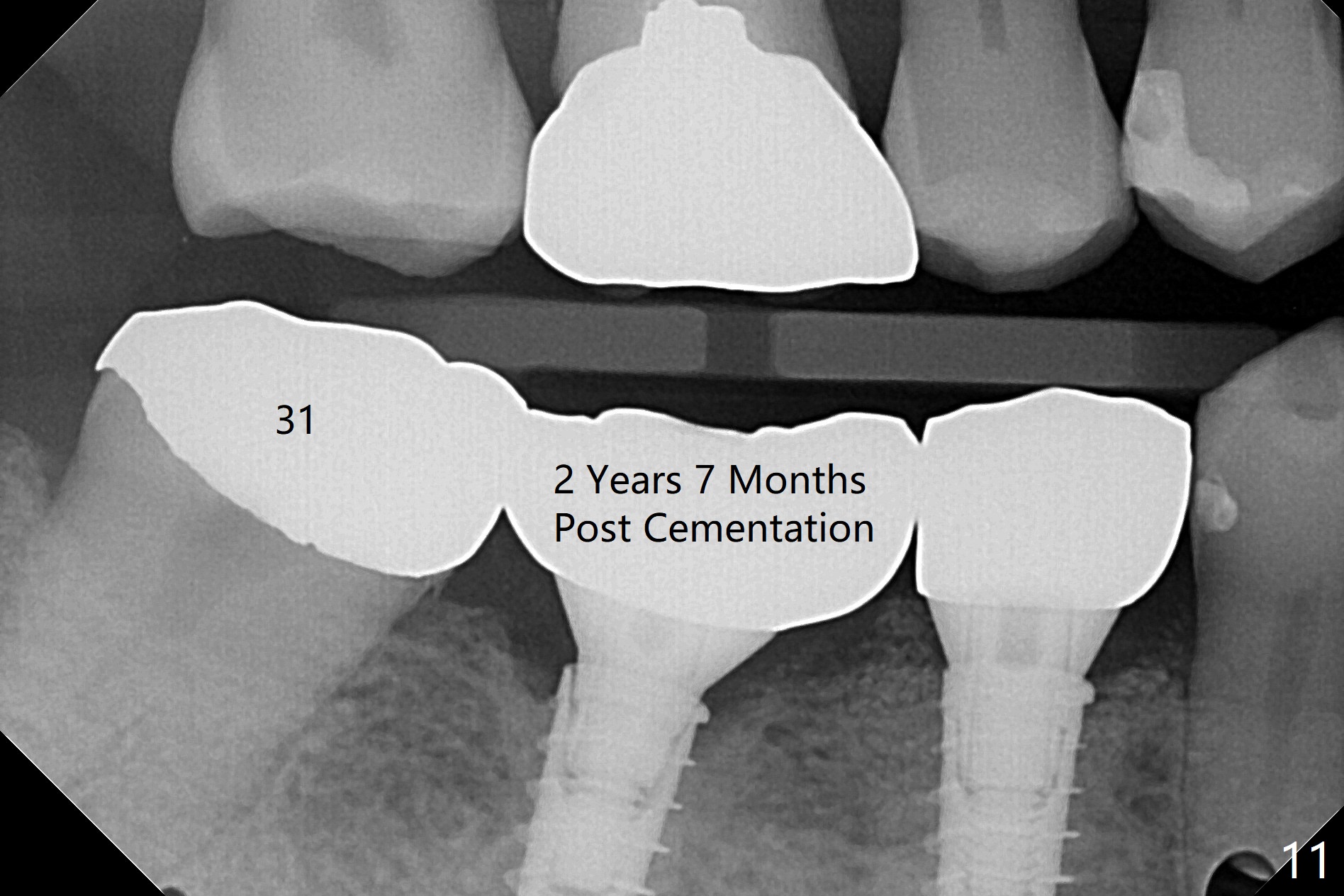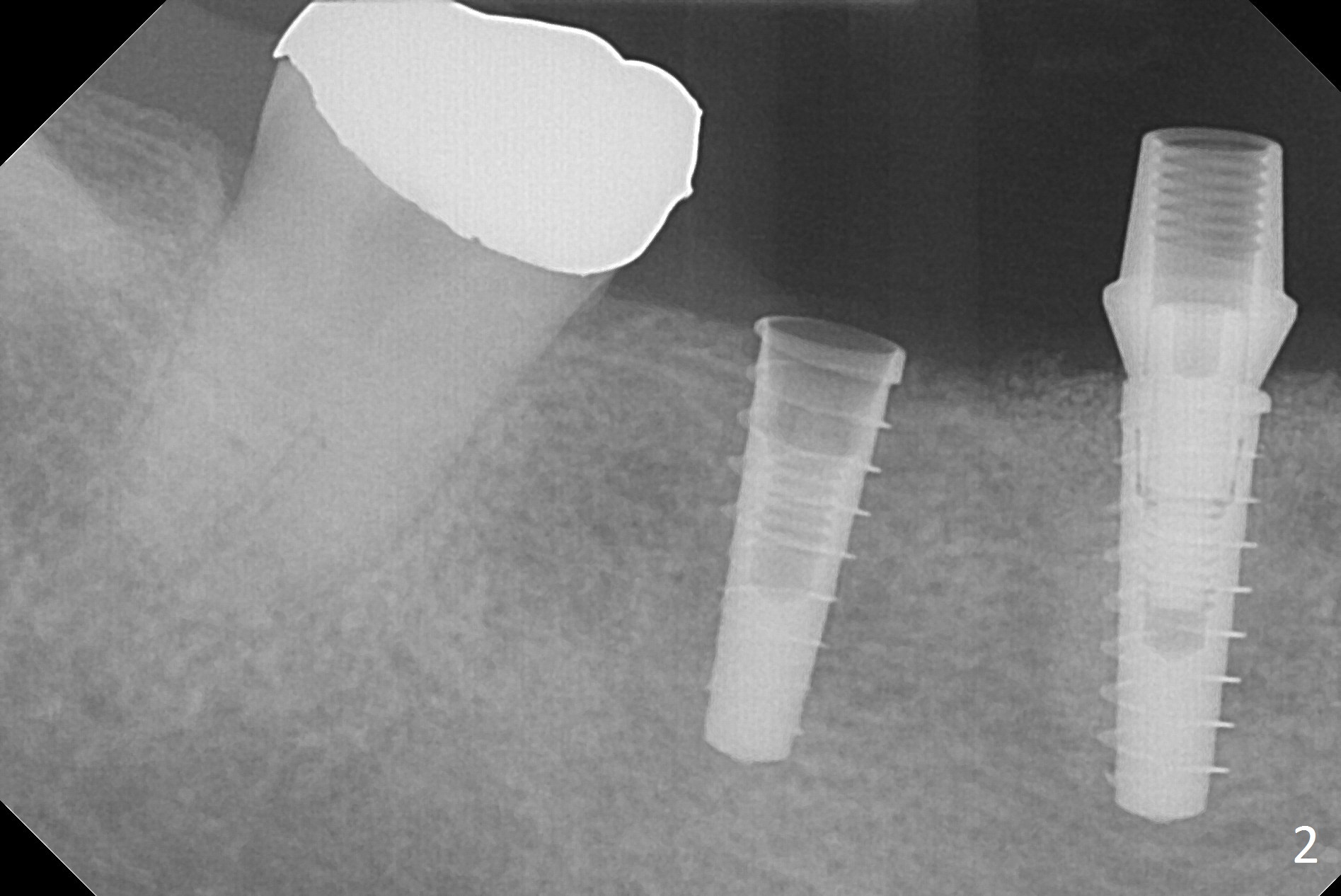 After incision, the ridge at #29 and 30 is found ~ 5 mm wide buccolingually. To place a 4x11 mm IBS implant at #30, the ridge is expanded using BEB technique (bone expansion and bending, Fig.1). It appears that the initial osteotomy at #29 is mesial (Fig.1 yellow dashed line: the distal surface of the root of the tooth #28). After moving the osteotomy distal, the final implant position at #29 (4x11 mm) is within normal limit (Fig.2). The bone at #29 seems to be not so dense that bending (using 1.6 mm drill) is not necessary (using Magic Split and Magic Expanders 3 and 3.8 mm). Later the implant at #30 (4x11 mm) is placed deeper (Fig.3). After placing bone graft around the implants/abutments and suturing, the ridge looks wider with apparent formation of the gingival bands around the abutments (Fig.4 *). Three months and a half postop, bone loss is minimal (Fig.5) and gingival bands forms around the abutments (Fig.6). Fig.7 is taken 1 month post cementation (panoramic X-ray). The patient chews normally 1 year (Fig.8) and nearly 2 years (Fig.9,10) post cementation. The crown at #31 needs recementation 2 years 7 months post #30 cementation; the incomplete seating of the abutment was noted for the first time (Fig.11). Five months later the patient is going to be retired and wants to travel abroad. After approval, the access hole was reopened; articulating paper shows under occlusion of the crown (Fig.12). Since the gap between the abutment and the implant is large, the abutment/crown complex seems to be necessary to be turned (Fig.13 curved arrow). The proximal surfaces of the crown need to be trimmed (straight lines). After turning, the crown sits down with screw tightening; the patient feels pain from the gingival cuff (Fig.14). After turning, the abutment appears to be completely seated (Fig.15). In fact the mesial and distal surfaces of the crown should have clearance from the neighboring teeth (Fig.14) so that pick-up impression is able to hold the crown/abutment complex securely (Fig.16: *). The crown is separated from the abutment after crown repair. They are seated together (loose connection) using the crown as a guide to seat the abutment. BW is taken without the crown. It appears that the abutment remains seated completely (Fig.17). The apical space is equal between #29 and 30 (Fig.17, as compared to Fig.5).