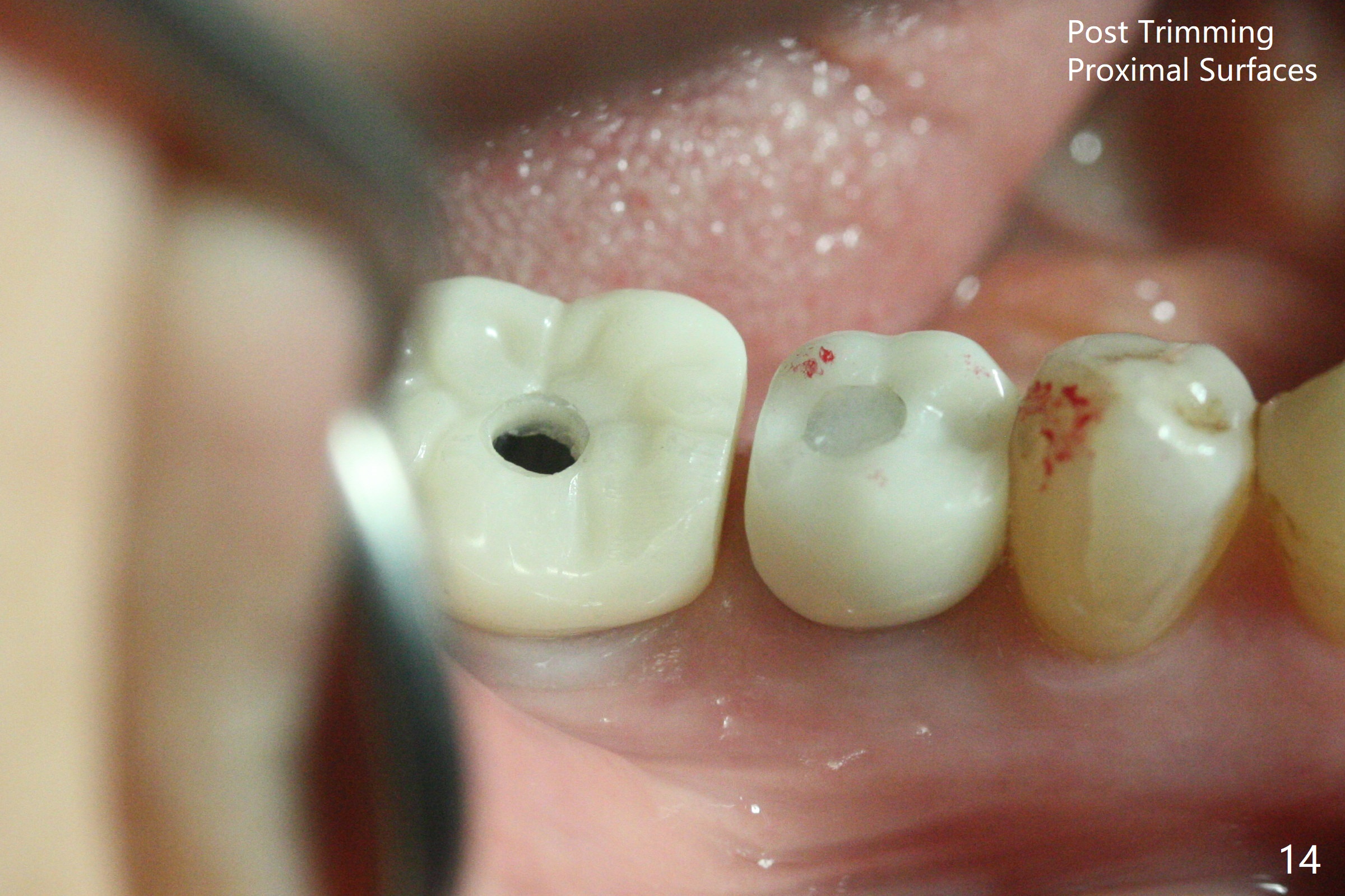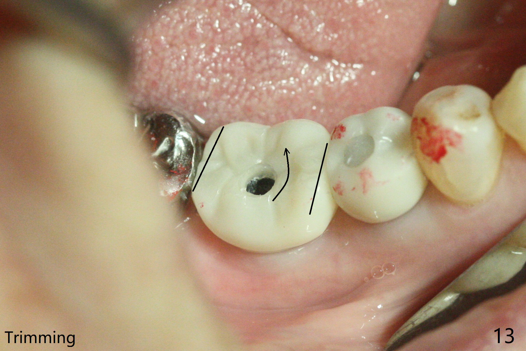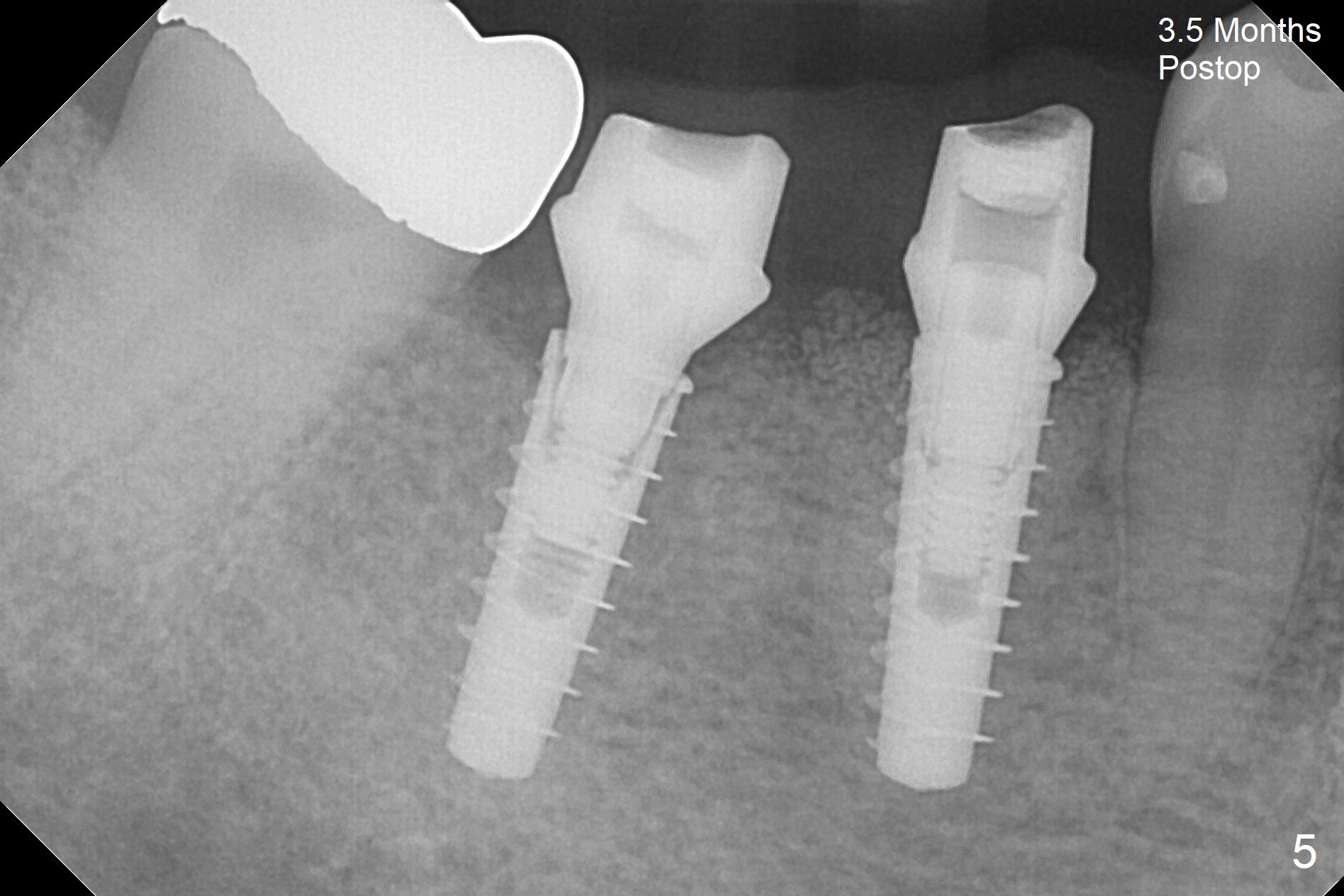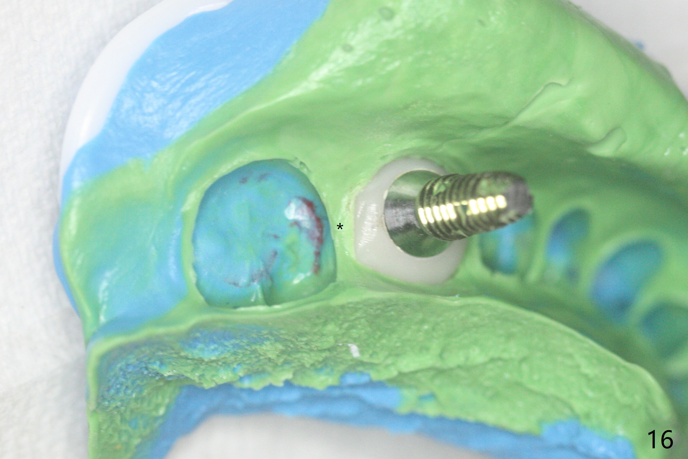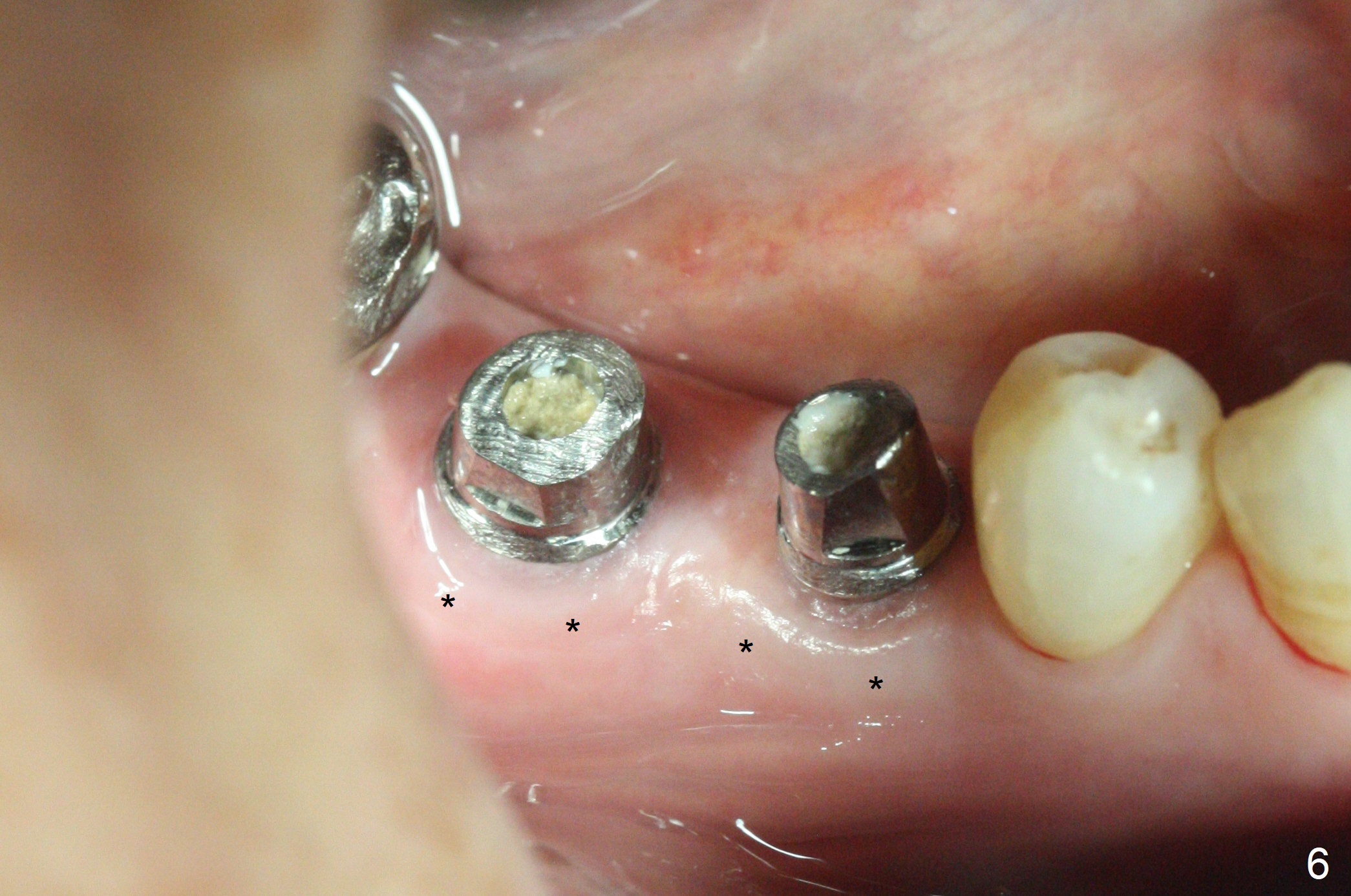 After incision, the ridge at #29 and 30 is found ~ 5 mm wide buccolingually. To place a 4x11 mm IBS implant at #30, the ridge is expanded using BEB technique (bone expansion and bending, Fig.1). It appears that the initial osteotomy at #29 is mesial (Fig.1 yellow dashed line: the distal surface of the root of the tooth #28). After moving the osteotomy distal, the final implant position at #29 (4x11 mm) is within normal limit (Fig.2). The bone at #29 seems to be not so dense that bending (using 1.6 mm drill) is not necessary (using Magic Split and Magic Expanders 3 and 3.8 mm). Later the implant at #30 (4x11 mm) is placed deeper (Fig.3). After placing bone graft around the implants/abutments and suturing, the ridge looks wider with apparent formation of the gingival bands around the abutments (Fig.4 *). Three months and a half postop, bone loss is minimal (Fig.5) and gingival bands forms around the abutments (Fig.6). Fig.7 is taken 1 month post cementation (panoramic X-ray). The patient chews normally 1 year (Fig.8) and nearly 2 years (Fig.9,10) post cementation. The crown at #31 needs recementation 2 years 7 months post #30 cementation; the incomplete seating of the abutment was noted for the first time (Fig.11). Five months later the patient is going to be retired and wants to travel abroad. After approval, the access hole was reopened; articulating paper shows under occlusion of the crown (Fig.12). Since the gap between the abutment and the implant is large, the abutment/crown complex seems to be necessary to be turned (Fig.13 curved arrow). The proximal surfaces of the crown need to be trimmed (straight lines). After turning, the crown sits down with screw tightening; the patient feels pain from the gingival cuff (Fig.14). After turning, the abutment appears to be completely seated (Fig.15). In fact the mesial and distal surfaces of the crown should have clearance from the neighboring teeth (Fig.14) so that pick-up impression is able to hold the crown/abutment complex securely (Fig.16: *). The crown is separated from the abutment after crown repair. They are seated together (loose connection) using the crown as a guide to seat the abutment. BW is taken without the crown. It appears that the abutment remains seated completely (Fig.17). The apical space is equal between #29 and 30 (Fig.17, as compared to Fig.5).