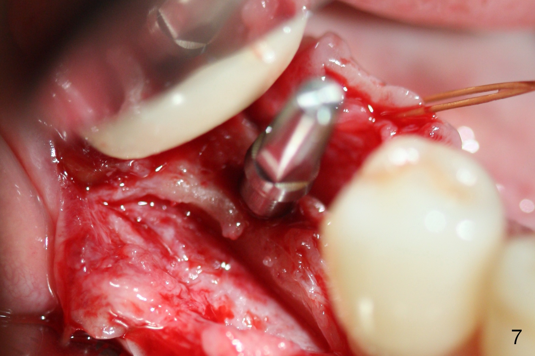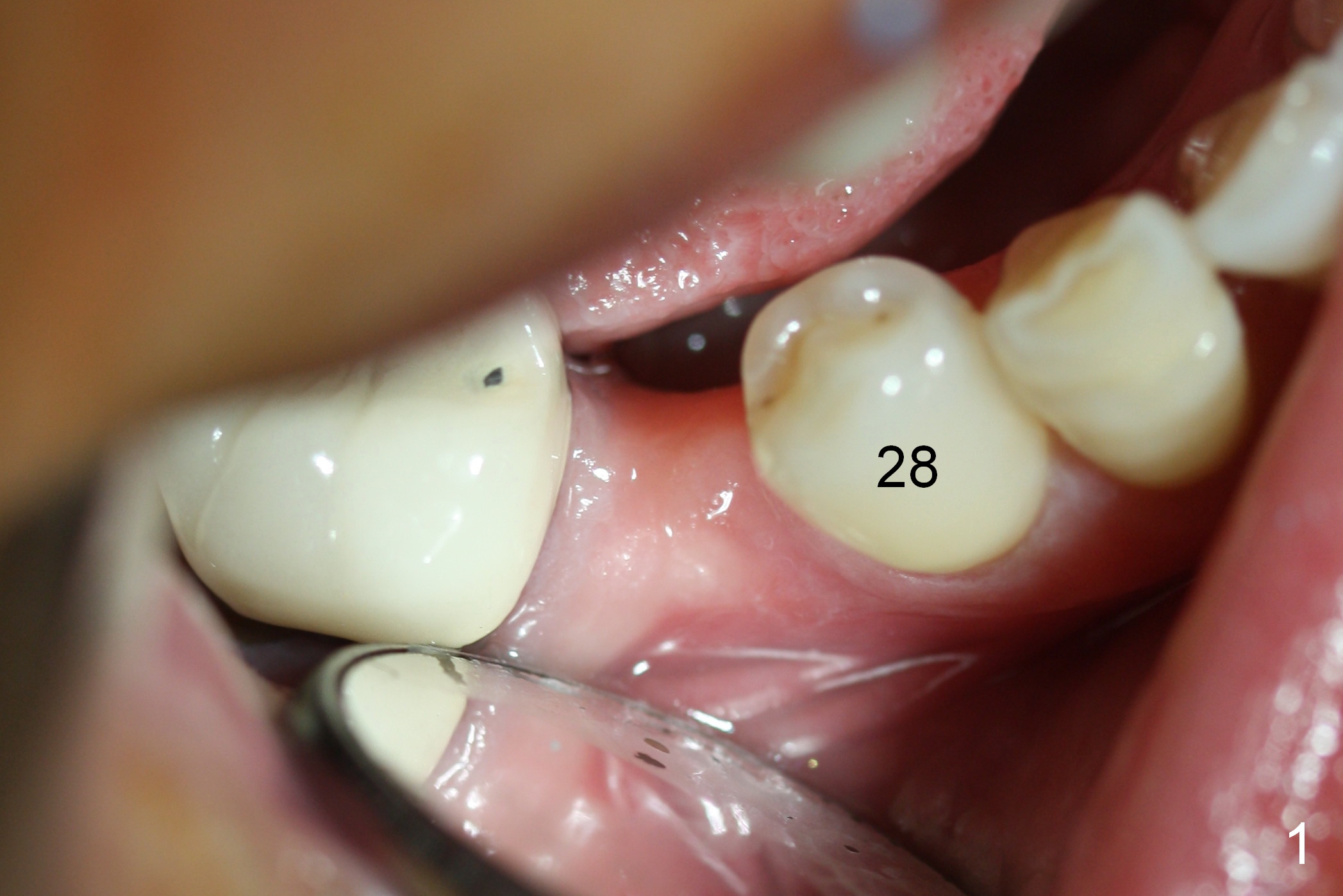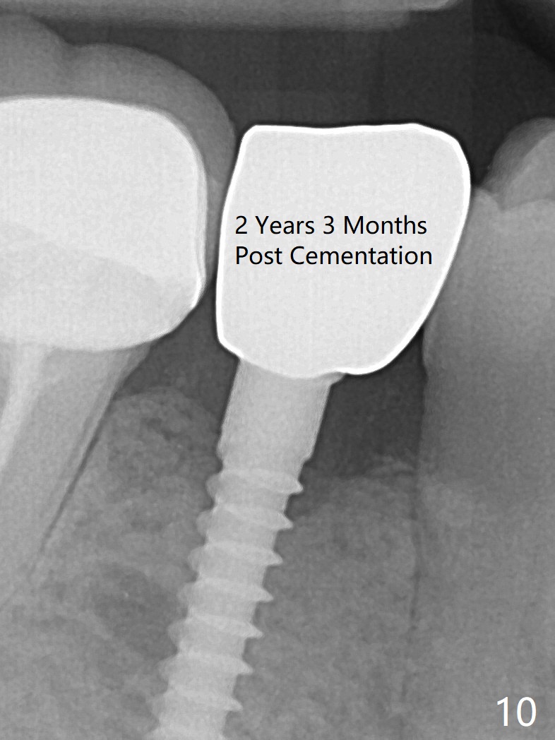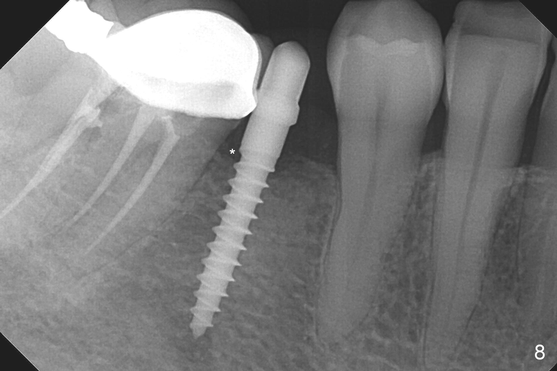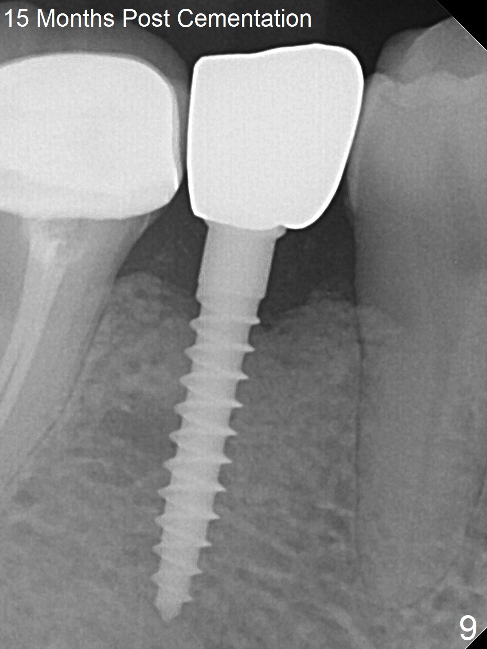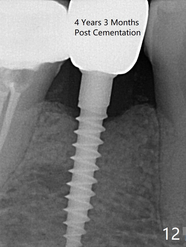 Preop photo shows the distal inclination of the tooth #28 (Fig.1). The distal surface of the latter is reduced before incision for implant placement at #29 (Fig.2). The buccolingual width is approximately 4 mm, as compared to 3 mm implant positioner (Fig.3). After 1.2x10 mm osteotomy (Fig.5), the mesiodistal cortical bone is removed with a small high-speed fissural bur (Fig.4). When a 2.5x12(2) mm 1-piece implant is placed (Fig.6), there is no buccal (Fig.7) or lingual plate perforation. There is no postop paresthesia. There is mild bone loss distal 4 months postop (Fig.8 *). Take photos before and after permanent crown cementation to show increase in ridge width after bone graft and improvement in gingival health after provisional modification. Take PA and/or BW post cementation to show that the distal bone resorption (Fig.8 *) is partially due to angulation. No continuous bone loss 15 months post cementation (Fig.9). There is mild bone resorption mesially 2 years 3 months post cementation (Fig.10). The soft and hard tissues remain healthy 4 years 3 months post cementation (Fig.11,12).