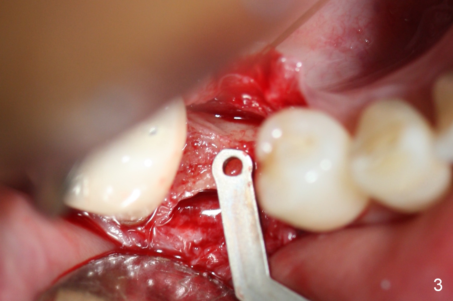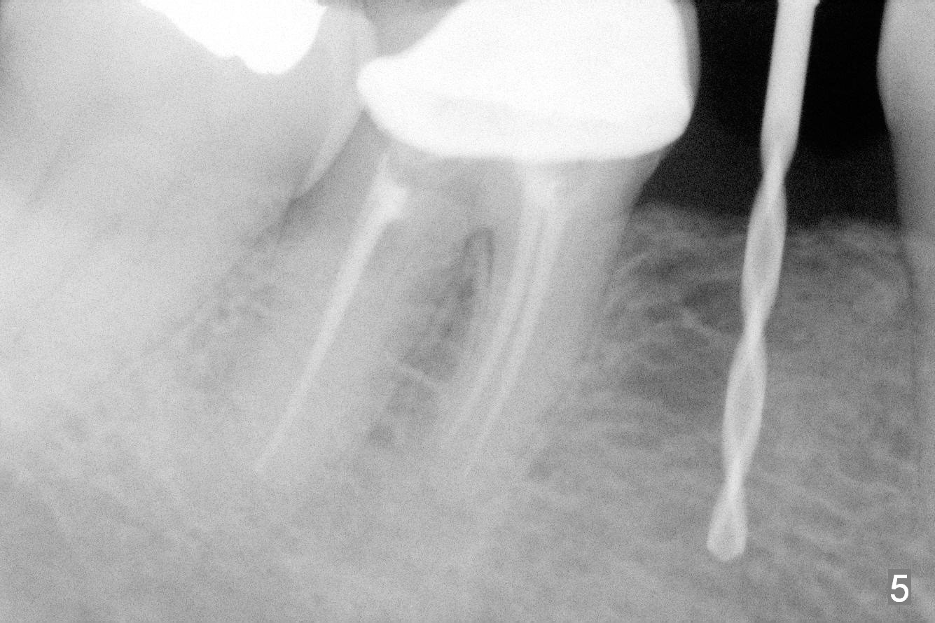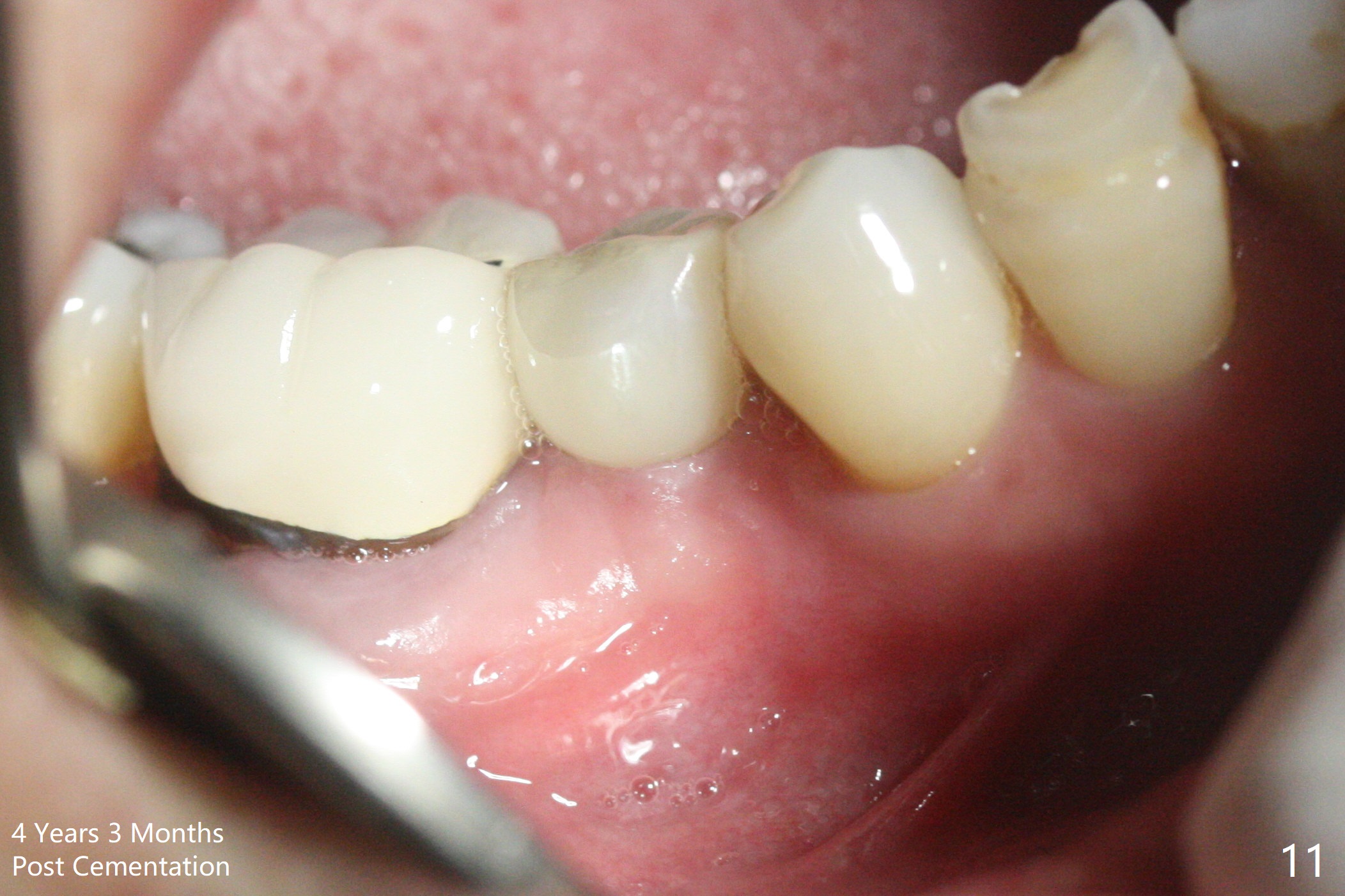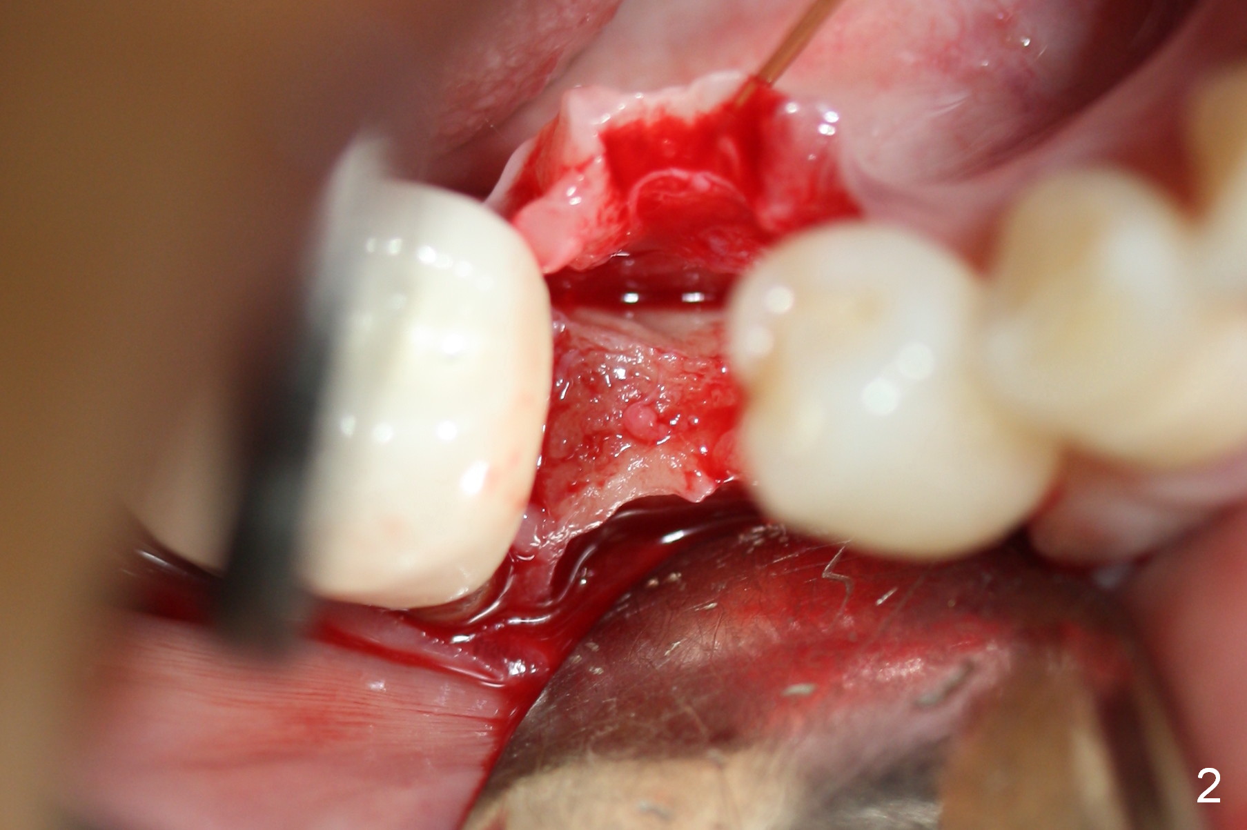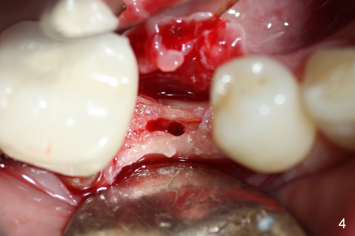 Preop photo shows the distal inclination of the tooth #28 (Fig.1). The distal surface of the latter is reduced before incision for implant placement at #29 (Fig.2). The buccolingual width is approximately 4 mm, as compared to 3 mm implant positioner (Fig.3). After 1.2x10 mm osteotomy (Fig.5), the mesiodistal cortical bone is removed with a small high-speed fissural bur (Fig.4). When a 2.5x12(2) mm 1-piece implant is placed (Fig.6), there is no buccal (Fig.7) or lingual plate perforation. There is no postop paresthesia. There is mild bone loss distal 4 months postop (Fig.8 *). Take photos before and after permanent crown cementation to show increase in ridge width after bone graft and improvement in gingival health after provisional modification. Take PA and/or BW post cementation to show that the distal bone resorption (Fig.8 *) is partially due to angulation. No continuous bone loss 15 months post cementation (Fig.9). There is mild bone resorption mesially 2 years 3 months post cementation (Fig.10). The soft and hard tissues remain healthy 4 years 3 months post cementation (Fig.11,12).