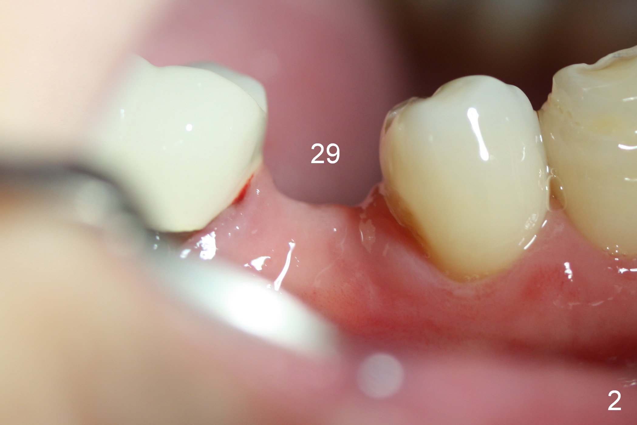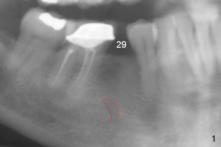 A 57-year-old woman will return for implant placement at #29, which has narrow space mesiodistally (Fig.1,2), buccolingually (Fig.3) and vertically (Fig.1, i.e., close to the Mental Loop (red outline)). Use a 2.5 or 3 mm tissue-punch from the 1-piece implant kit for access. After removal of the gingival tissue at the access, measure the tissue depth. To avoid complication associated with the narrow ridge, an incision approach appears more appropriate. The initial depth will be 12 mm using 1.2 mm drill and take PA.