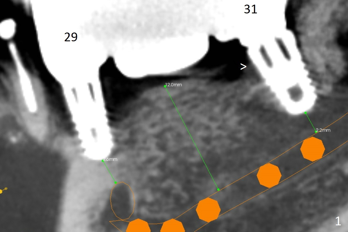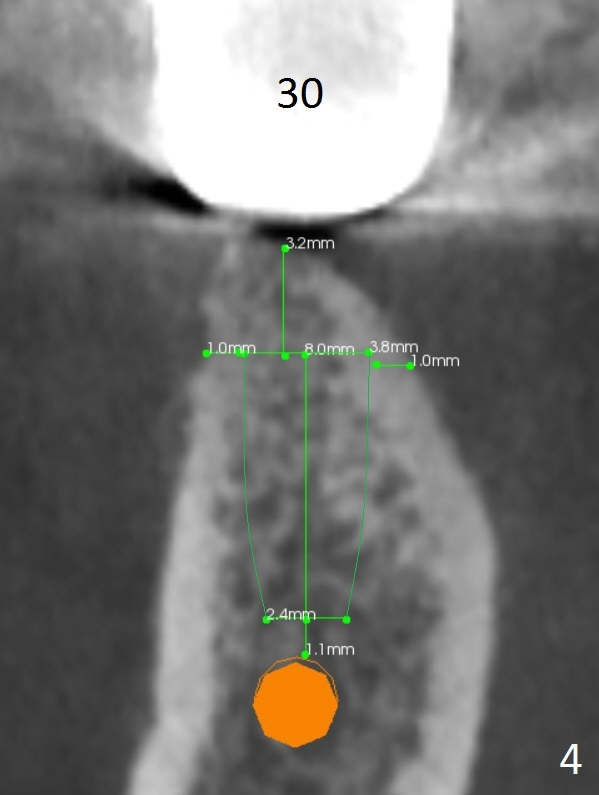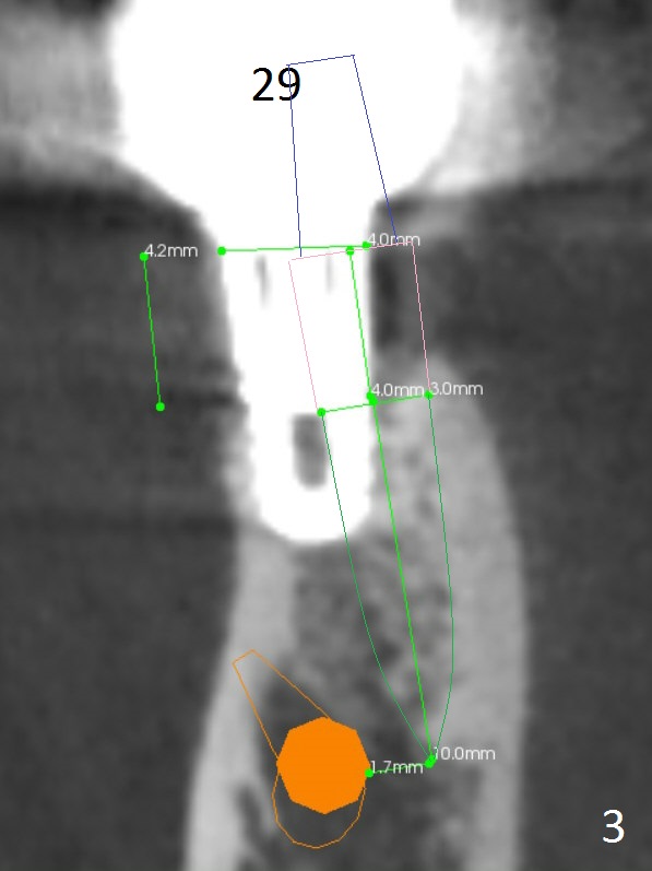 Immediately post implant removal at #29, a 3x10(4) mm 1-piece implant will be placed as lingual as possible (Fig.3). In fact the apical portion of the implant will be lingual to the Mental Loop (Fig.3 orange).
