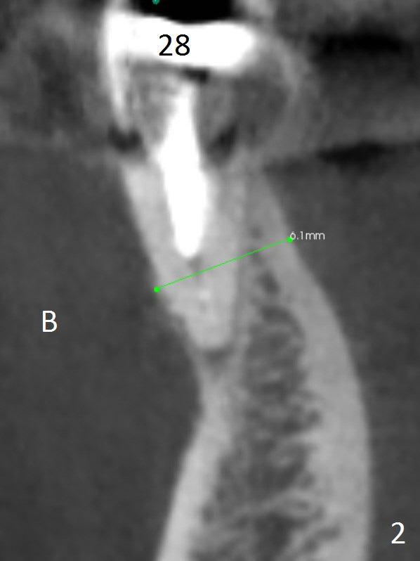 A 64-year-old woman has had sign of periimplantitis at #29 (Fig.1 (CBCT sagittatl section)) in the last 3 years. It appears that the implant is buccally and superficially placed (Fig.3 (coronal section)). Although RCT at #28 is incomplete (Fig.2), there is no symptom or sign of active infection; no treatment will be rendered.