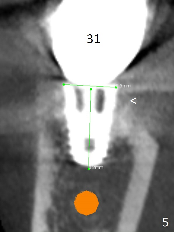 The mesial (Fig.1 >) and lingual (Fig.5 <) threads of the implant at #31 appear to be further bone graft to prevent periimplantitis.