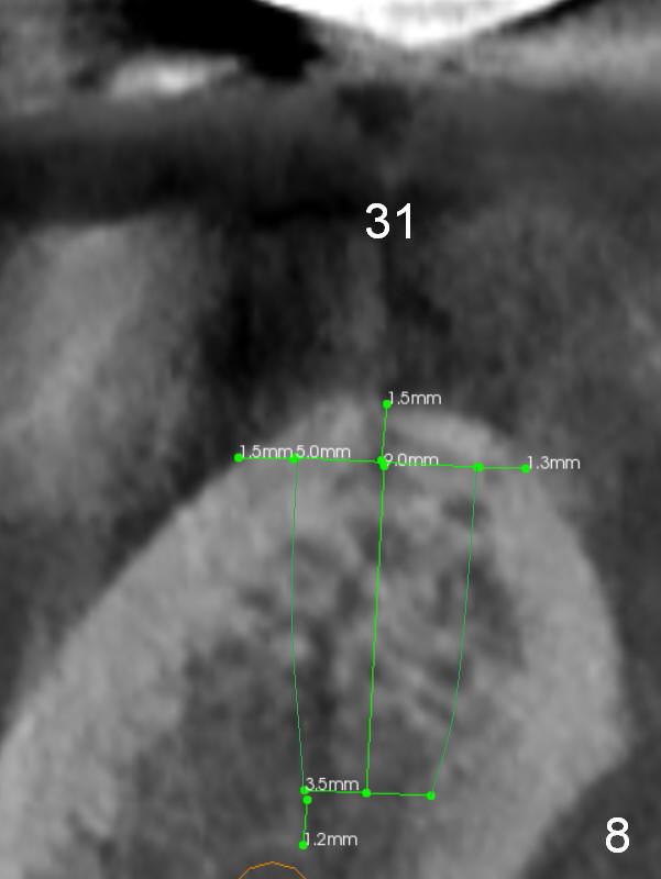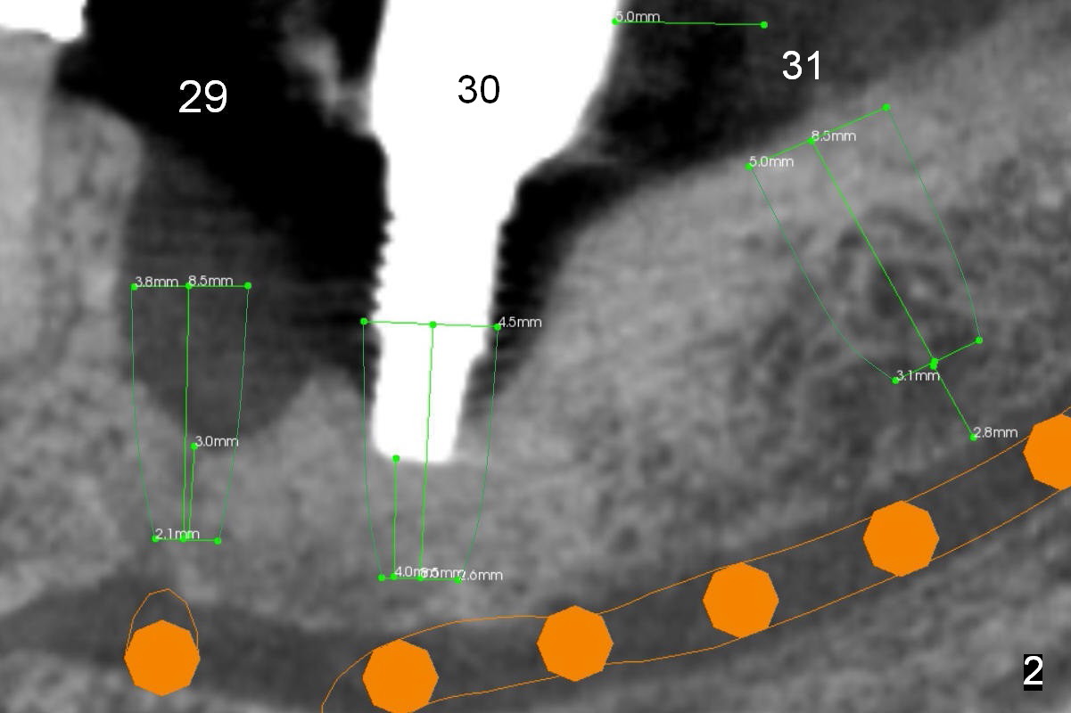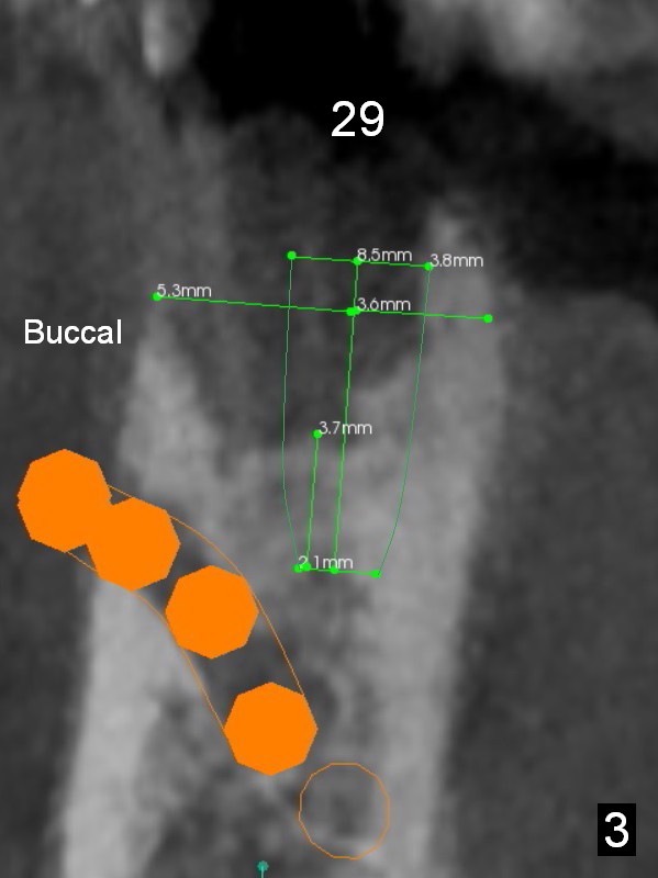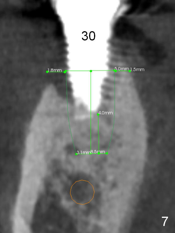 Since the buccal plate is lower at #30 (Fig.7), place a new implant as lingual as possible if the existing one is deemed nonsalvageable. To distribute occlusal load and increase longevity of the implants at #29 and 30, an implant should be placed at the same time or later (Fig.2,8). Approximately 1.5 years later (after #19 implant), the patient returns with intention to restore missing teeth #29-31. The implant at #30 has been lost. CT will be taken for guided surgery. Also take photos to show whether there is lack of the keratinized gingiva at the ridge, as it is related to guided surgery. If the tough gingiva is missing, incision instead of tissue punch should be done prior to osteotomy.