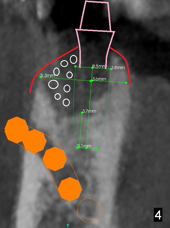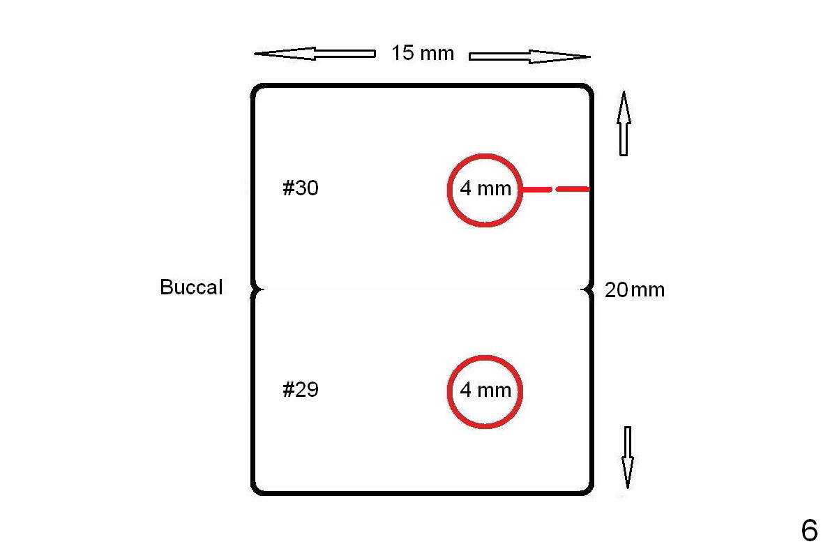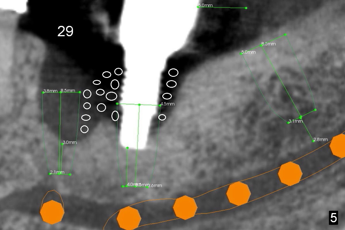 A 71-year-old man loses the implant at #29 five years post placement (Fig.1; 3 years post panoramic X-ray). The attached gingiva is nonexistent at #29 and 30. Gingival graft is necessary. The implant at #29 is placed as mesial (Fig.2) and lingual (Fig.5) as possible. If the implant at #30 is salvageable, place bone graft around the exposed implant threads (Fig.4,5 white circles). Cut a piece of 6-month collagen membrane, use a 4 mm tissue punch to punch 2 holes in the membrane (Fig.6 red circles) and cut open the hole for #30 lingually. Cover the membrane over the graft (Fig.5 red line), followed by PRF membranes (draw 5-6 tubes of blood).