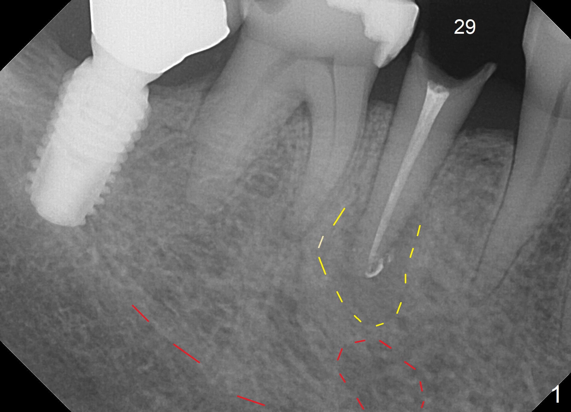 A 67-year-old woman fractures the tooth #29 three months post RCT. There is persistent periapical radio-lucency (Fig.1 yellow dashed line), which is close to the Mental Loop (red dashed line). Since the root of the affected tooth deviates distal, osteotomy will be established mesial (Fig.2). To reduce the chance to injury the buccally located loop, the osteotomy should be as lingual as possible. Initial depth will be 15 mm (shy of the Loop, bone level, 18-19 mm gingival level) with 2 mm drill, followed by the marked parallel pin. If primary stability cannot be achieved, place a long implant as indicated in Fig.2 as long as the osteotomy remains lingual.