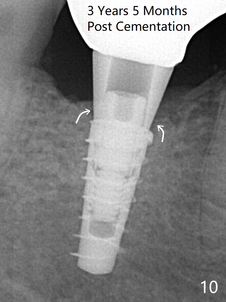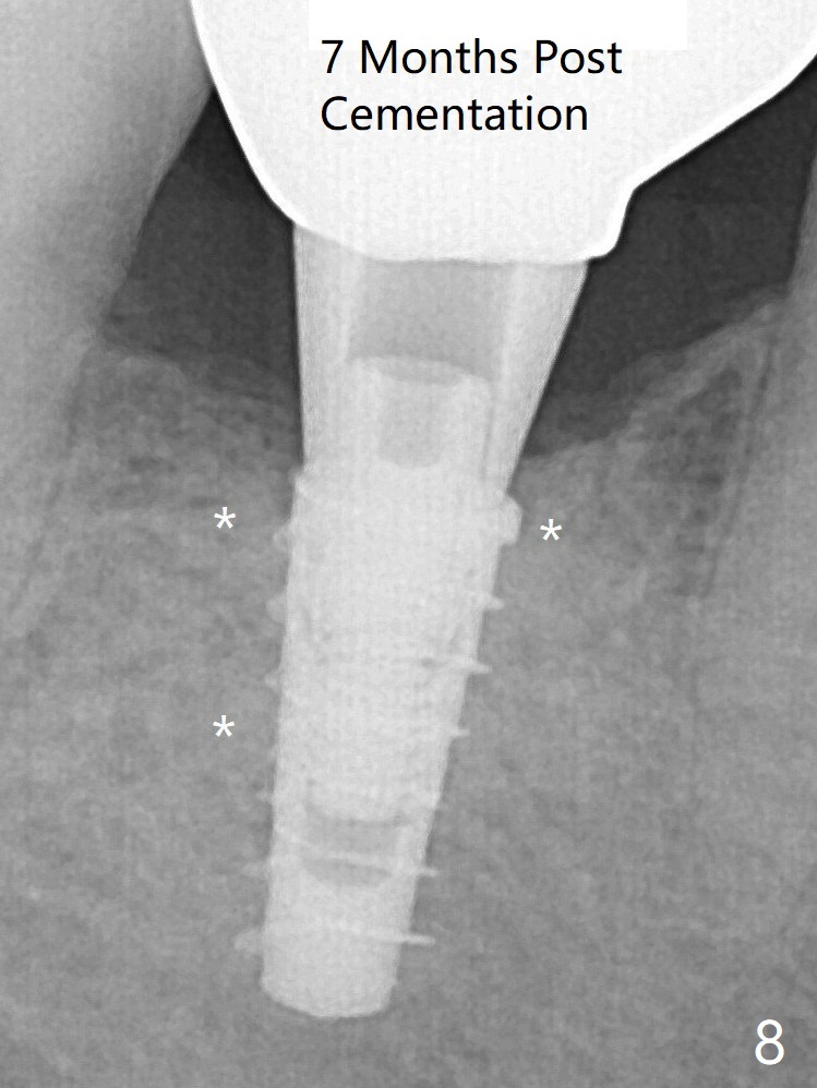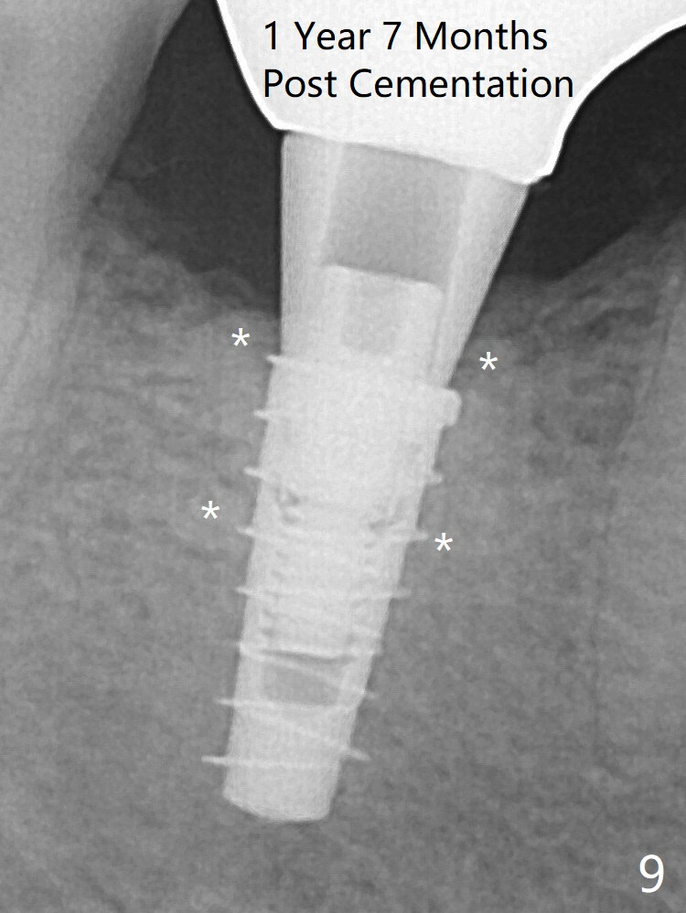 For safety, a 4x9 mm IBS implant is placed with insertion torque 40 Ncm; a 5x5.7(4) mm abutment is immediately placed for an immediate provisional to cover the large socket and keep Vera graft in place (Fig.4 *). Yellow dashed line: apical osteotomy; red dashed line: Mental Loop. Impression is taken nearly 3 months postop (Fig.6). The bone density around the implant increases 7 months post cementation (Fig.8 *). The higher density bone seems to extend coronally 1 year 7 months post cementation (Fig.9). The dense bone apparently extends toward the abutment as well 3 years 5 months post cementation (Fig.10 curved arrows).