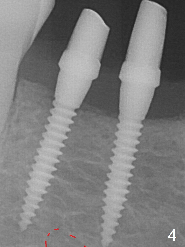 There is 1-2 mm separation from the Mental Nerve (red dashed line) when two of 2x10(2) mm 1-piece implants are placed (Fig.4). Insertion torques of the mesial and distal implants are less than 25 and 15 Ncm, respectively.