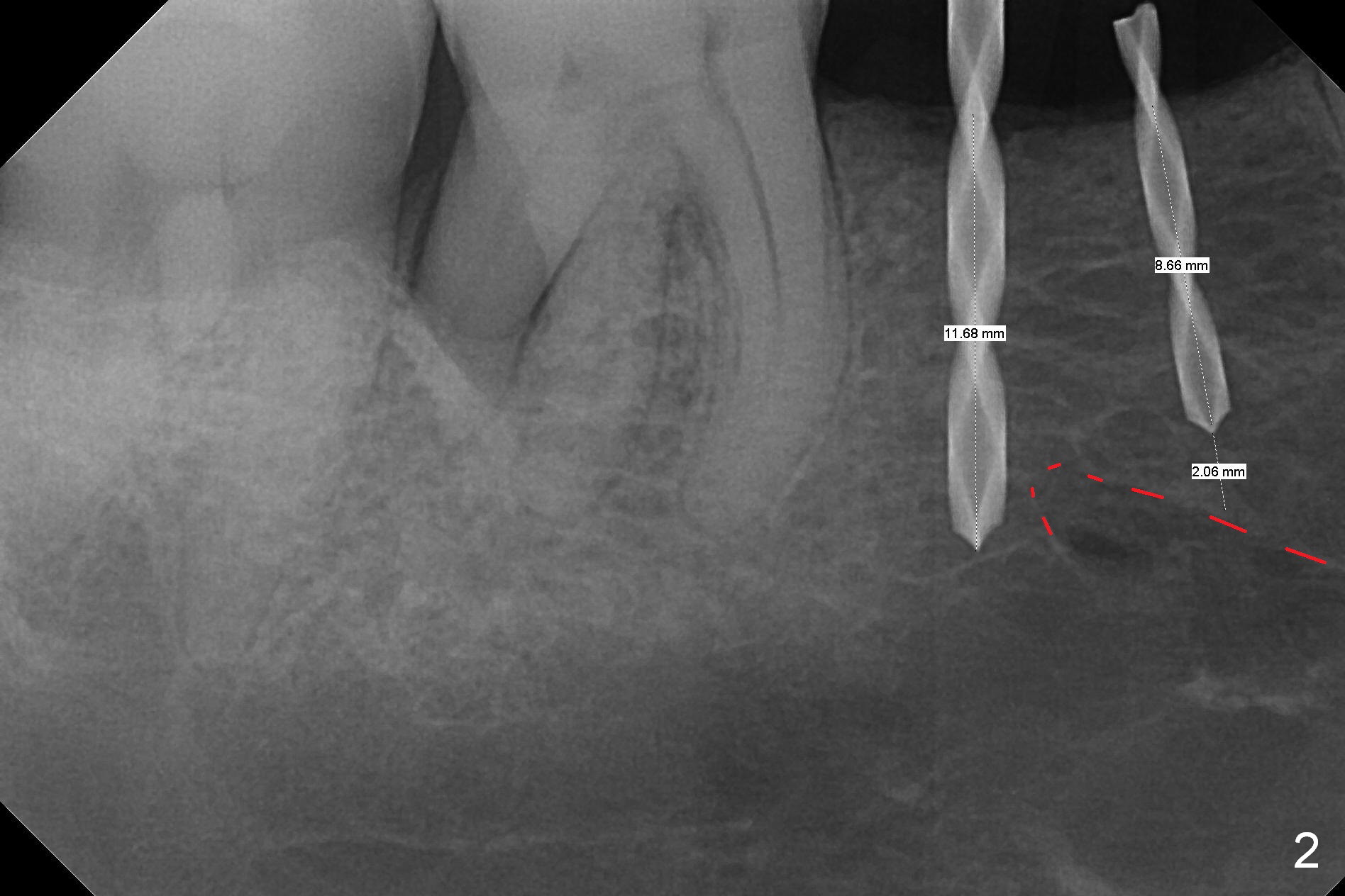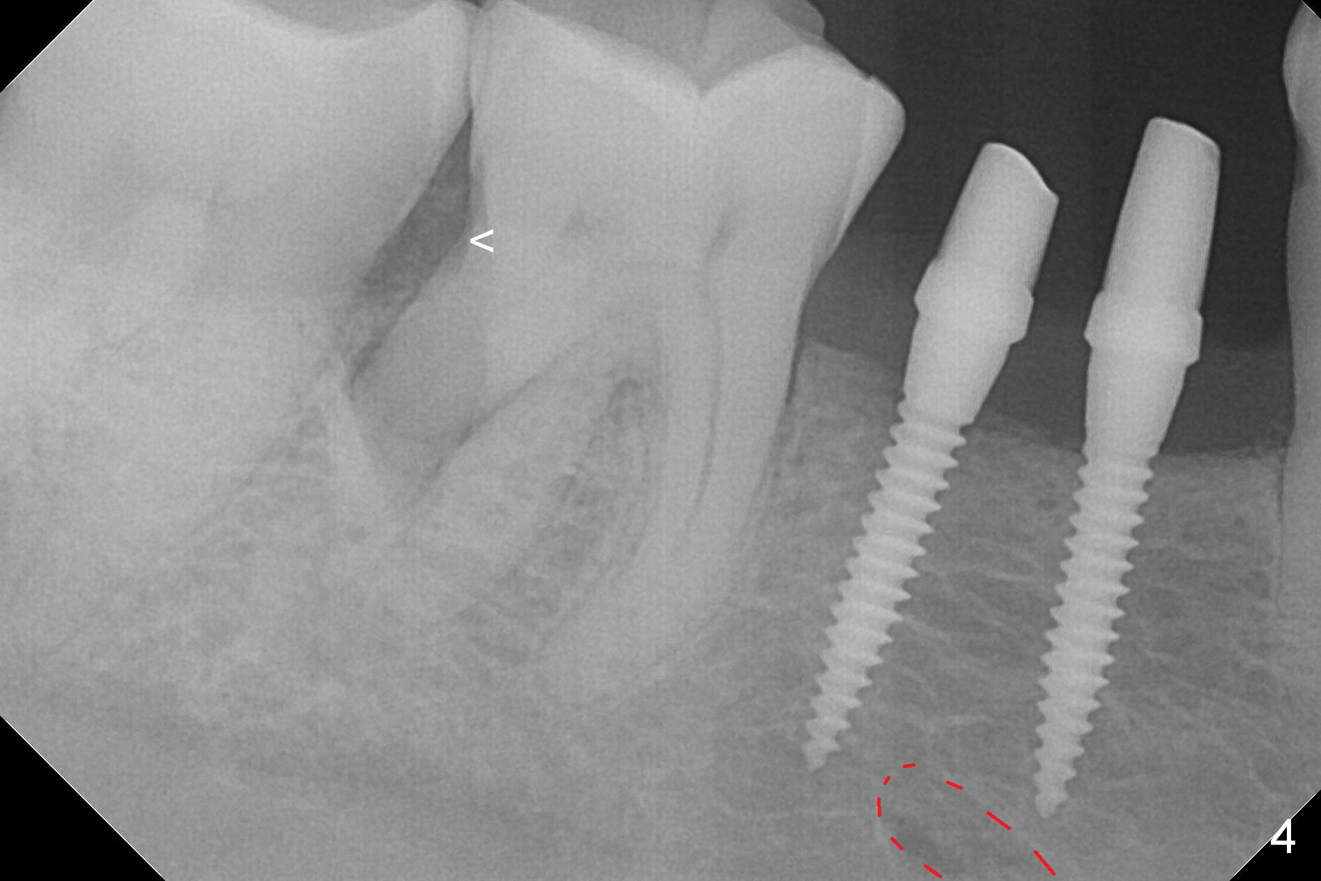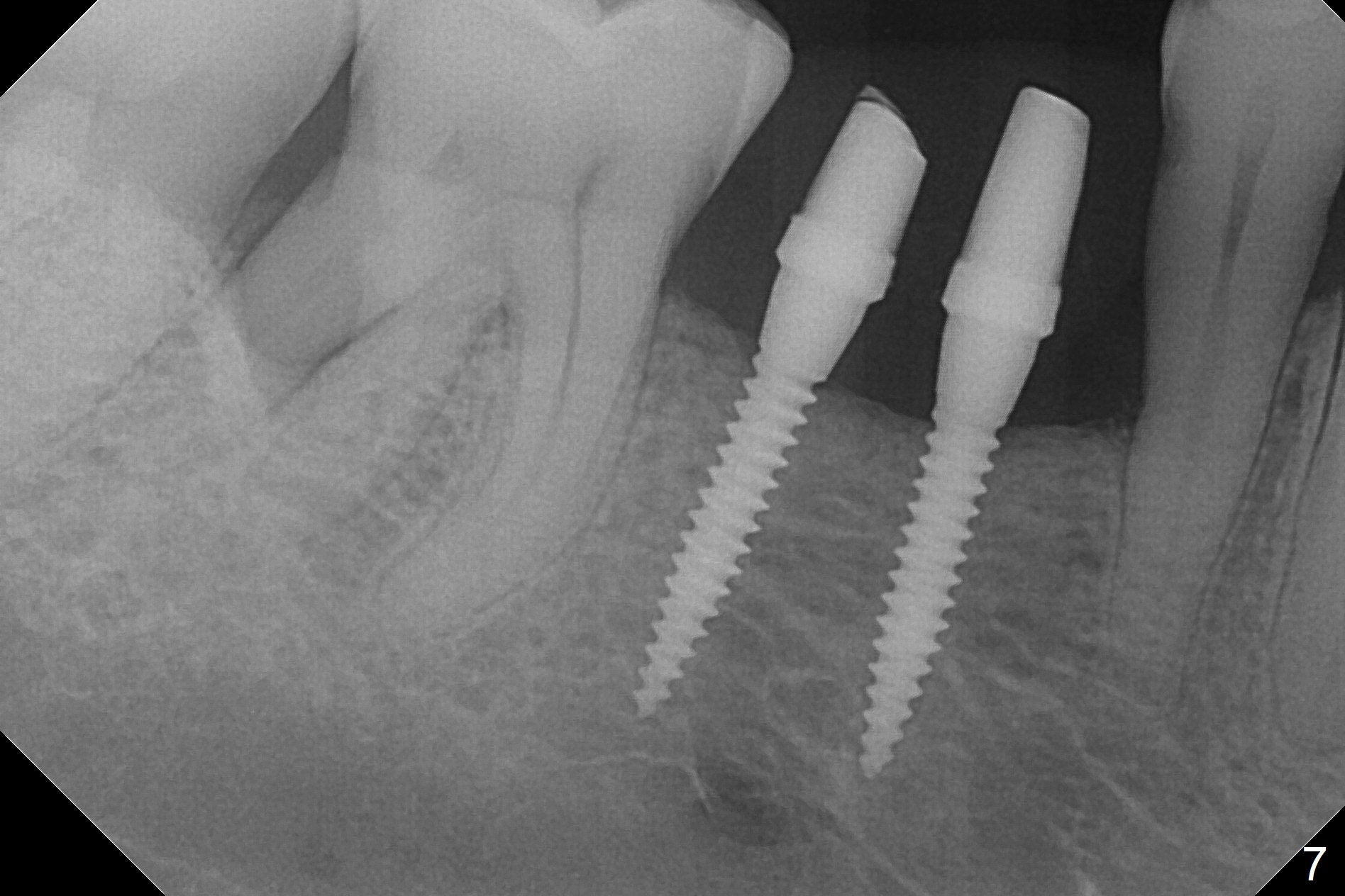 The wide mesiodistal space at #29 is most likely due to congenital missing permanent tooth (i.e., deciduous molar retention before extraction 34 years ago). The patient is now 62 years old. In fact the buccolingual width is not so narrow (Fig.1). After incision, the ridge is approximately 5 mm. Two osteotomies are established with 1.2 mm drill at 8 mm mesially and 1.5 mm one at 10 mm distally (Fig.2). The apparent approximation of the mesial osteotomy to the Mental Loop (red dashed line) is related to X-ray angulation, since there is 1-2 mm separation when two of 2x10(2) mm 1-piece implants are placed (Fig.3,4). Insertion torques of the mesial and distal implants are less than 25 and 15 Ncm, respectively. In fact bone graft is placed around the distolingual root of the tooth #30 after calculus removal (Fig.4 <). Following reduction of the abutments, periodontal dressing is applied locally. The dressing dislodged 13 days postop (Fig.5). A provisional is going to be fabricated 4 weeks postop when the wound heals (Fig.6). No bone loss is observed 4 months postop (Fig.7).