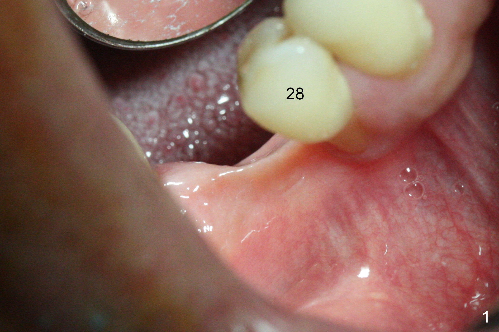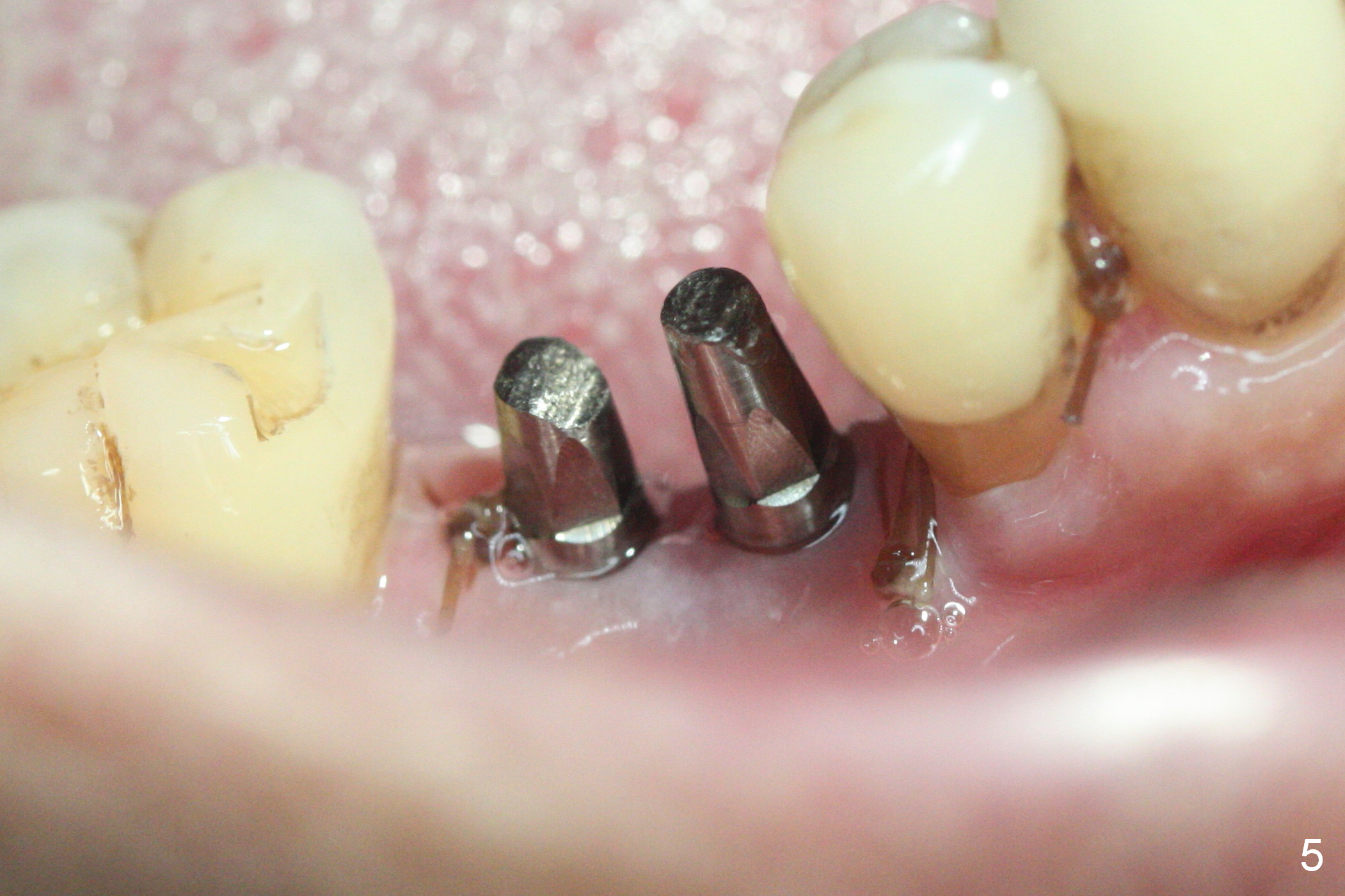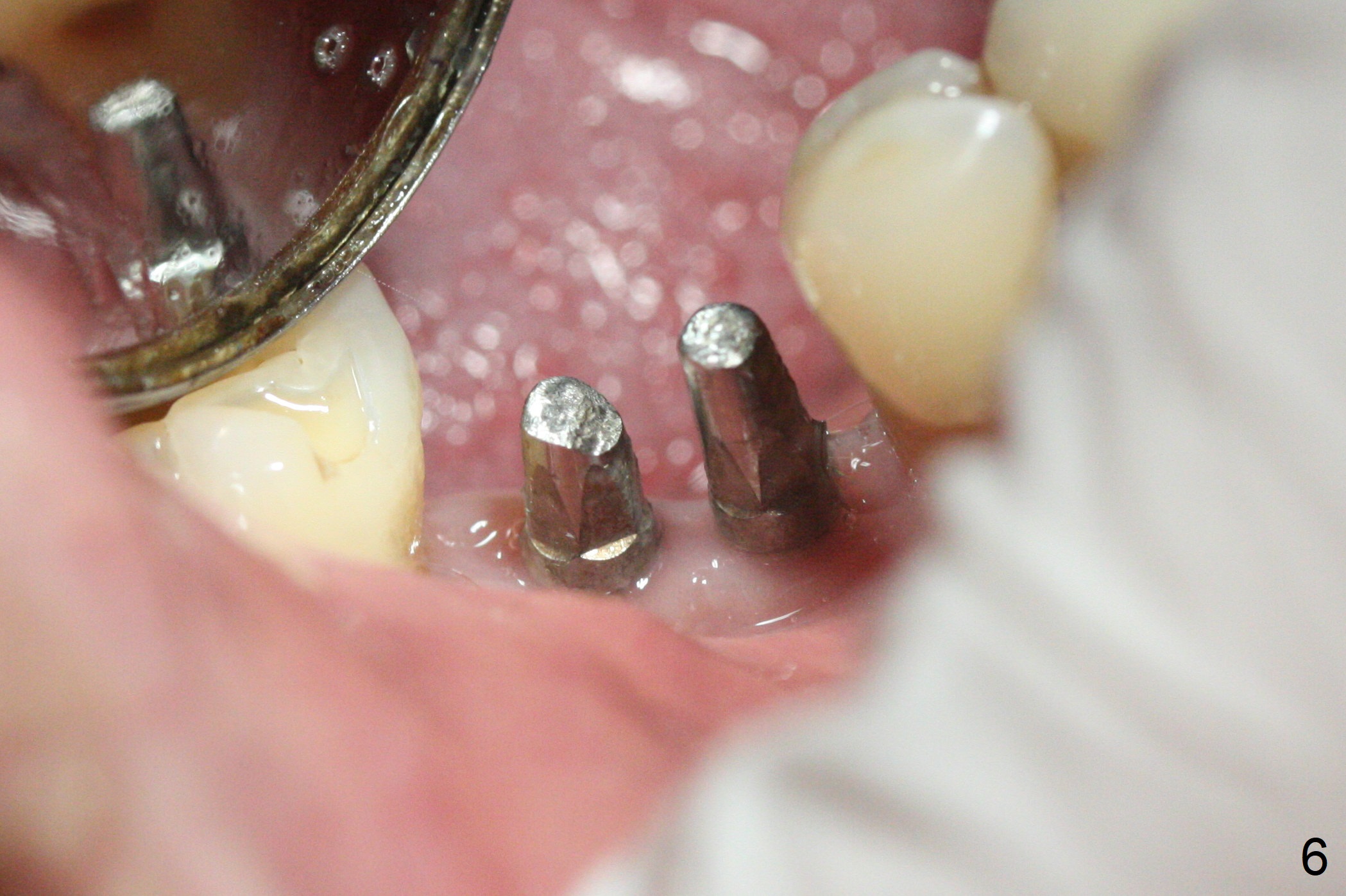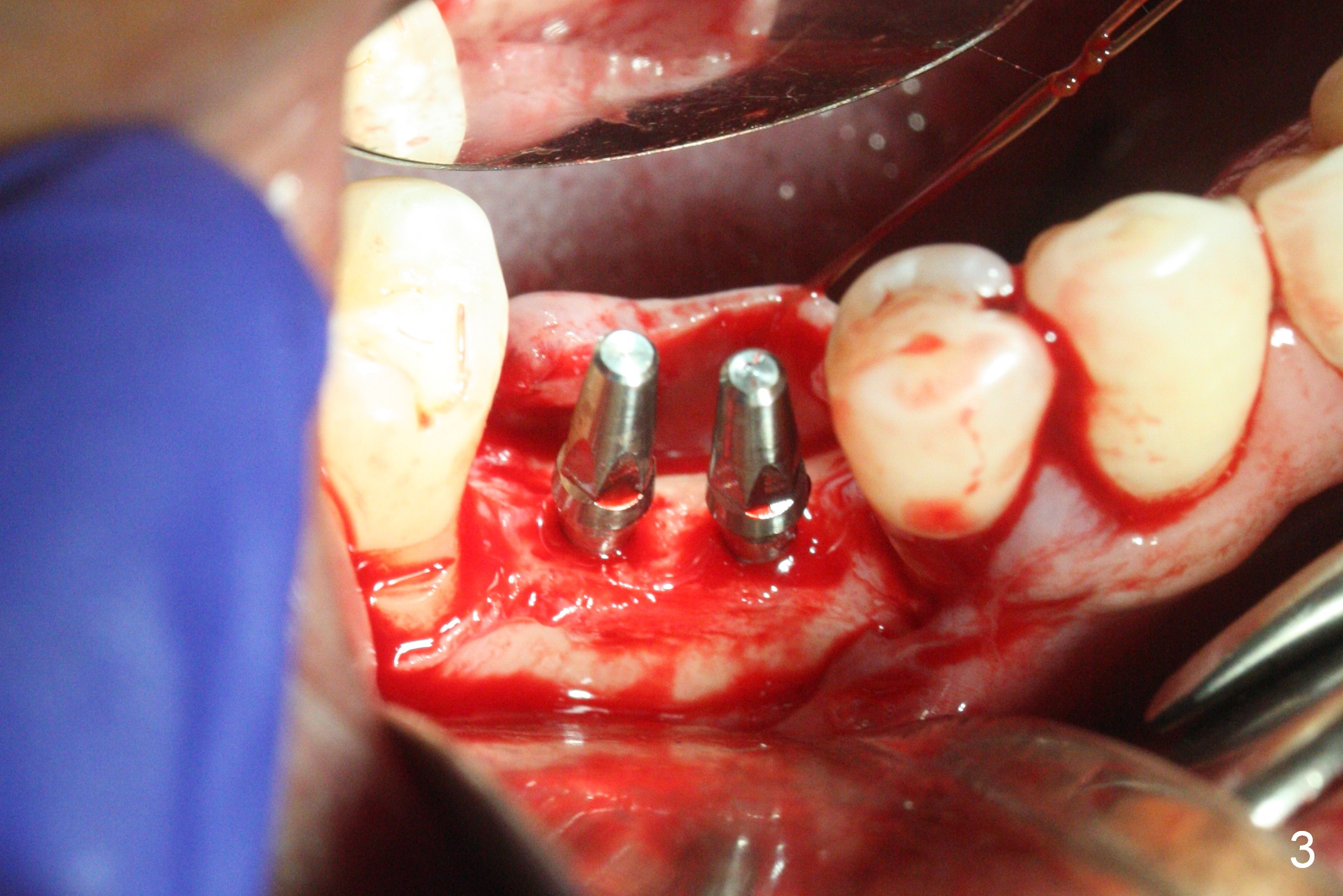 The wide mesiodistal space at #29 is most likely due to congenital missing permanent tooth (i.e., deciduous molar retention before extraction 34 years ago). The patient is now 62 years old. In fact the buccolingual width is not so narrow (Fig.1). After incision, the ridge is approximately 5 mm. Two osteotomies are established with 1.2 mm drill at 8 mm mesially and 1.5 mm one at 10 mm distally (Fig.2). The apparent approximation of the mesial osteotomy to the Mental Loop (red dashed line) is related to X-ray angulation, since there is 1-2 mm separation when two of 2x10(2) mm 1-piece implants are placed (Fig.3,4). Insertion torques of the mesial and distal implants are less than 25 and 15 Ncm, respectively. In fact bone graft is placed around the distolingual root of the tooth #30 after calculus removal (Fig.4 <). Following reduction of the abutments, periodontal dressing is applied locally. The dressing dislodged 13 days postop (Fig.5). A provisional is going to be fabricated 4 weeks postop when the wound heals (Fig.6). No bone loss is observed 4 months postop (Fig.7).