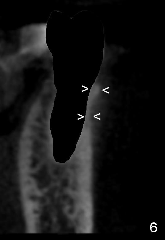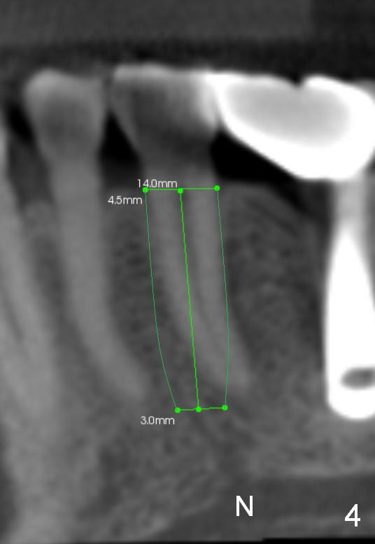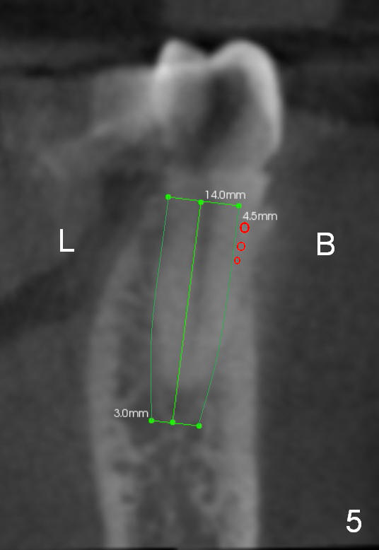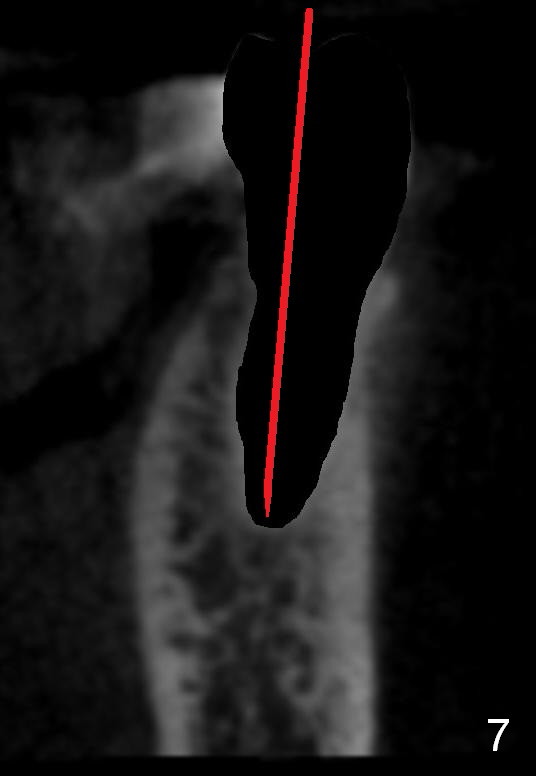 CT sagittal section of a similar case shows that the root is also long, but curved (Fig.4). A 4.5x14 mm implant is slightly longer than the root. The apex of the implant has distance to the underlying nerve (N). The coronal section shows that the implant should be placed lingually (Fig.5 L), since the buccal (B) plate is thin (Fig.6 between arrowheads). The first drill (2 mm) is to be placed lingually (Fig.7 red arrow). When the implant is placed, there should be a buccal gap, to be filled with bone graft (Fig.5 red circles).