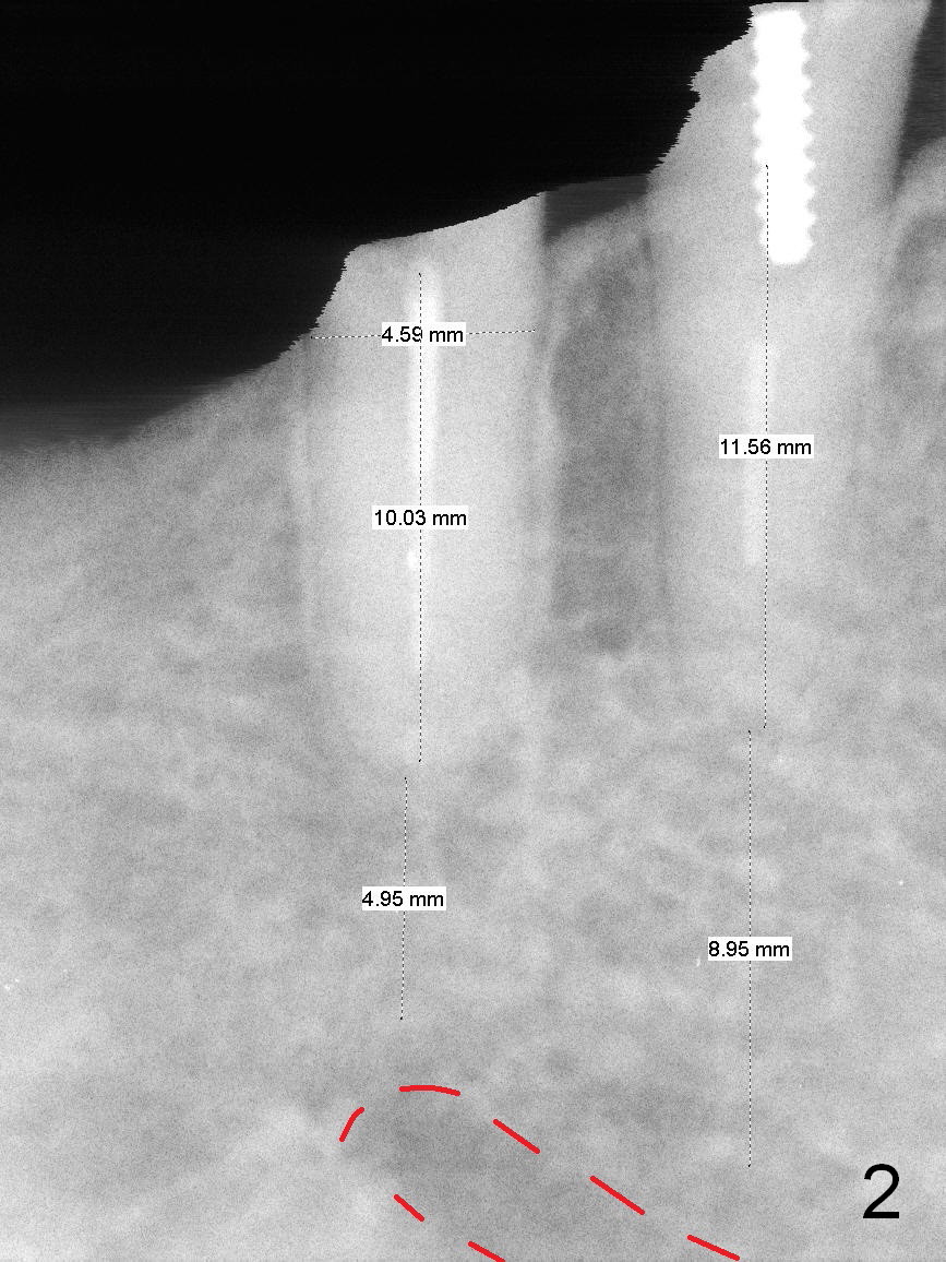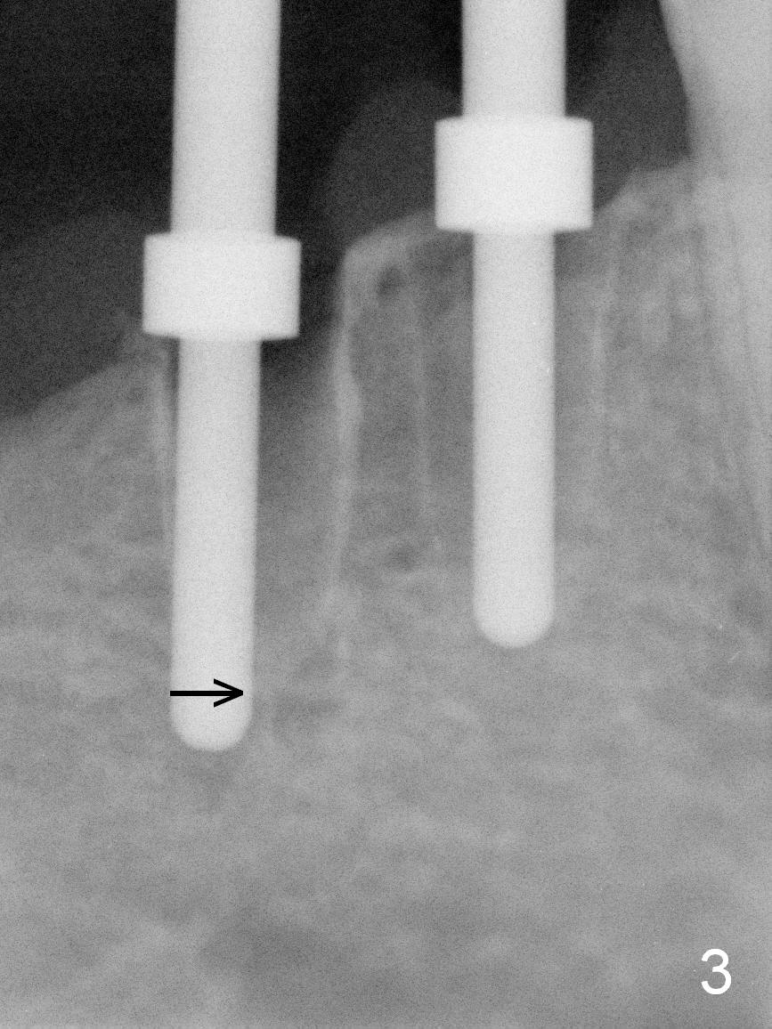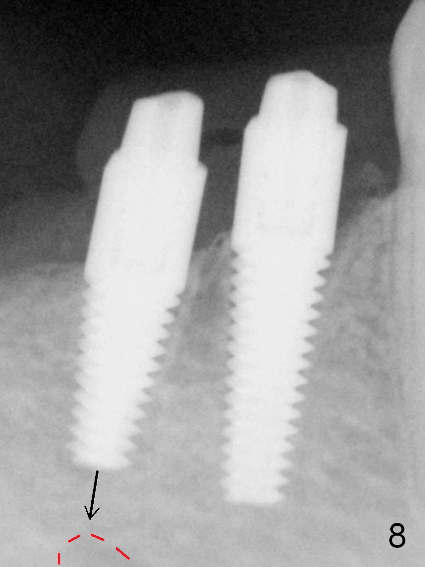 After restoring the implant at the site of #20, the patient returns for #28,29 implant placement (Fig.1,2). Bone level and distance from the Mental Loop (Fig.2 red dashed line) are different. It appears that longer implant can be placed at #28 than that at #29. Parallel pins are placed after initial osteotomy (Fig.3), it appears that the osteotomy at #29 should be moved mesially (arrow). Next PA shows that the position of the osteotomy at #29 is corrected (Fig.4). The position of the implants (4.5x17, 4.5x14 mm) appears ideal (Fig.5). After preparation for an immediate provisional, bone graft is placed in the remaining socket space (Fig.6 *). The splinted provisional is temporarily placed (Fig.7 P). The implant at #29 seems to be buccally placed. After CBCT confirmation, it should be removed for replacement. In addition to moving the osteotomy lingually, there is apparent space (~3 mm) to extend the osteotomy apcially for primary stability (Fig.8 arrow). The apical diameter of the implant is 3 mm.