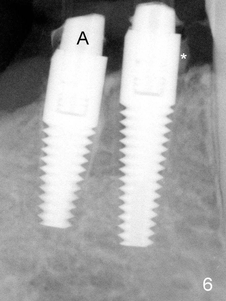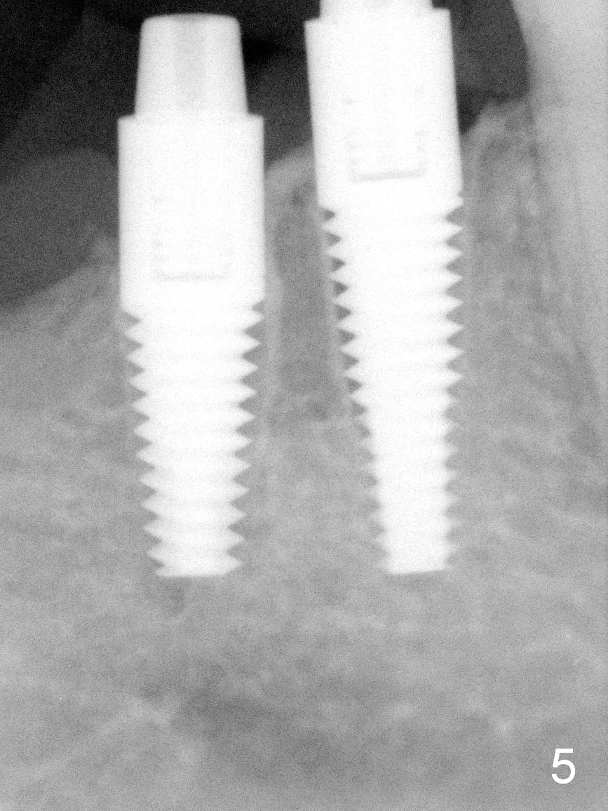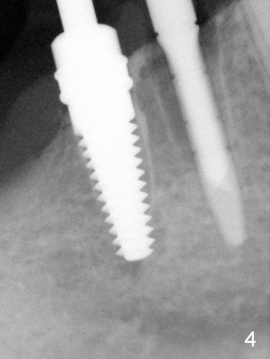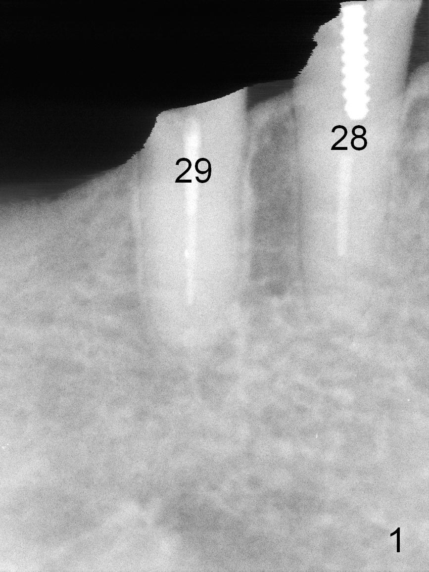 After restoring the implant at the site of #20, the patient returns for #28,29 implant placement (Fig.1,2). Bone level and distance from the Mental Loop (Fig.2 red dashed line) are different. It appears that longer implant can be placed at #28 than that at #29. Parallel pins are placed after initial osteotomy (Fig.3), it appears that the osteotomy at #29 should be moved mesially (arrow). Next PA shows that the position of the osteotomy at #29 is corrected (Fig.4). The position of the implants (4.5x17, 4.5x14 mm) appears ideal (Fig.5). After preparation for an immediate provisional, bone graft is placed in the remaining socket space (Fig.6 *). The splinted provisional is temporarily placed (Fig.7 P). The implant at #29 seems to be buccally placed. After CBCT confirmation, it should be removed for replacement. In addition to moving the osteotomy lingually, there is apparent space (~3 mm) to extend the osteotomy apcially for primary stability (Fig.8 arrow). The apical diameter of the implant is 3 mm.