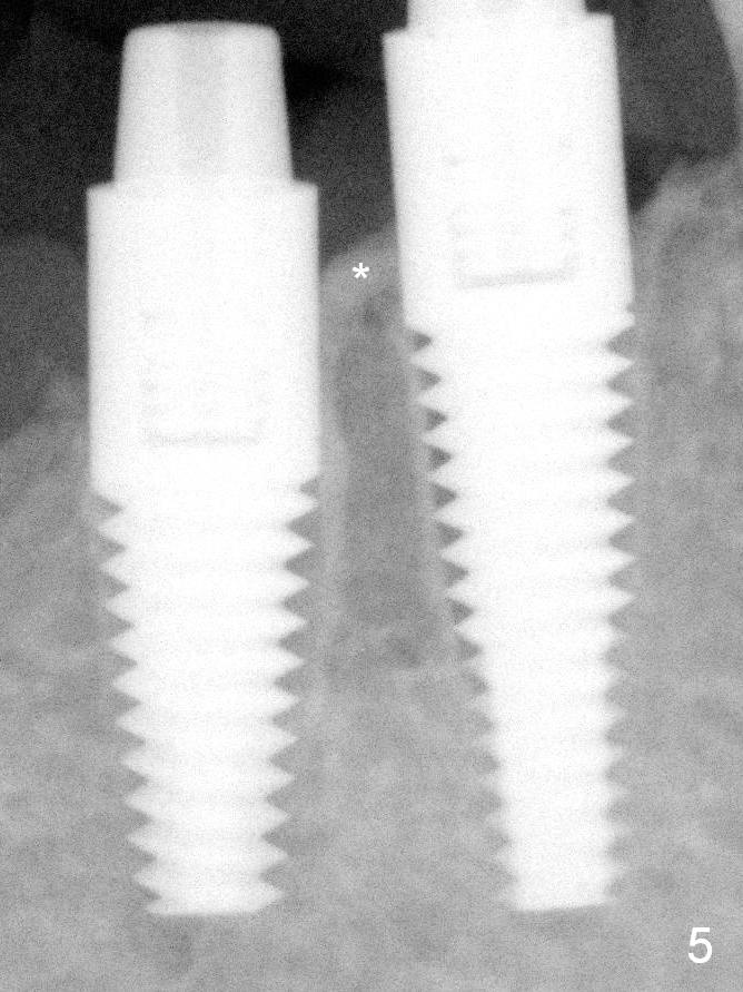 Fig.5: Immediately post 1st placement. *: crest between the adjacent implants (4.5x14, 4.5x17 mm).