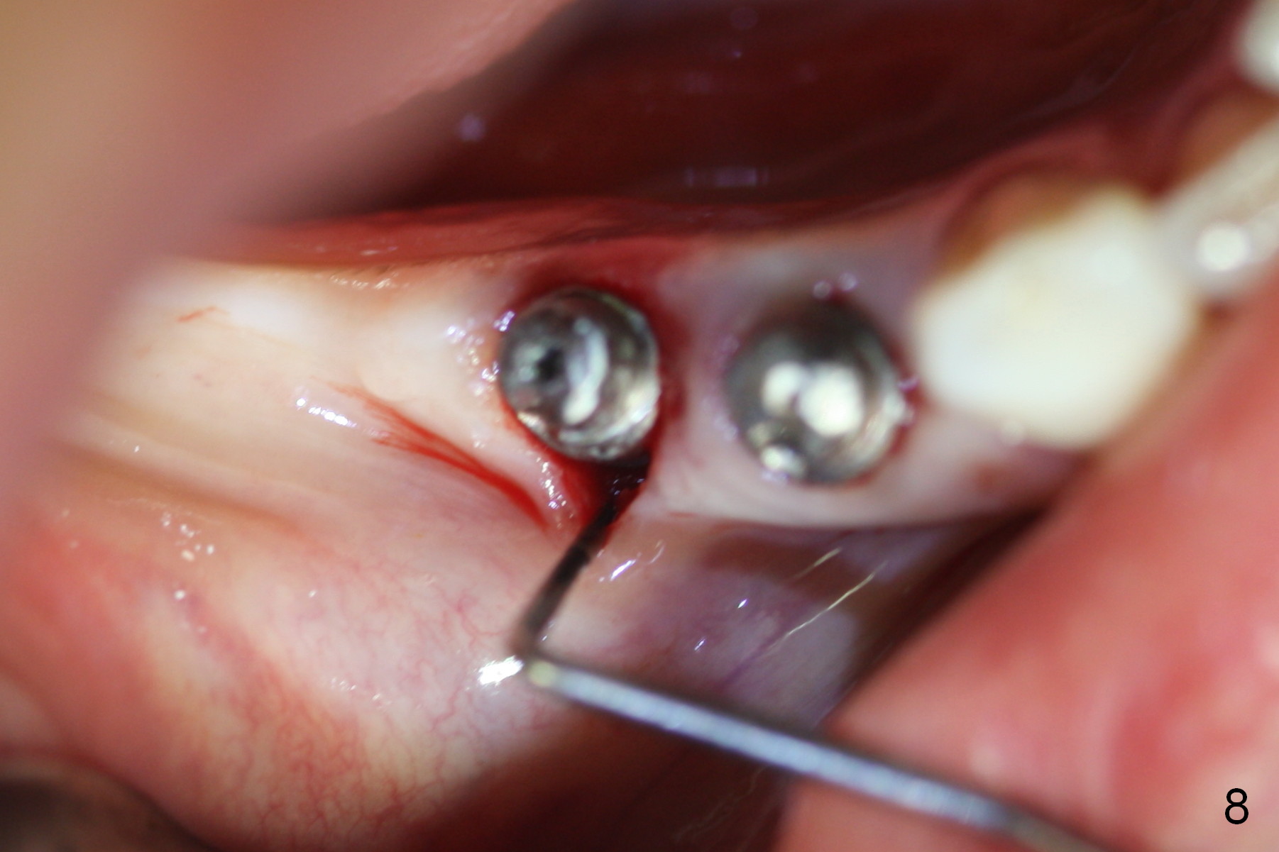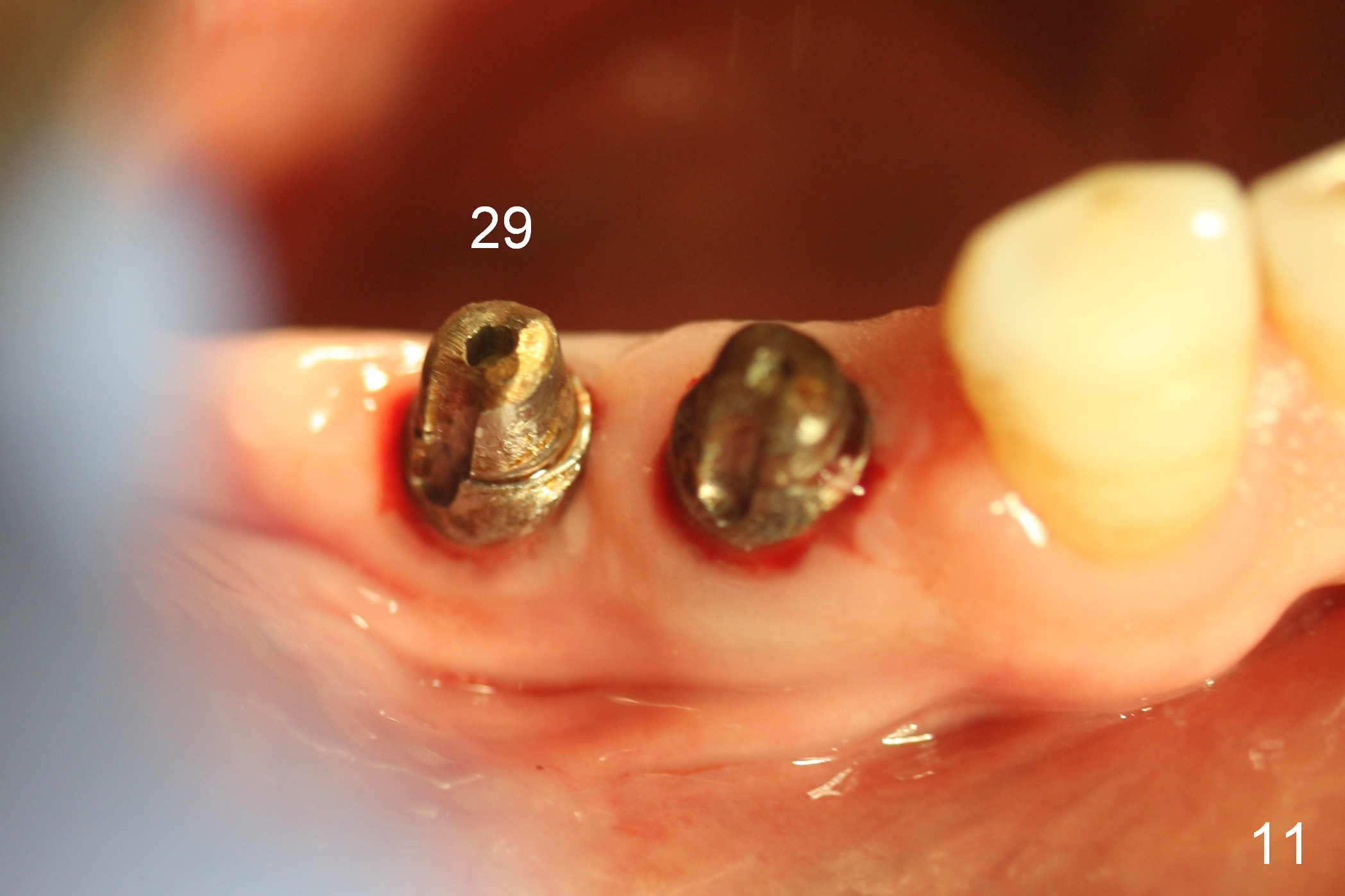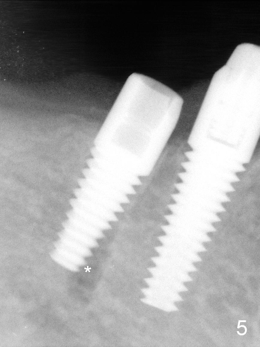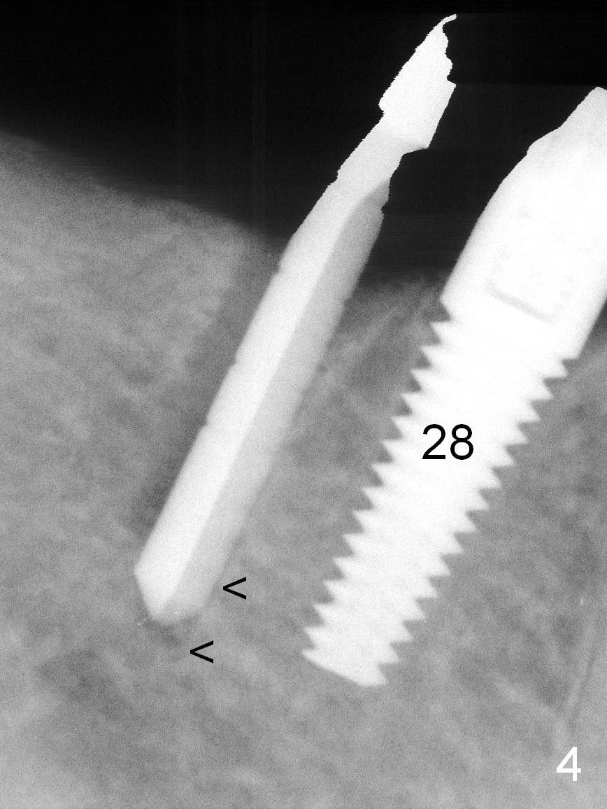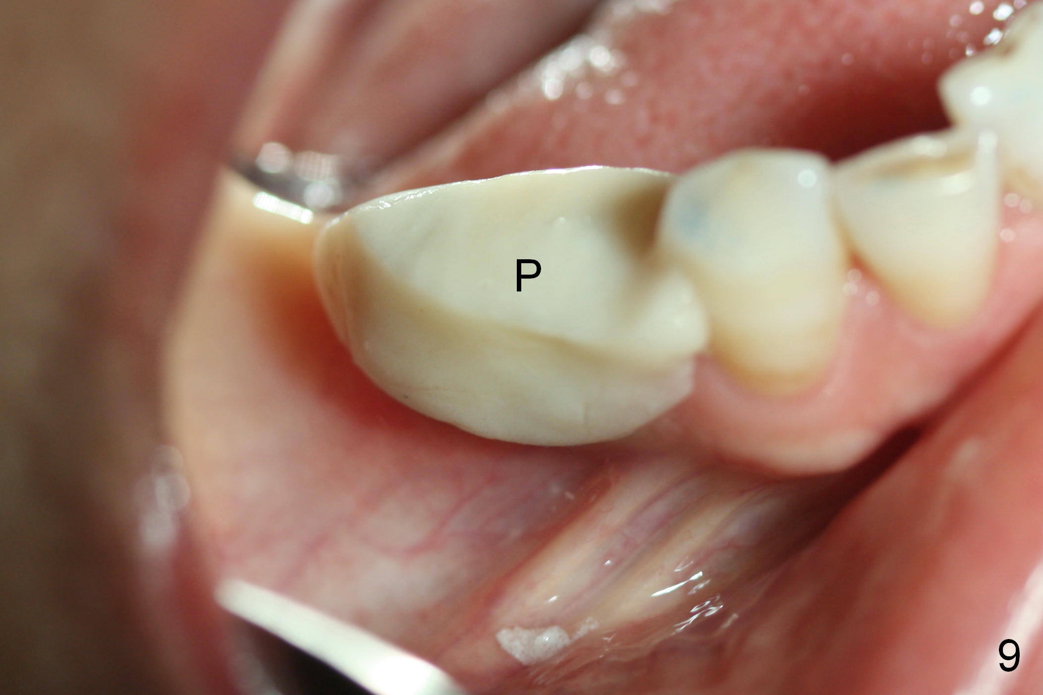 The patient complains of discomfort in mastication on the right. The position of the crowns at #28,29 seems to be normal (Fig.1). It is obvious that the implant/abutment at #29 is buccal (Fig.2 >) when the crown is removed. It remains so when the crown at #28 is removed (Fig.3). It is easy to un-torque the implant at #29. A Lindamann bur is used to remove ~ 2 mm of the lingual bone. A new osteotomy is initiated in the mesiolingual aspect (Fig.4 between arrowheads (<)). After osteotomy is finished with a 3.5x14 mm drill (underprep), the same implant is placed; it happens to be deviated from the new osteotomy (Fig.5 (*). After removal of the implant, the osteotomy is enlarged with a 4.0x14 mm drill and the implant is placed in a correct trajectory (Fig.6 (>: "old" osteotomy)) and position (Fig.7). The buccal gap is approximately 1 mm (Fig.8), where a small amount of autogenous bone is placed. A splinted provisional is fabricated at #28 and 29 to keep the graft in place (Fig.9 P).