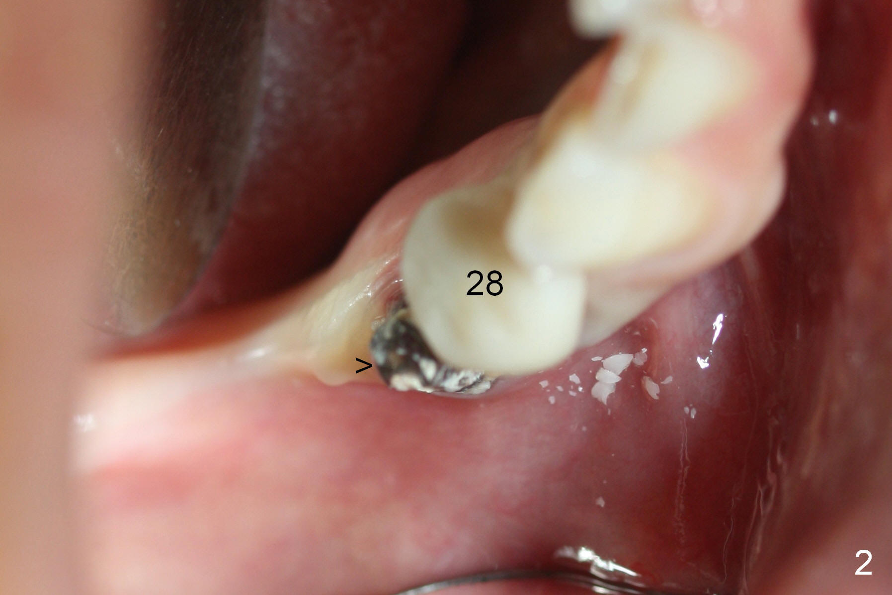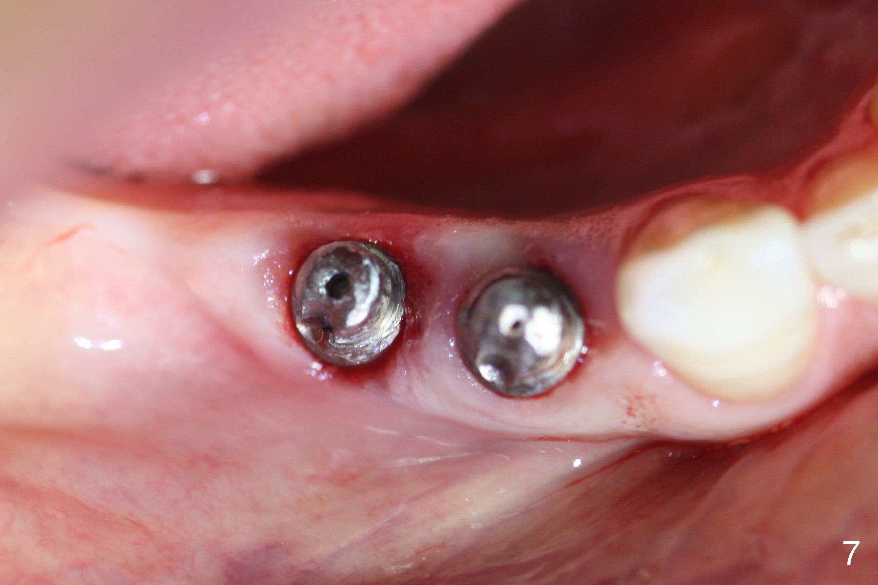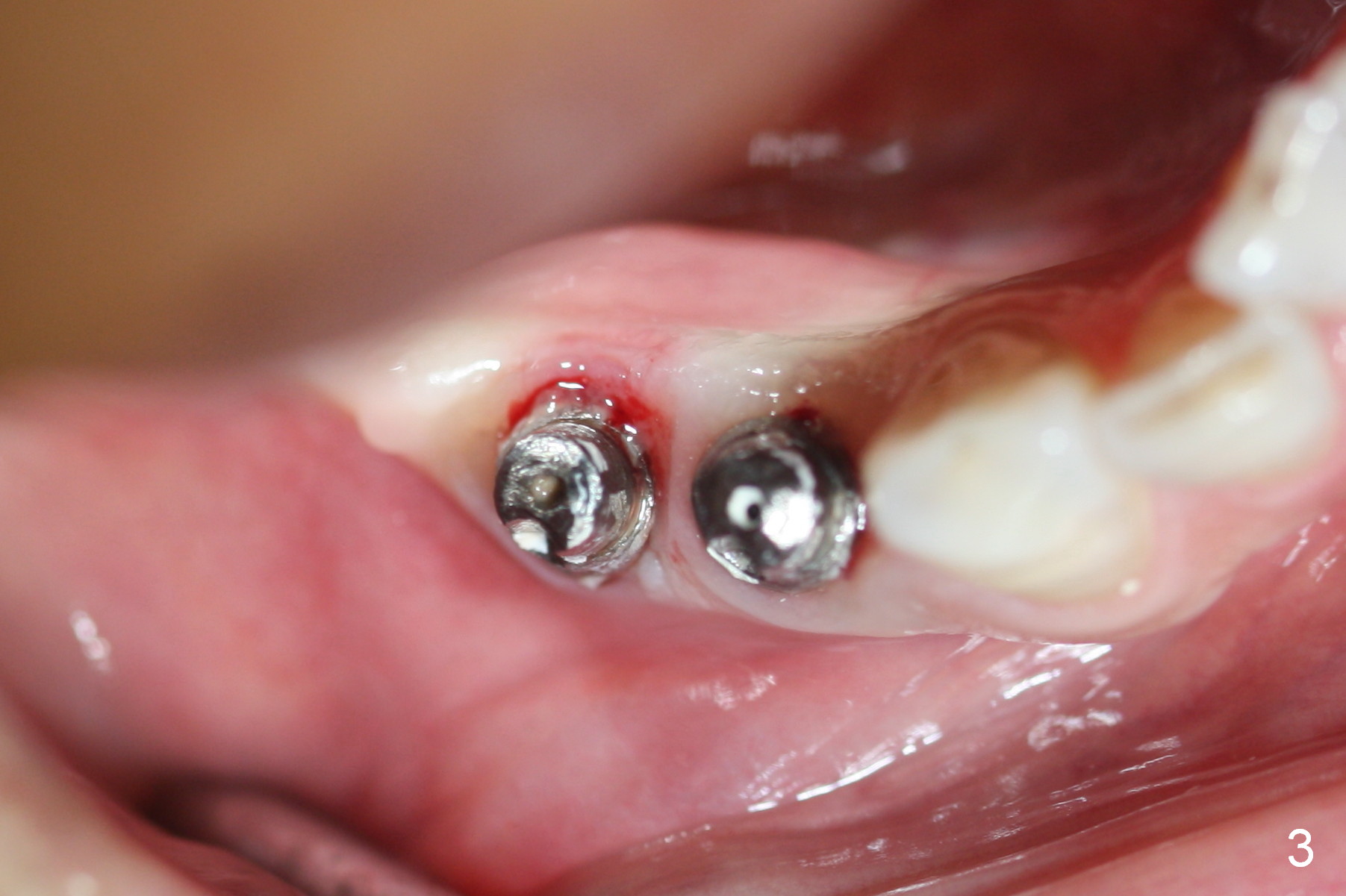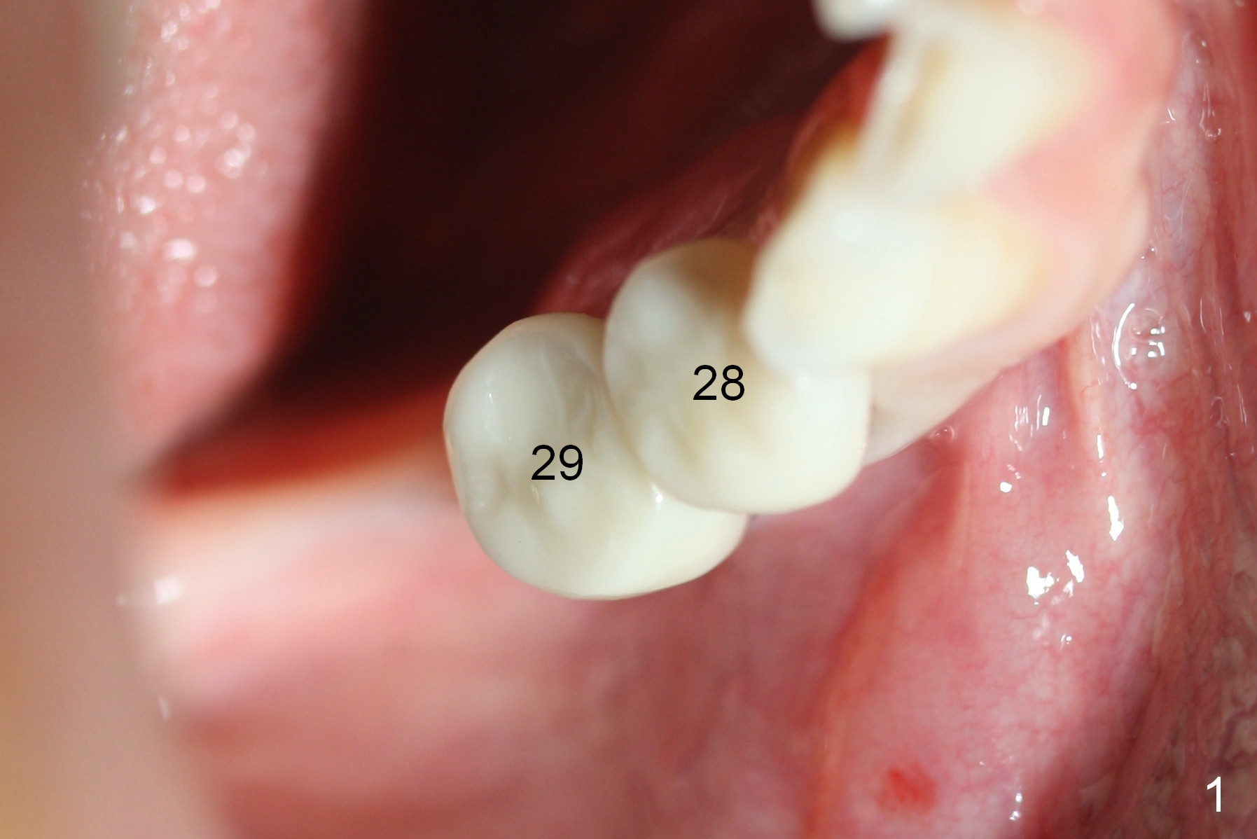 The patient complains of discomfort in mastication on the right. The position of the crowns at #28,29 seems to be normal (Fig.1). It is obvious that the implant/abutment at #29 is buccal (Fig.2 >) when the crown is removed. It remains so when the crown at #28 is removed (Fig.3). It is easy to un-torque the implant at #29. A Lindamann bur is used to remove ~ 2 mm of the lingual bone. A new osteotomy is initiated in the mesiolingual aspect (Fig.4 between arrowheads (<)). After osteotomy is finished with a 3.5x14 mm drill (underprep), the same implant is placed; it happens to be deviated from the new osteotomy (Fig.5 (*). After removal of the implant, the osteotomy is enlarged with a 4.0x14 mm drill and the implant is placed in a correct trajectory (Fig.6 (>: "old" osteotomy)) and position (Fig.7). The buccal gap is approximately 1 mm (Fig.8), where a small amount of autogenous bone is placed. A splinted provisional is fabricated at #28 and 29 to keep the graft in place (Fig.9 P).