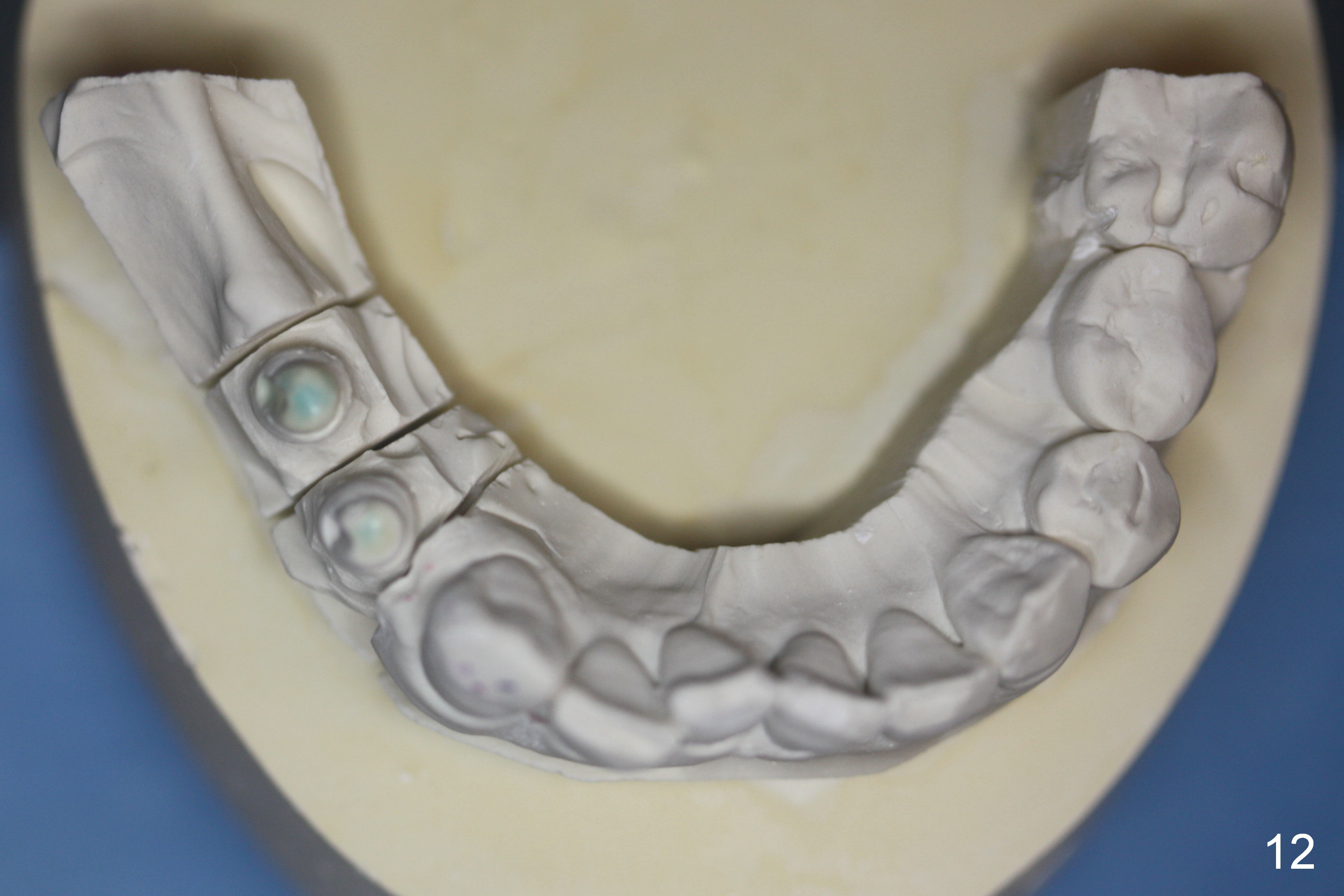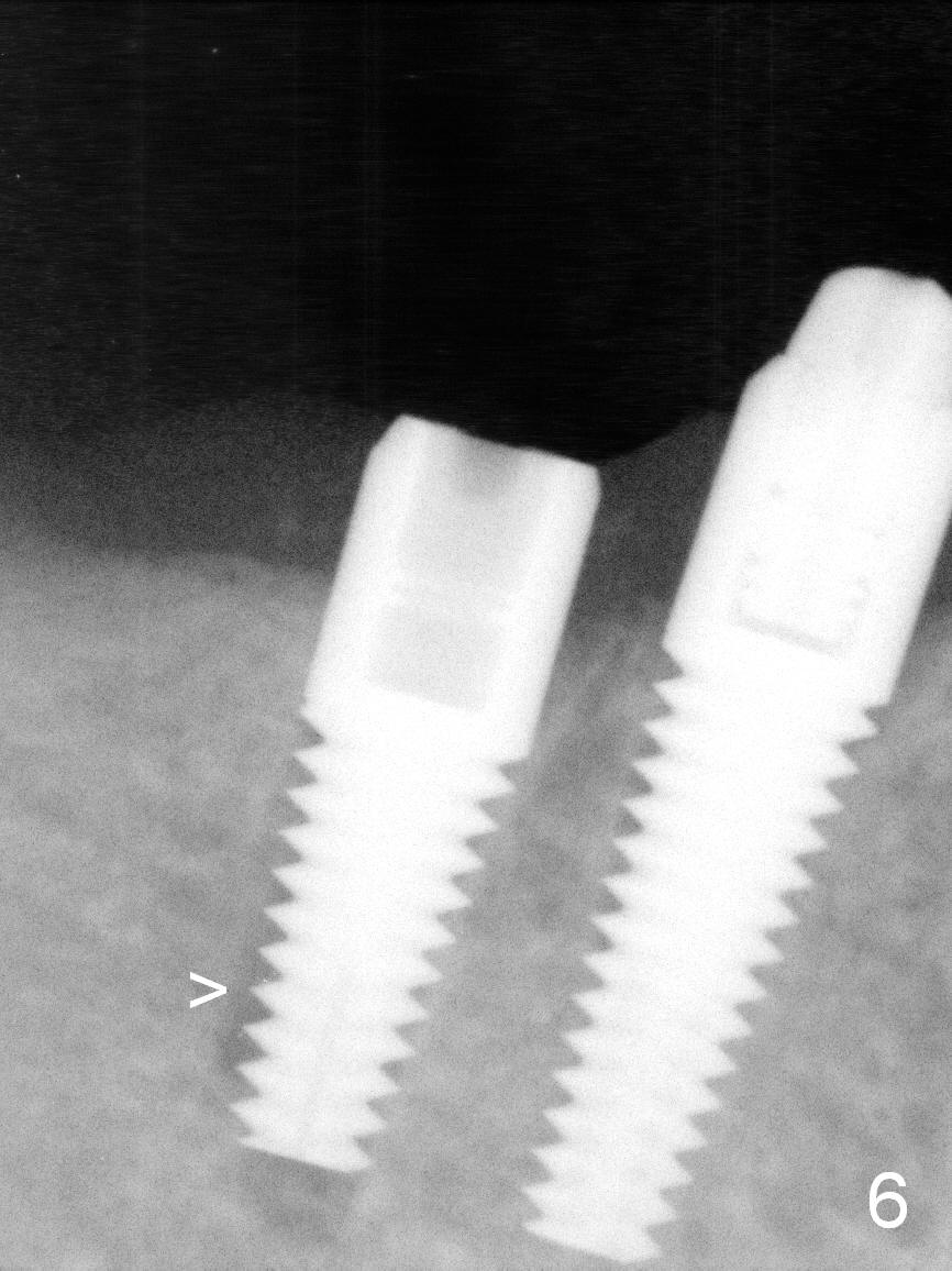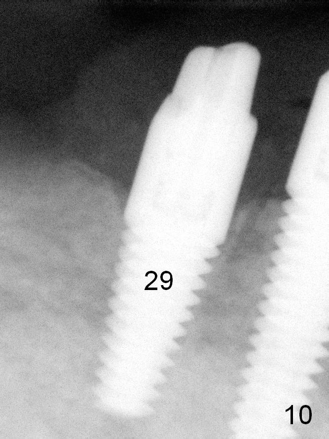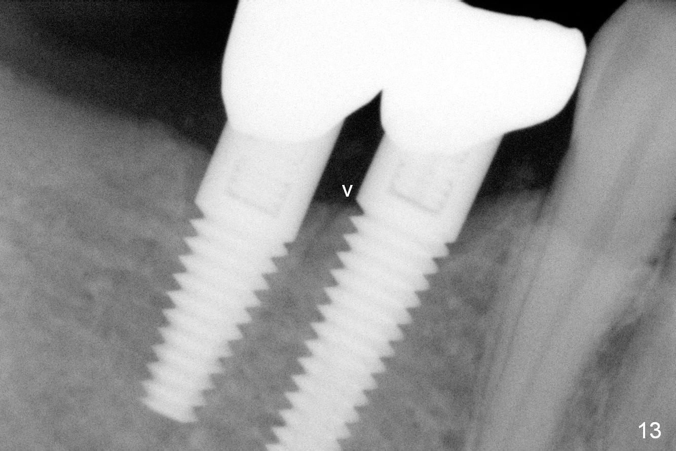 Three months postop, the repositioned implant osteointegrates (Fig.10) and remains lingual in position (Fig.11,12), although there is buccal plate atrophy (Fig.11). Four months post cementation, there is no further bone resorption (Fig.13). Crestal bone loss occurs prior to the 2nd surgery (Fig.4-10). It appears that the adjacent implants should be smaller (4 mm or less).