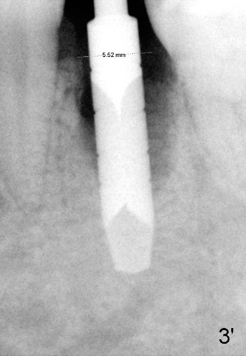 Fig.3: 3.5 mm reamer in place, 17 mm below the gingival margin. Dashed line: the mental loop.
