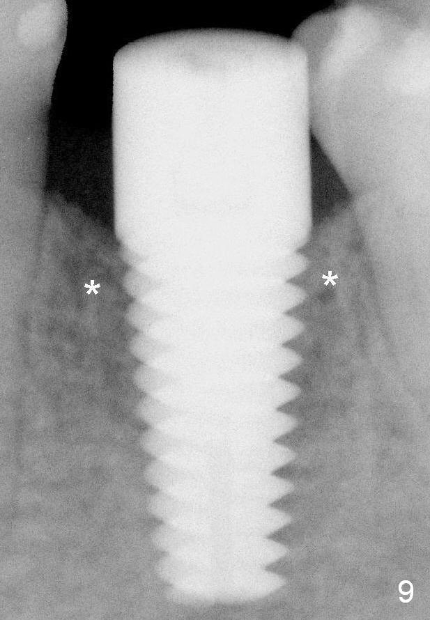 Fig.9 (6 months postop): Bone density around the coronal aspect of the implant increases (*). Apical resorption occurs.