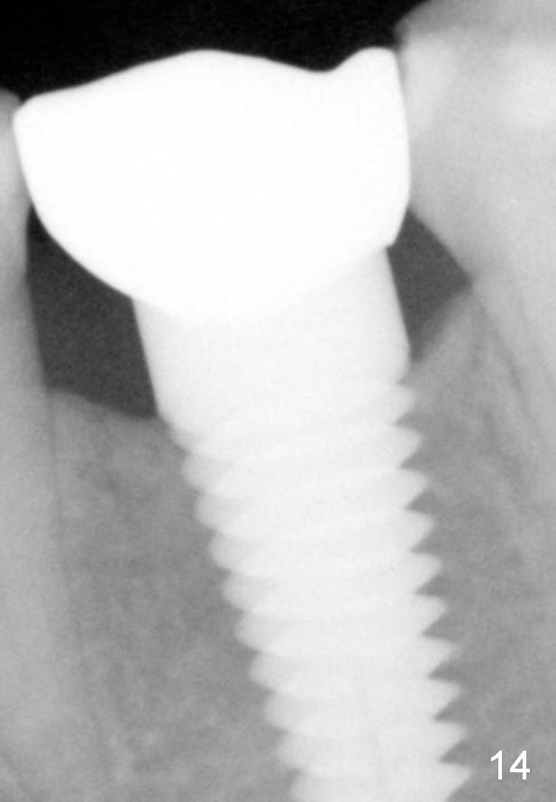 Eleven months post bonding (17 months postop), there is cortical bone formation at the mesial and distal crests (Fig.14). It remains the same 1 year 10 months post bonding (Fig.15). There is no bone loss 3 years 5 months post cementation (Fig.16). In fact the crestal cortical bone thickens.