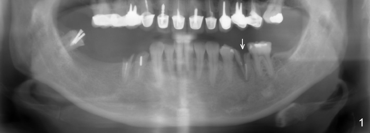 A 54-year-old lady has poor dentition. She seeks treatment because of pain associated with tooth fracture in the lower left 2nd premolar (Fig.1 arrow). The best option seems to be extraction and immediate implant. Thorough curettage after extraction is a key to get rid of infection.