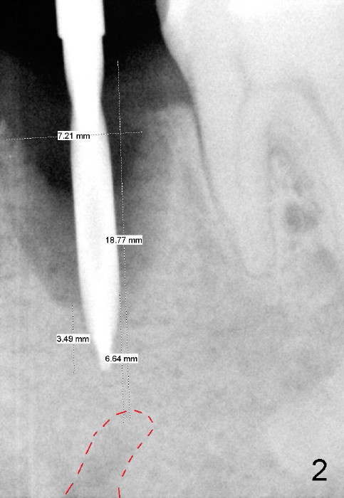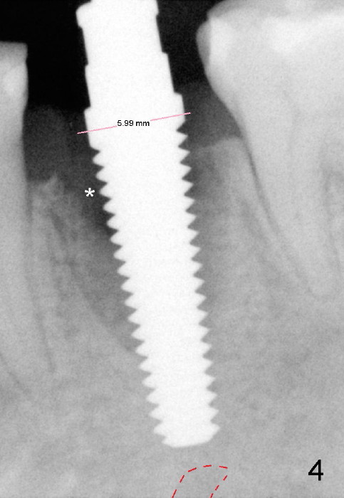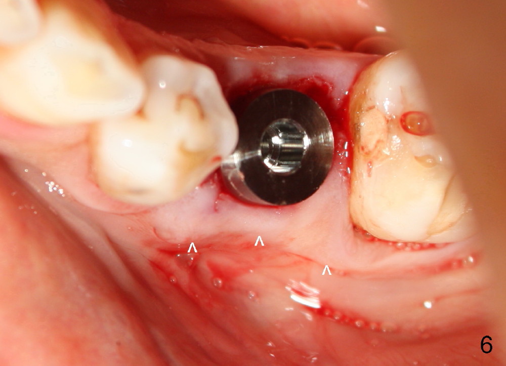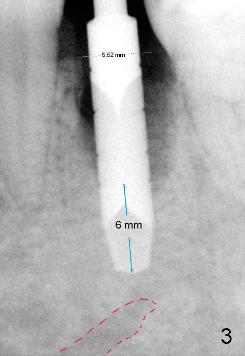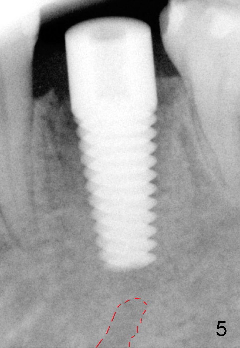 To avoid injury to the mental loop (Fig.2 dashed line), the depth of initial osteotomy is tightly controlled apical to the bottom of the socke. Accurate measuring is the 2nd important measure to assure no or minimal neurological trauma. The wide socket (due to infection) allows to place an implant as wide as 7 mm.