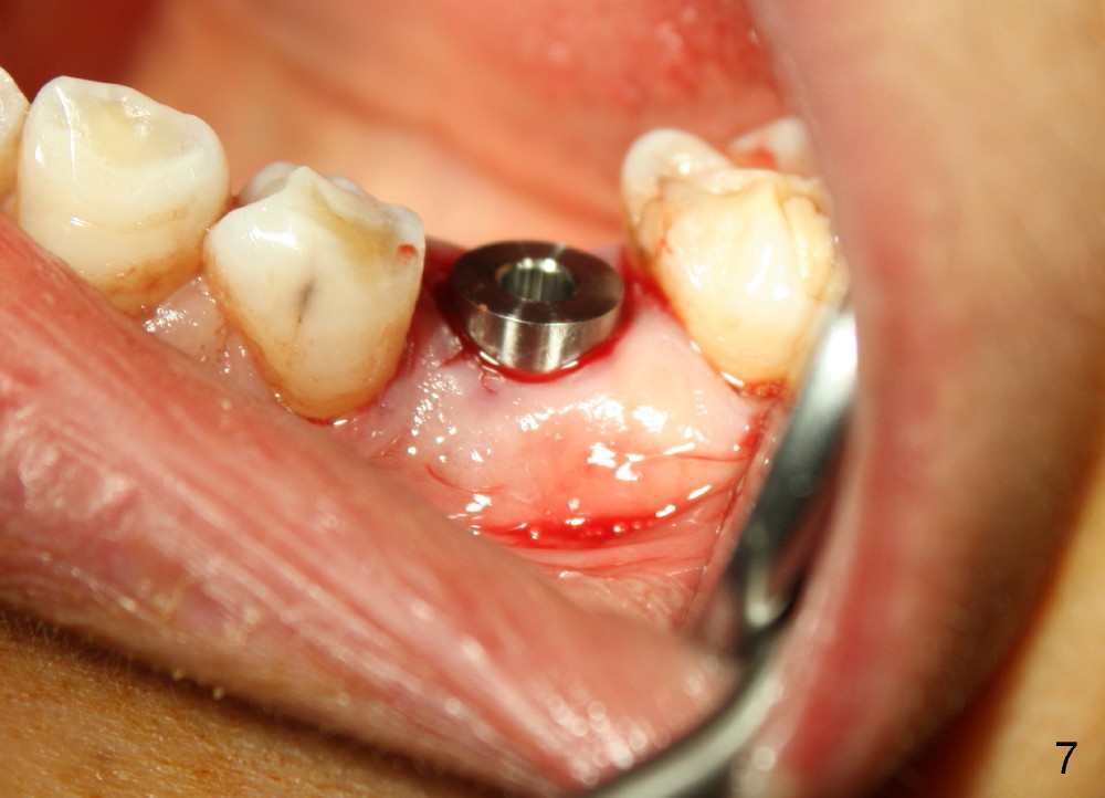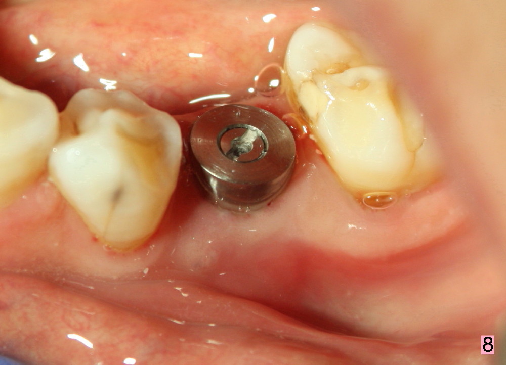 Taking multiple intraop X-ray is also necessary for depth adjustment (Fig.3-5). For example, when a 5x20 mm tap is inserted at the depth of 17 mm, it is close to the mental loop (Fig.4), whereas the binding to the bone is minimal. So a larger implant is to be placed at a shallower depth (Fig.5: 6x17 mm with insertion torque >60 Ncm). The shallower implant placement creates limited space for future abutment and crown (Fig.6,7). A short abutment will be used and the implant margin will be prepared as low as possible. As expected, the wound heals in a week (Fig.8).