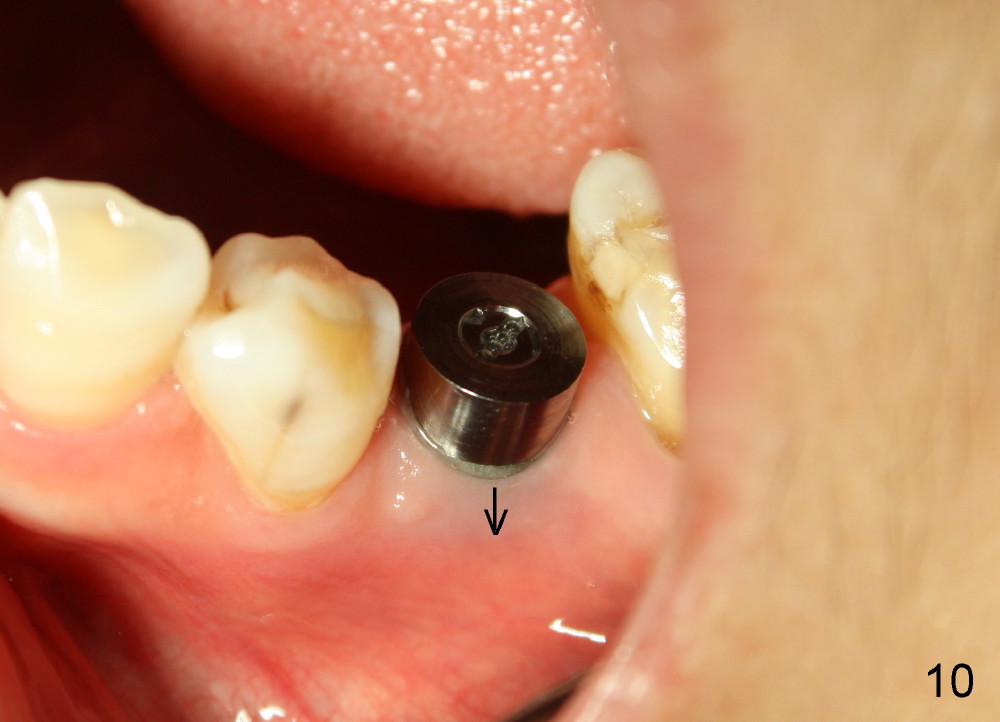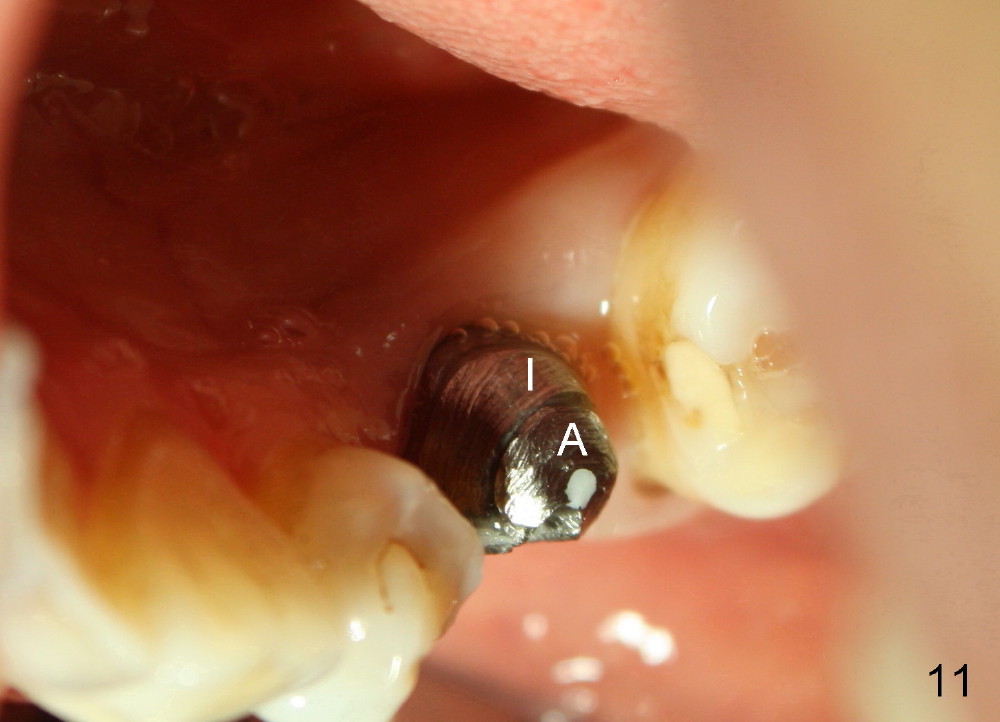 Six months postop, bone density around the implant increases (Fig.9). There is slight gingival recession buccal to the implant (Fig.10 arrow). A short abutment is placed and prepared short (Fig.11 A); the margin is prepared as low as possible in the implant (I).
