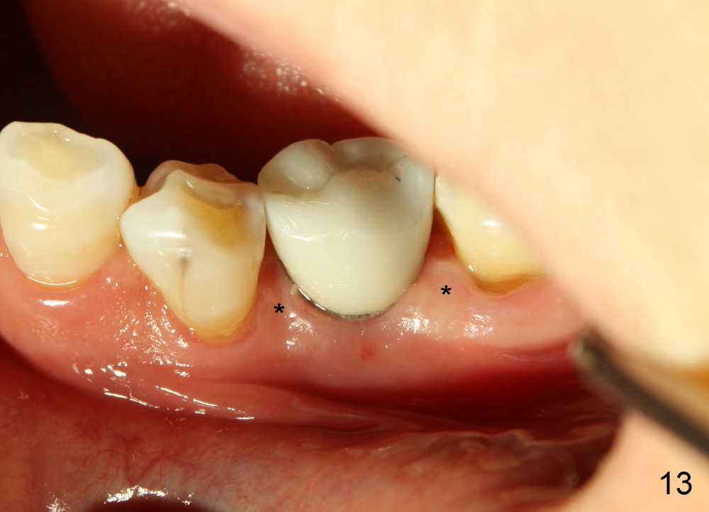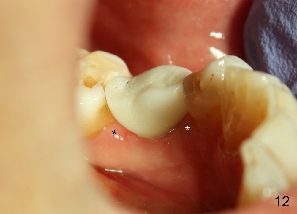 When the crown is bonded, the papillae (*) look basically normal lingually (Fig.12) and buccally (Fig.13).