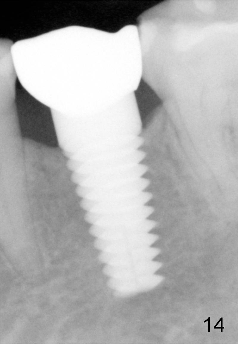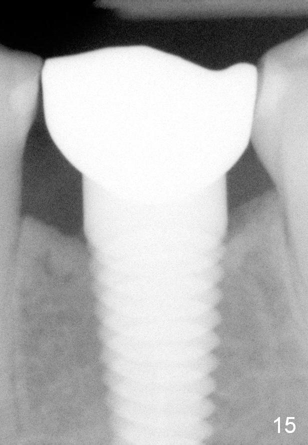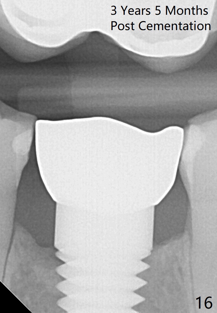 Eleven months post bonding (17 months postop), there is cortical bone formation at the mesial and distal crests (Fig.14). It remains the same 1 year 10 months post bonding (Fig.15). There is no bone loss 3 years 5 months post cementation (Fig.16). In fact the crestal cortical bone thickens.