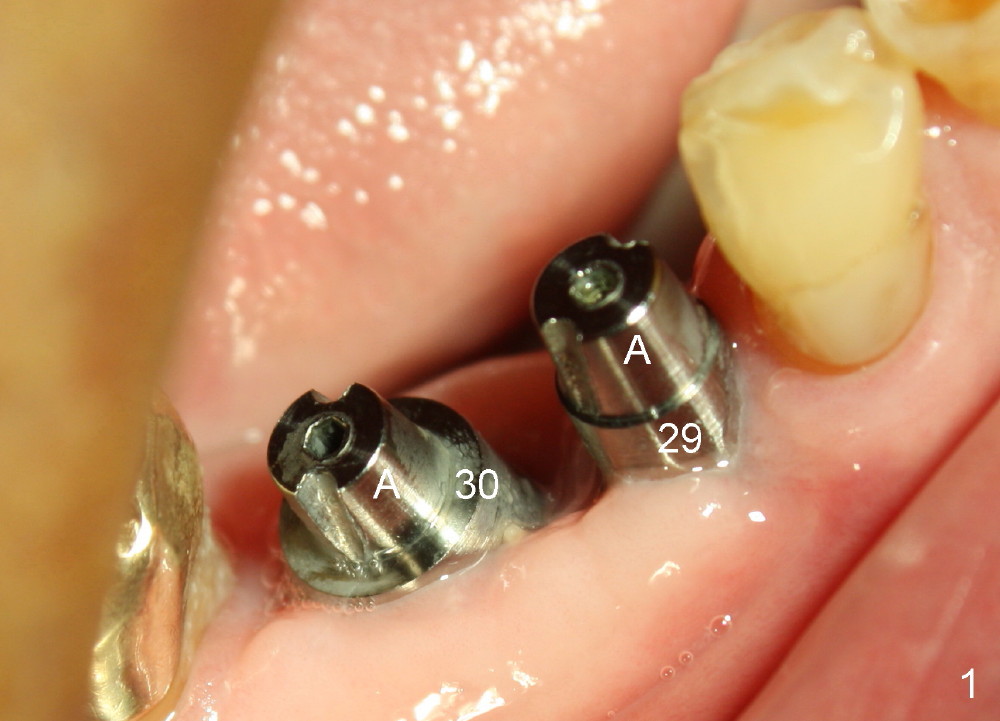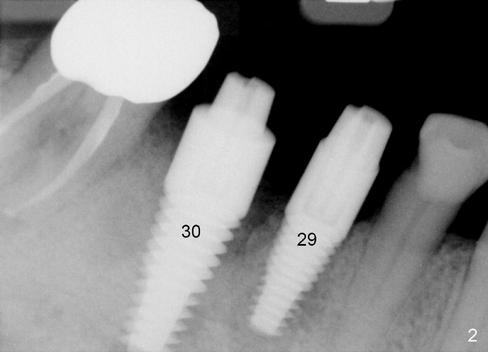There are several possible reasons for #29 loosening. Implants are placed almost on the right and left sides at the same time. The patient is a bruxer. Abutments placed immediately are used to hold perio dressing in place. After perio dressing is dislodged, the patient may chew with the abutments. There is distal wall defect associated with #29 socket when the tooth is extracted and socket preservation is done.