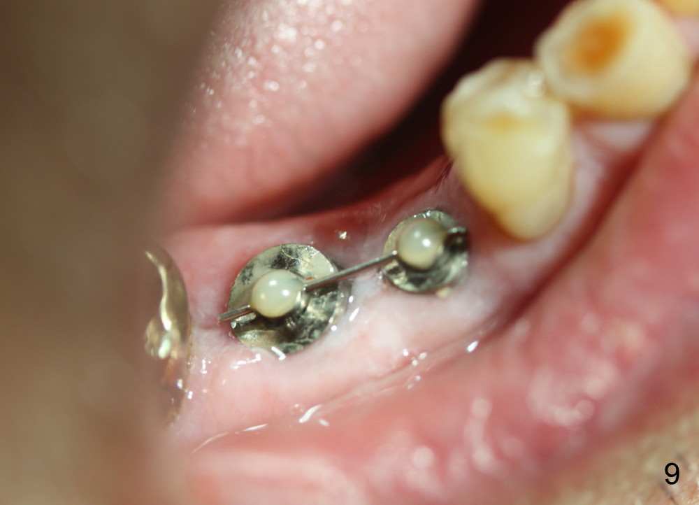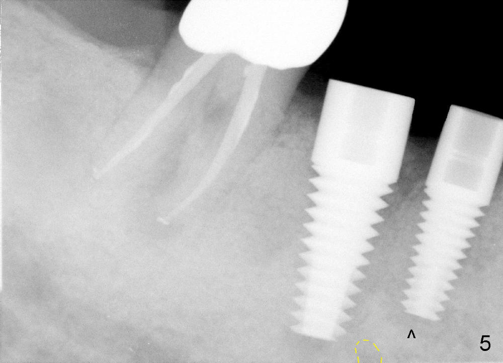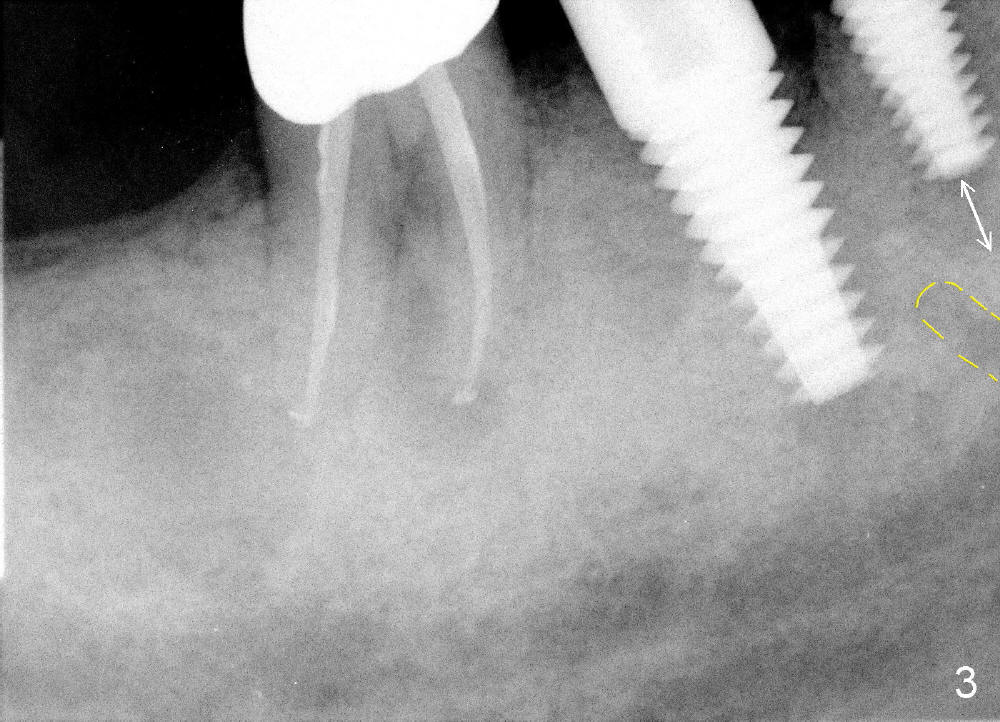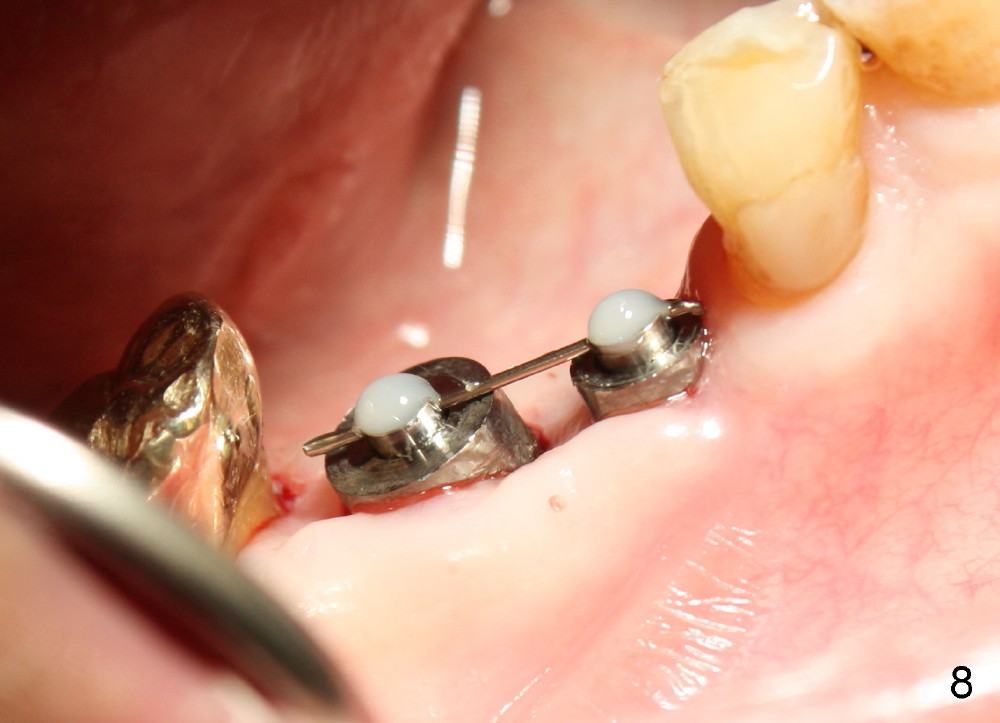 One month after implant placement at the sites of #29,30, the former is found loose (Fig.1,2). It is placed higher than #30. Three weeks later, PA is retaken to confirm that there is space apical to the implant at #29 (Fig.3 double arrows) and that there is distance from the mental loop (yellow dashed line). After infiltration anesthesia, the implant is torqued down initially (compare Fig.4,5) and more (Fig.6,7). To prevent re-loosening, the two implants are splinted (Fig.8).