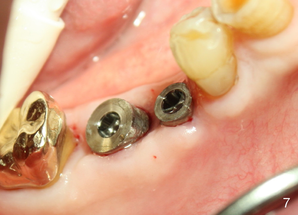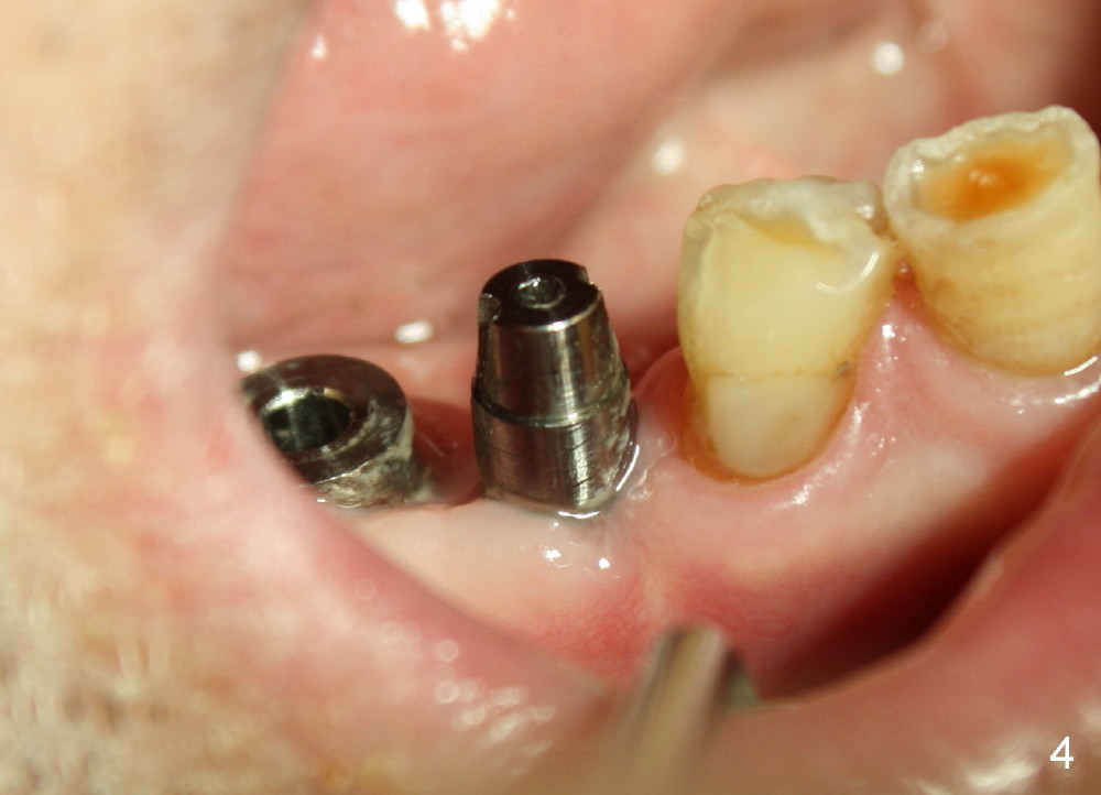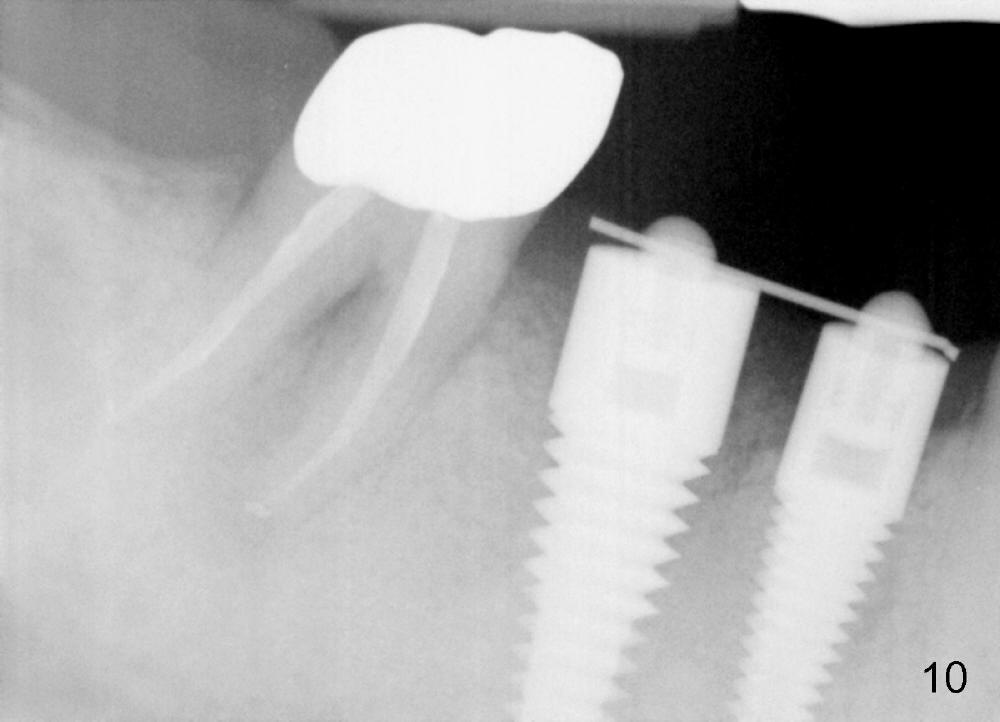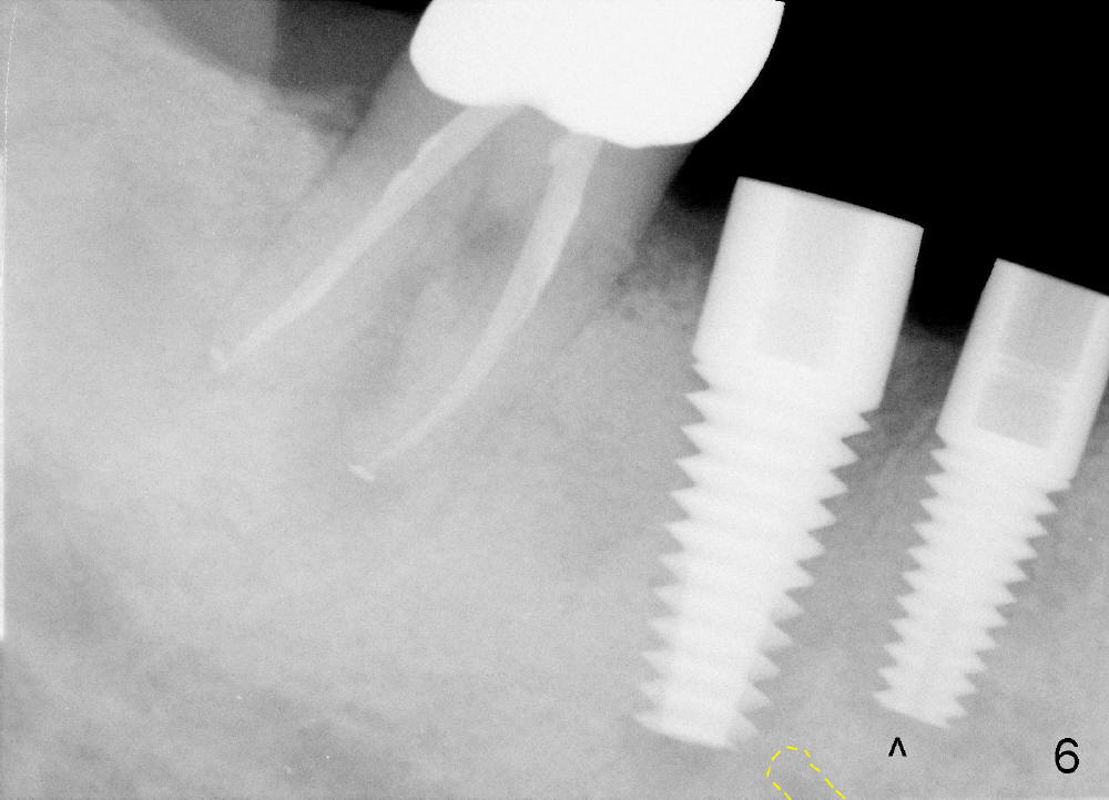 In 3 months, the gingiva appears to have grown up to cover more of the most coronal portion of the implants (Fig.9). Since the tooth #31 becomes symptomatic probably due to overloading (Fig.10), these 2 implants are prepared for restoration ahead of time.