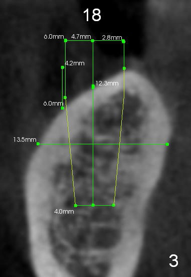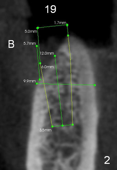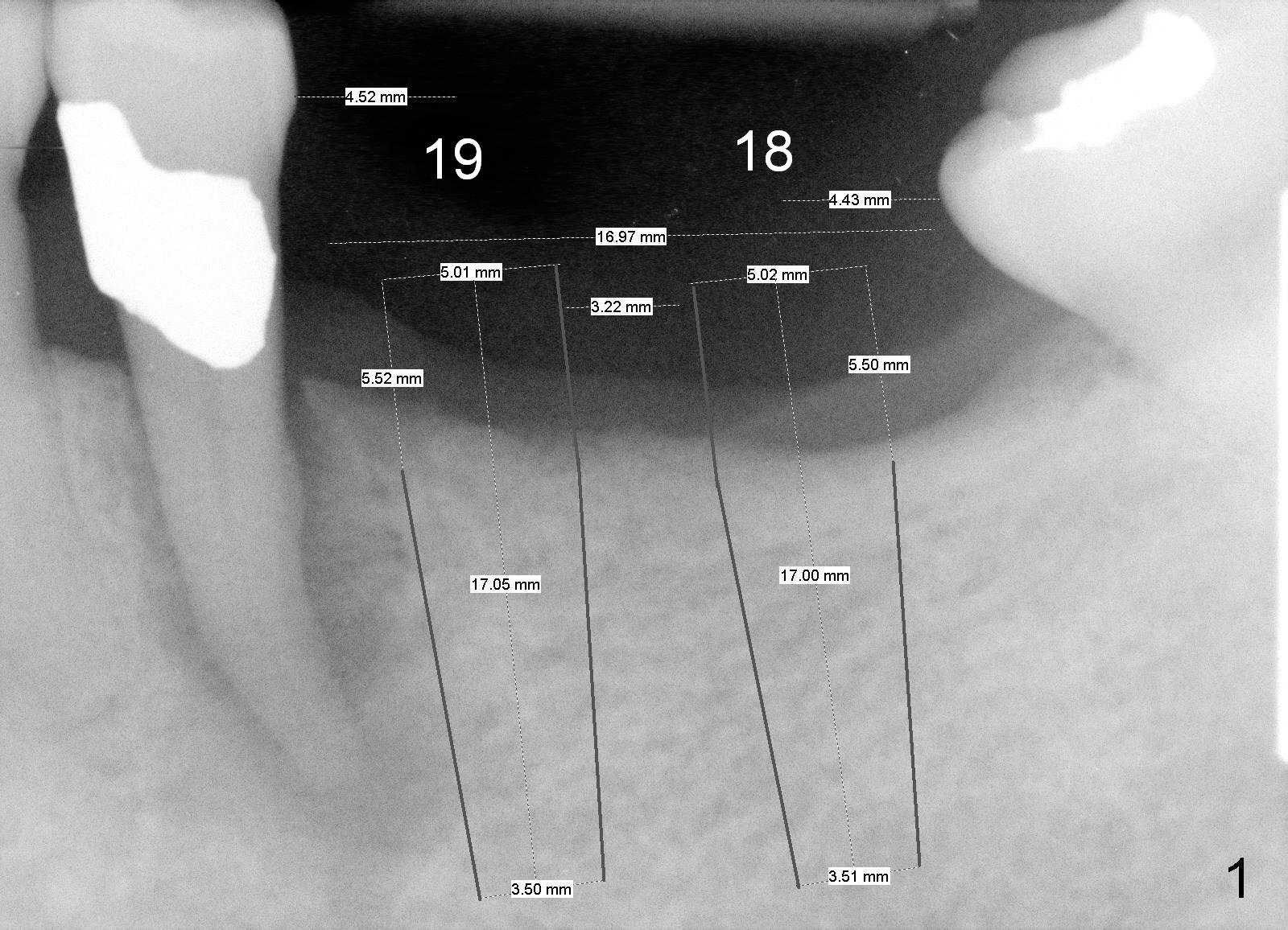 A 57-year-old lady needs implant placement at the sites of #18 and 19 (Fig.1). It appears that 5x17 mm implants are feasible, but CT coronal sections show that there will be substantial buccal implant exposure (Fig.2,3). Ideally smaller implants should be placed as lingual as possible.