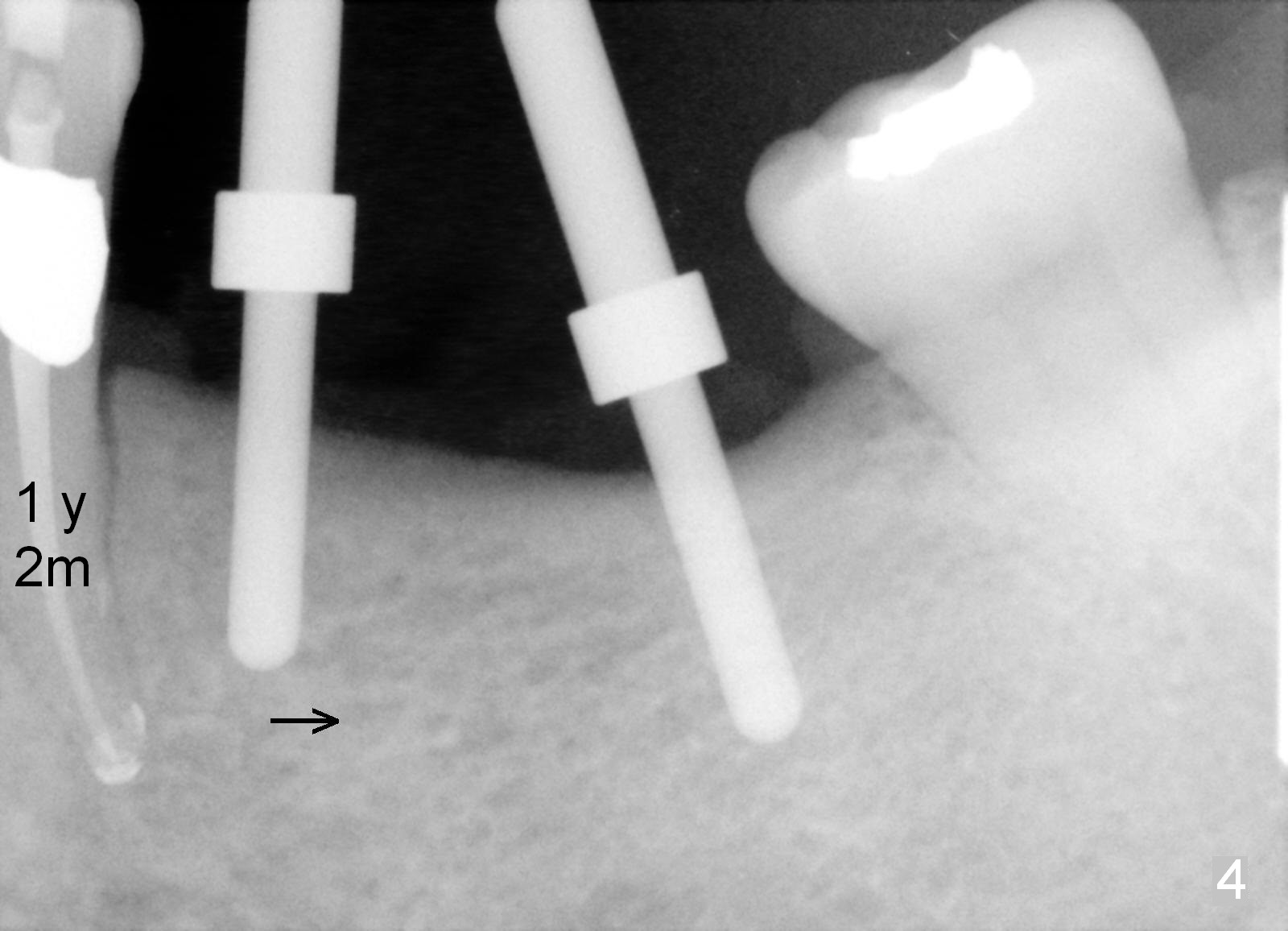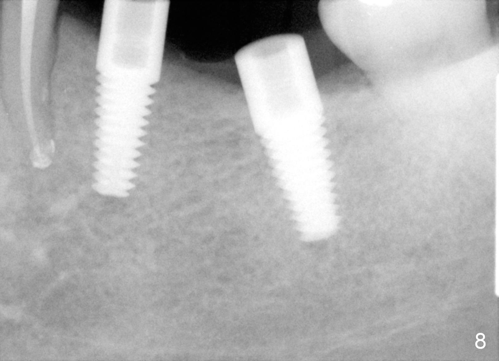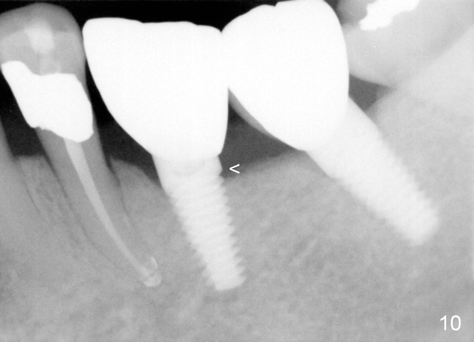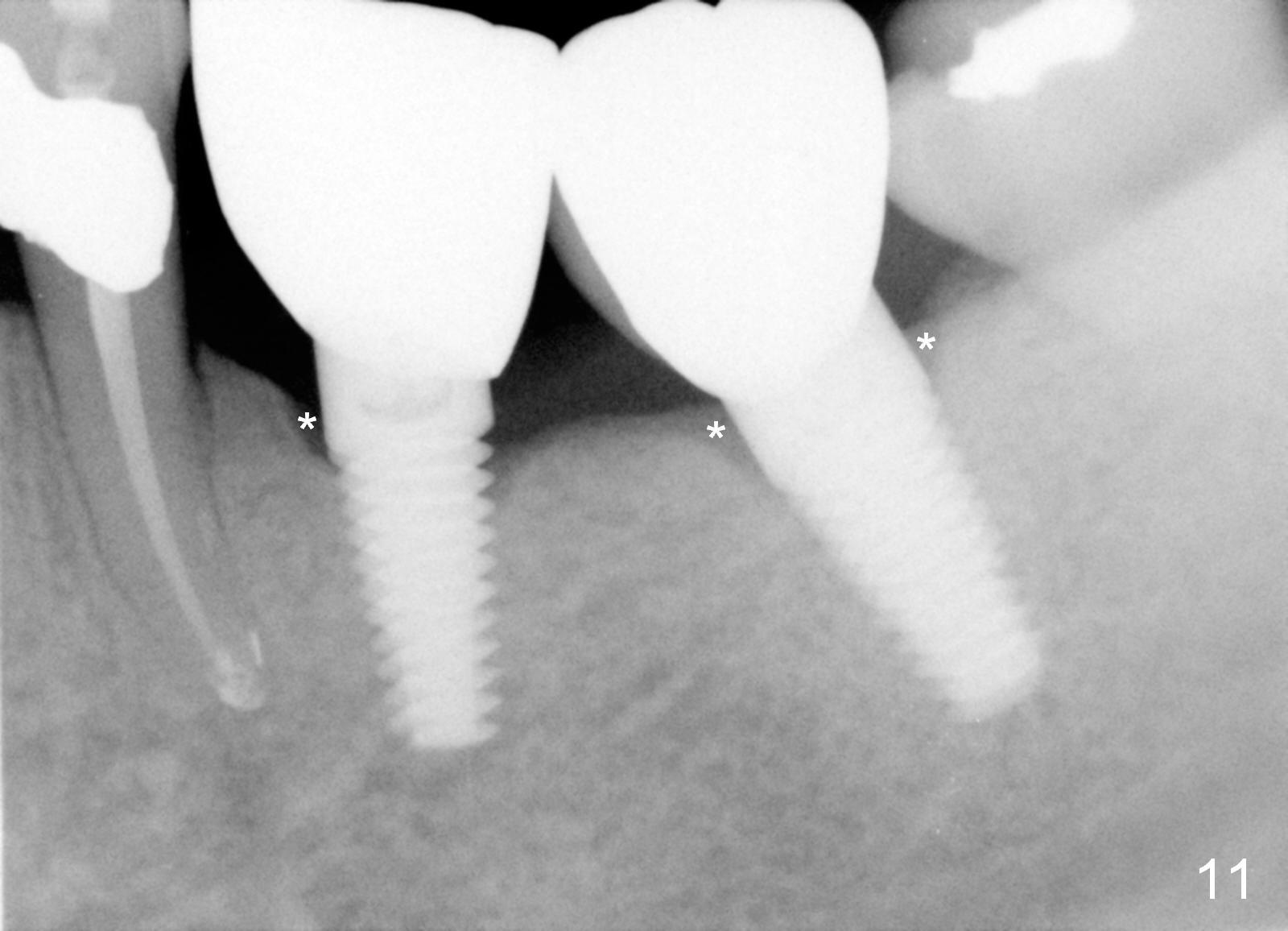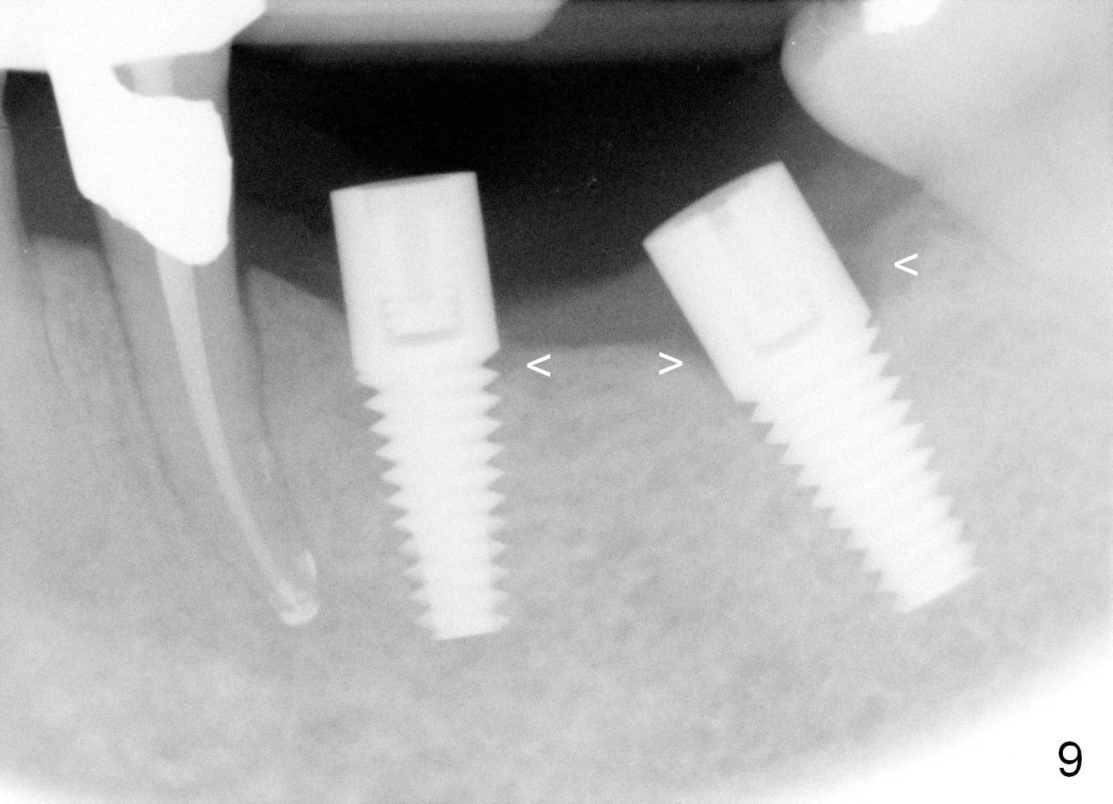 Three months postop, crestal bone has started to resorb (Fig.9 arrowheads). Resorption gets worse over time (Fig.10: 4 months post cementation, 11 months postop) (Fig.11: 1 year 2 month post cementation). On the other side (#30), postop bone resorption is not so severe. The patient's main concern is that she does not have normal taste ever since she got the implants.