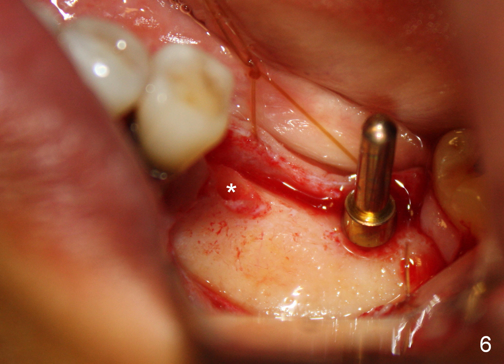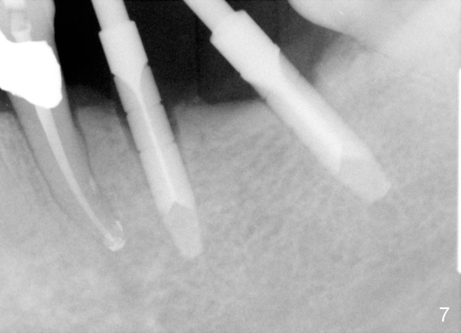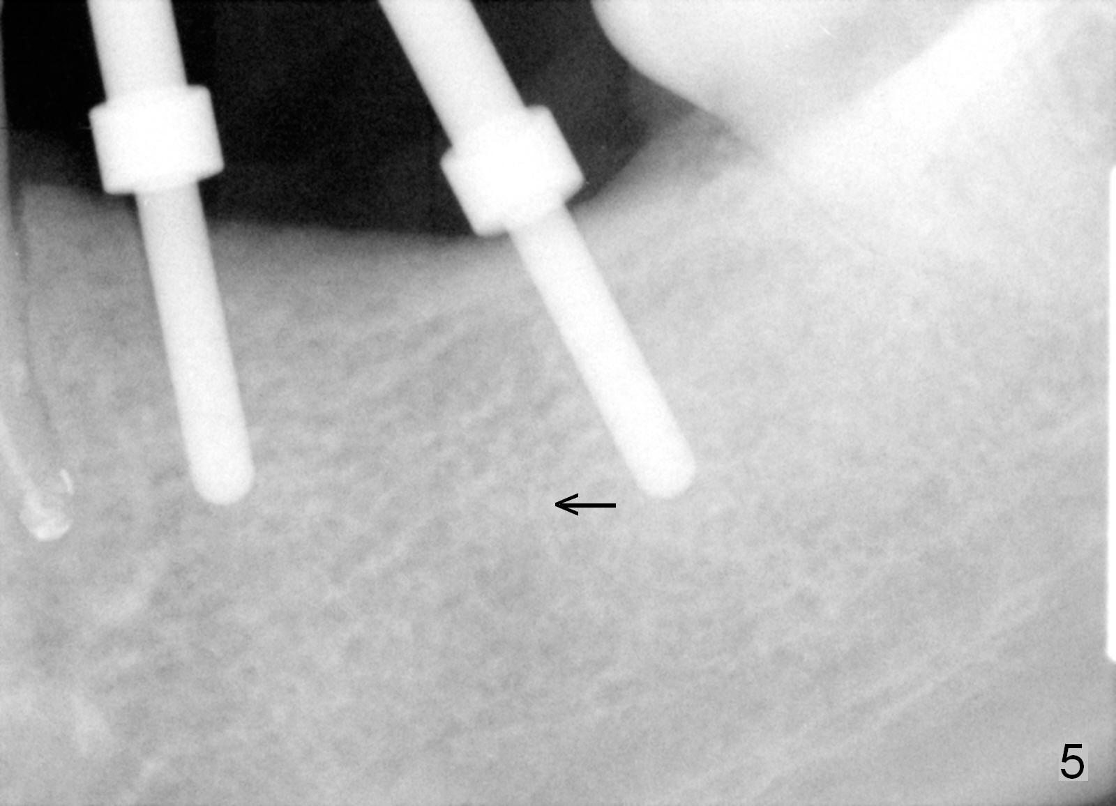 One year 2 months post root canal therapy at #20 (Fig.4), osteotomies are initiated at #18 and 19. The trajectory at #19 is subsequently corrected (Fig.5); that of #18 should be also corrected (arrow). The fact of the narrow ridge (Fig.6) is also ignored intraop. Without further adjustment, the osteotomies are enlarged (Fig.7) and the implants are placed (Fig.8: 4.5x14, 5x14 mm). As expected, the buccal coronal implant surface is exposed. The buccal plate is decorticated with placement of autogenous bone graft. Periodontal dressing is applied. Postop, the wound is infected with wound gapping. With irrigation, the wound finally heals.