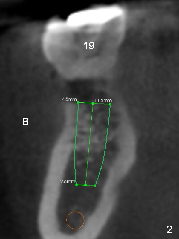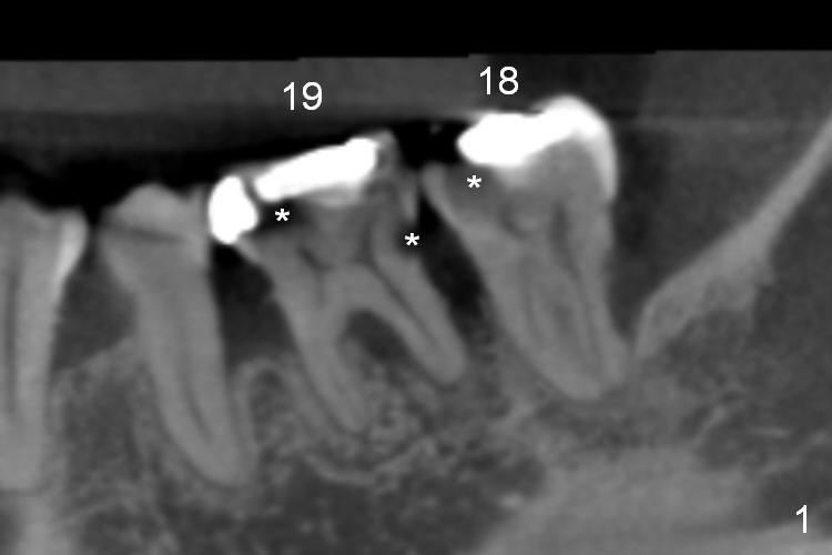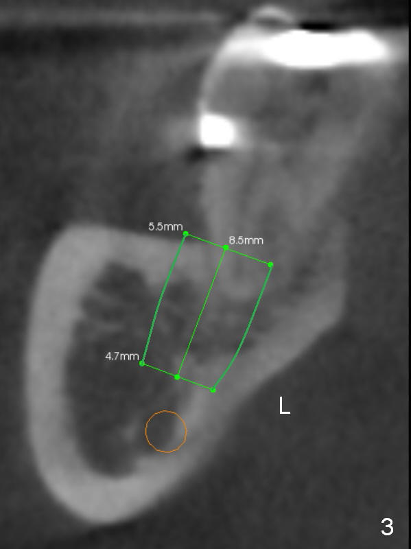 A 48-year-old lady (HJ) has several missing teeth (UL, UR, LR). Suddenly there is pain from LL quadrant, either due to caries (Fig.1 *), periodontitis or both. Conservative treatment (RCT) should be tried first. If one of the teeth is deemed non-salvageable, extraction and immediate implant is provided (Fig.2,3 (B: buccal, L: lingual)). Clindamycin will be used for socket disinfection.