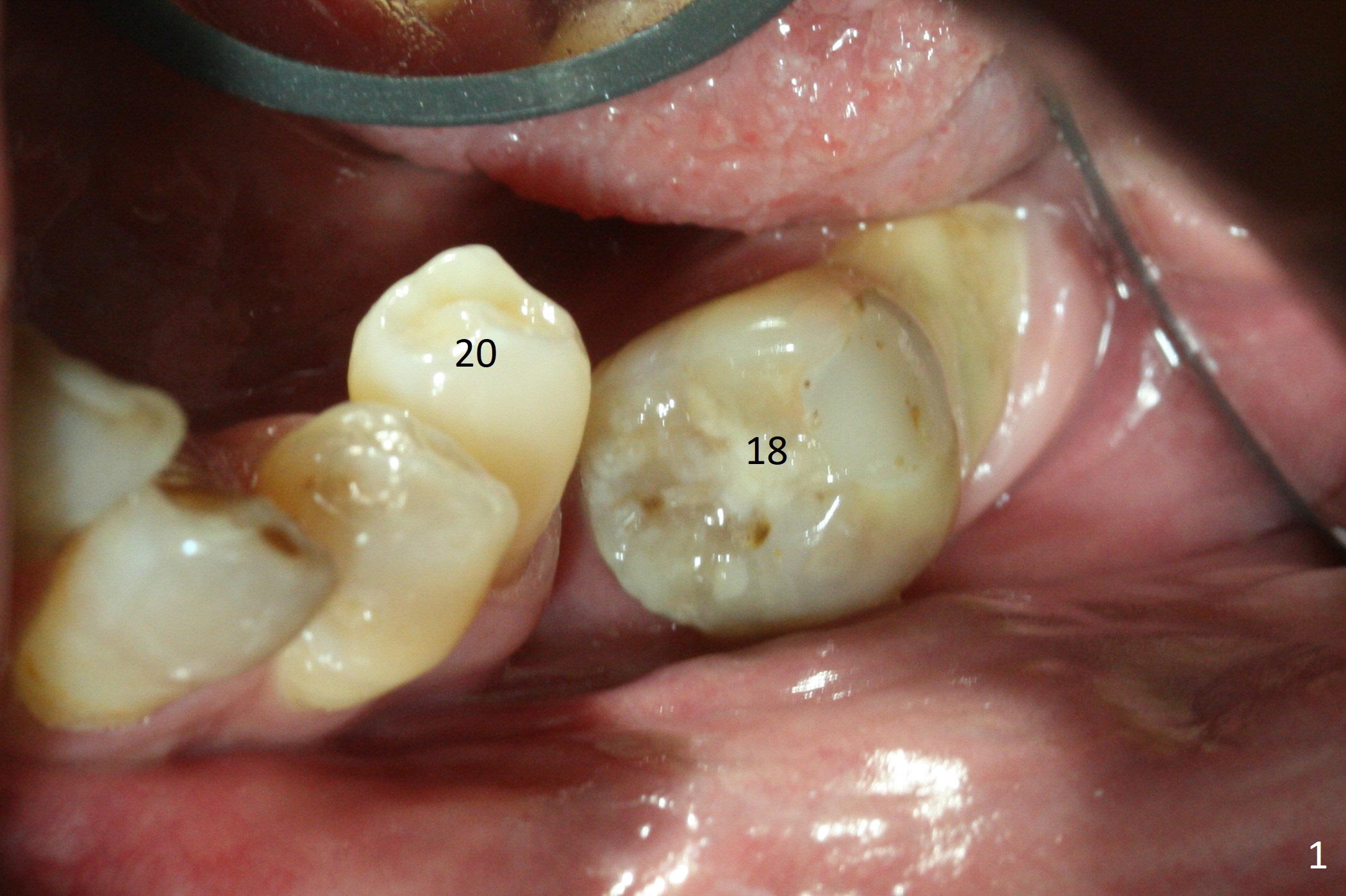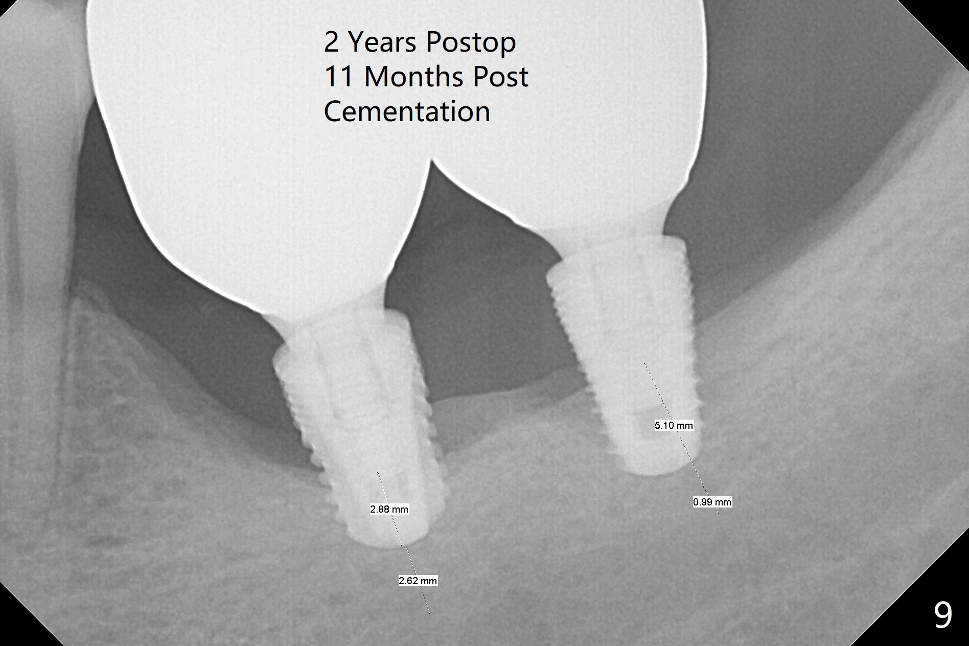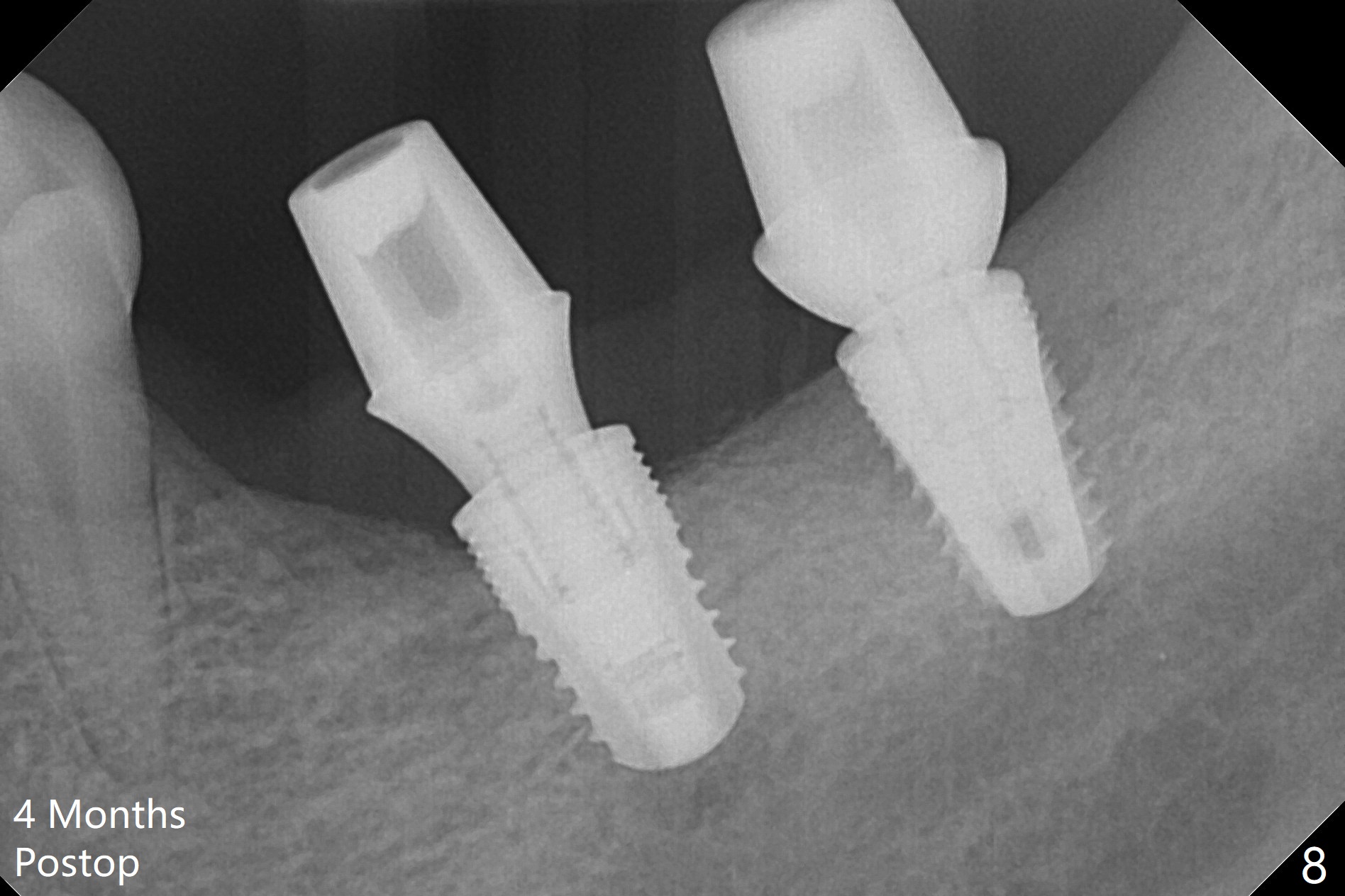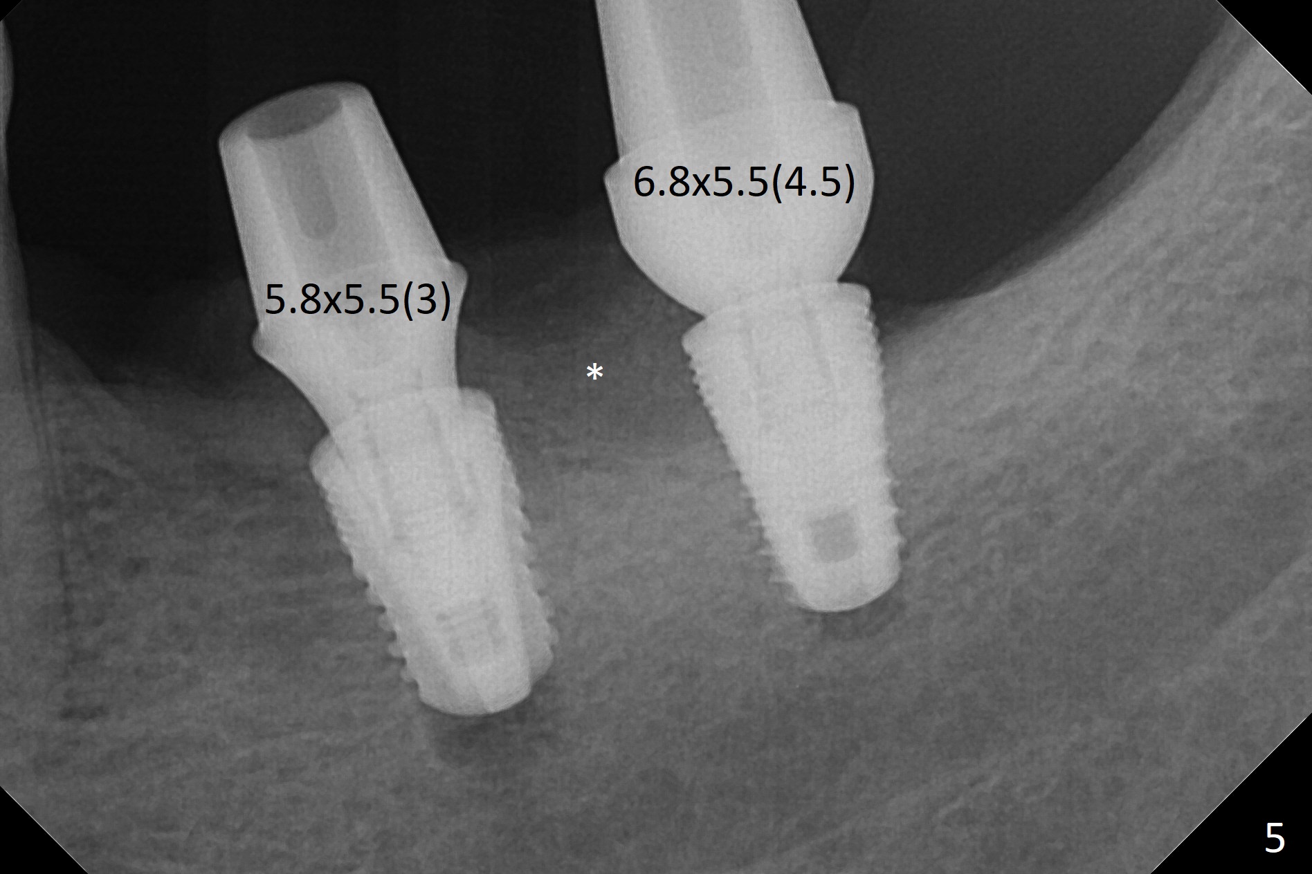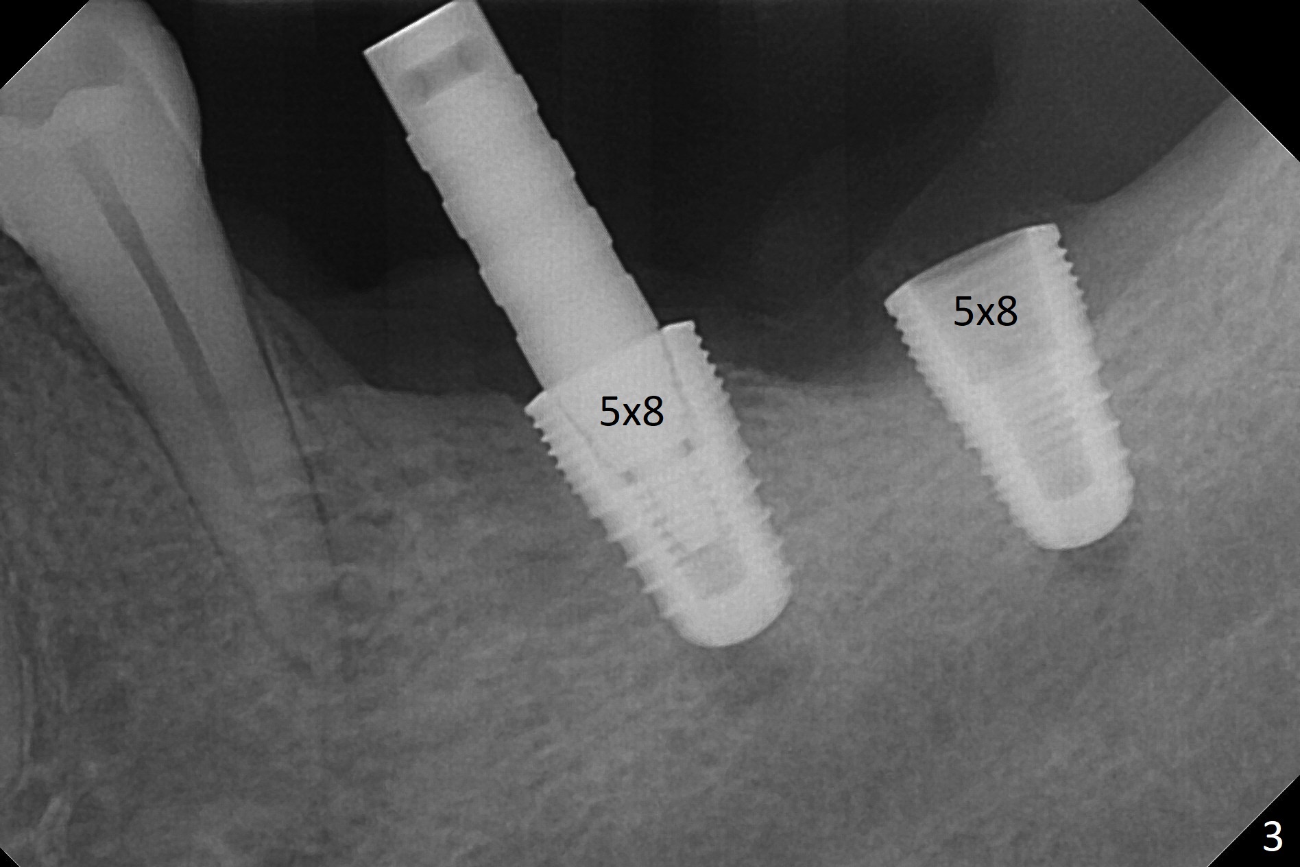 Preop photo shows severe mesial tilt of the tooth #18 (Fig.1). After extraction, the osteotomy is established in the apical end of the socket, where the buccolingual width is limited. It appears that an extra wide implant (5.9 mm) may perforate one of buccolingual plates. On the other hand, the buccal plate (Fig.2 double arrows) is intact and approximately 2 mm tall, whereas the lingual one is thin and lower. Initial osteotomy confirms that bone heights at #18 and 19 are 6 and 8 mm, respectively. Counting 2 mm of the buccal plate and bone graft lingually, a 8 mm long implant may be a practical option at the site of #18. After initial placement of two of 5x8 mm SM implants (Fig.3), the depth of the implant at #19 is adjusted twice (Fig.4,5). With placement of autogenous and allograft (Vanilla, Fig.5 *)) and abutments, a piece of cotton pellet is placed in each abutment well (access, Fig.6 *). Periodontal dressing is applied to the abutment wells for additional retention (Fig.7 *). Due to local poor oral hygiene, splinted provisional is fabricated 4 months postop (Fig.8) in preparation for limited orthodontic uprighting the tooth #20. The patient has pain with mastication at #18 eleven months post cementation (Fig.9). It appears that both of the implants should be removed with immediate replacement and bone graft. Prepare 4 PRF and sticky bone. The new implant will be 5.0 or 5.5x5 mm (Fig.10 green) with 2.3 mm platform (white). A block graft will be harvested from the ipsilateral ramus using 9/8 and 6/5 mm trephine burs for 2-3 mm in depth (Fig.11 blue). The ring graft will be seated around the platform over the implant (Fig.12).