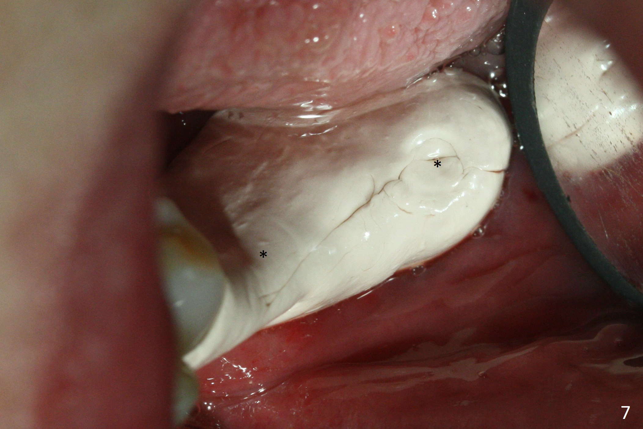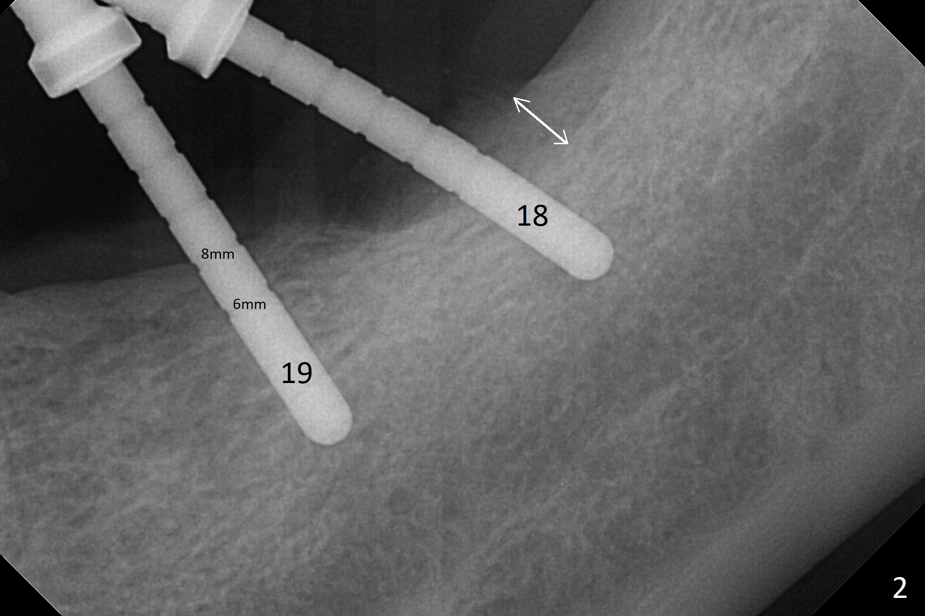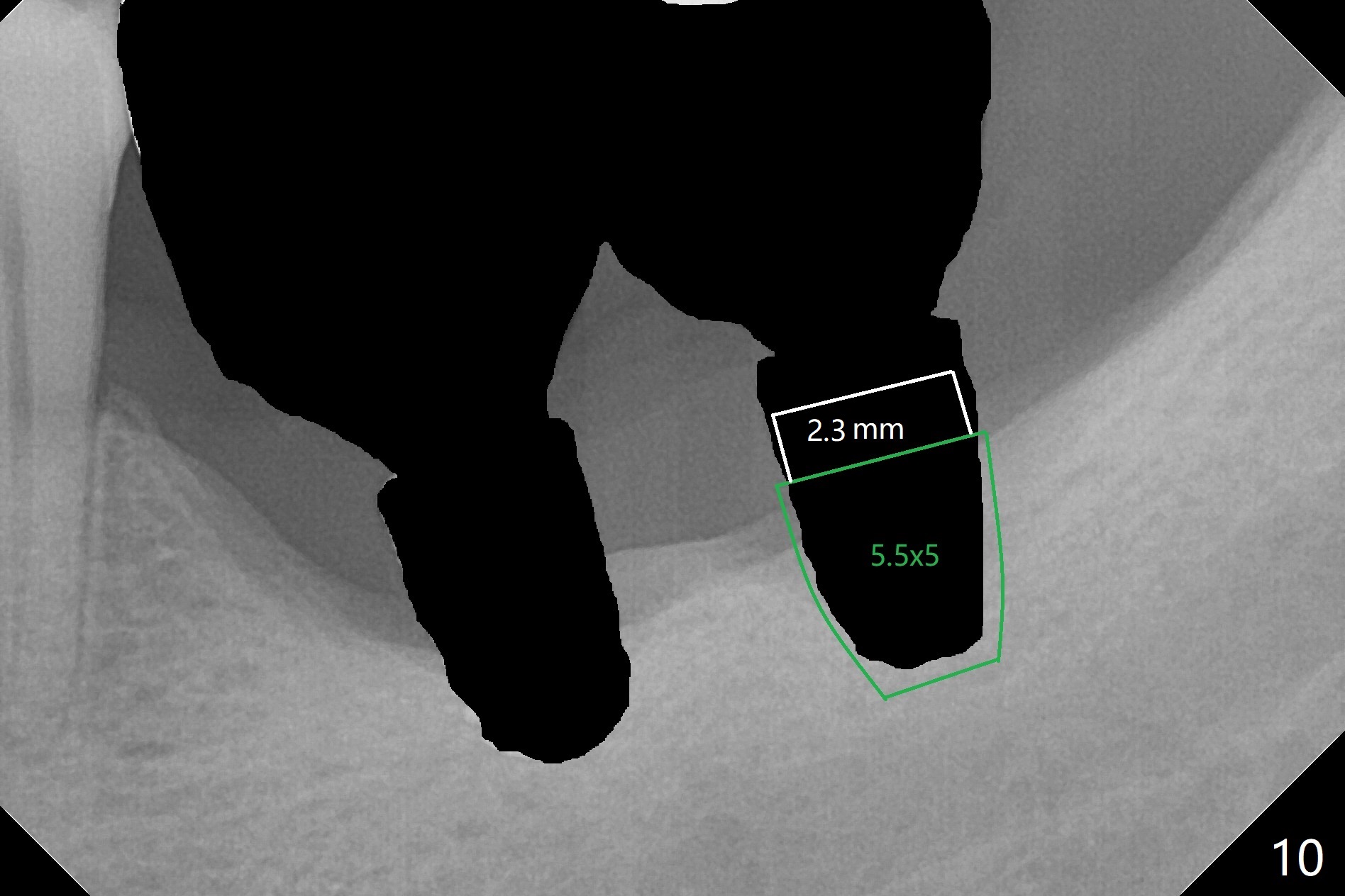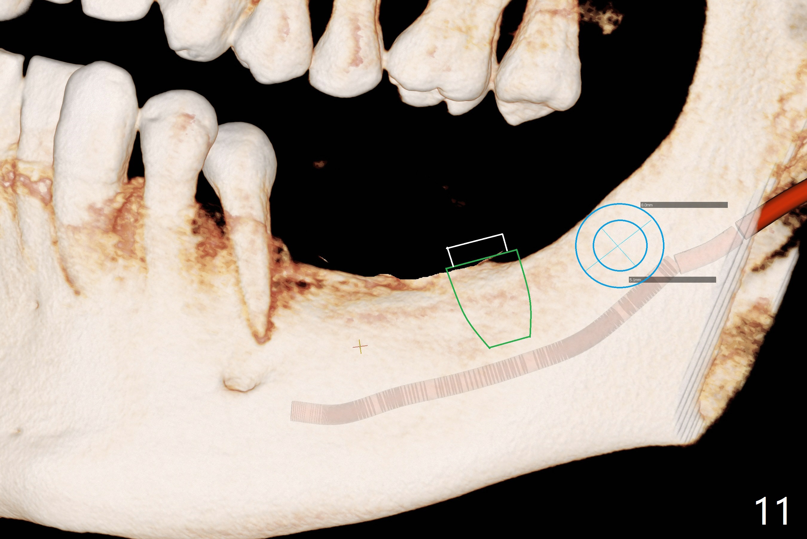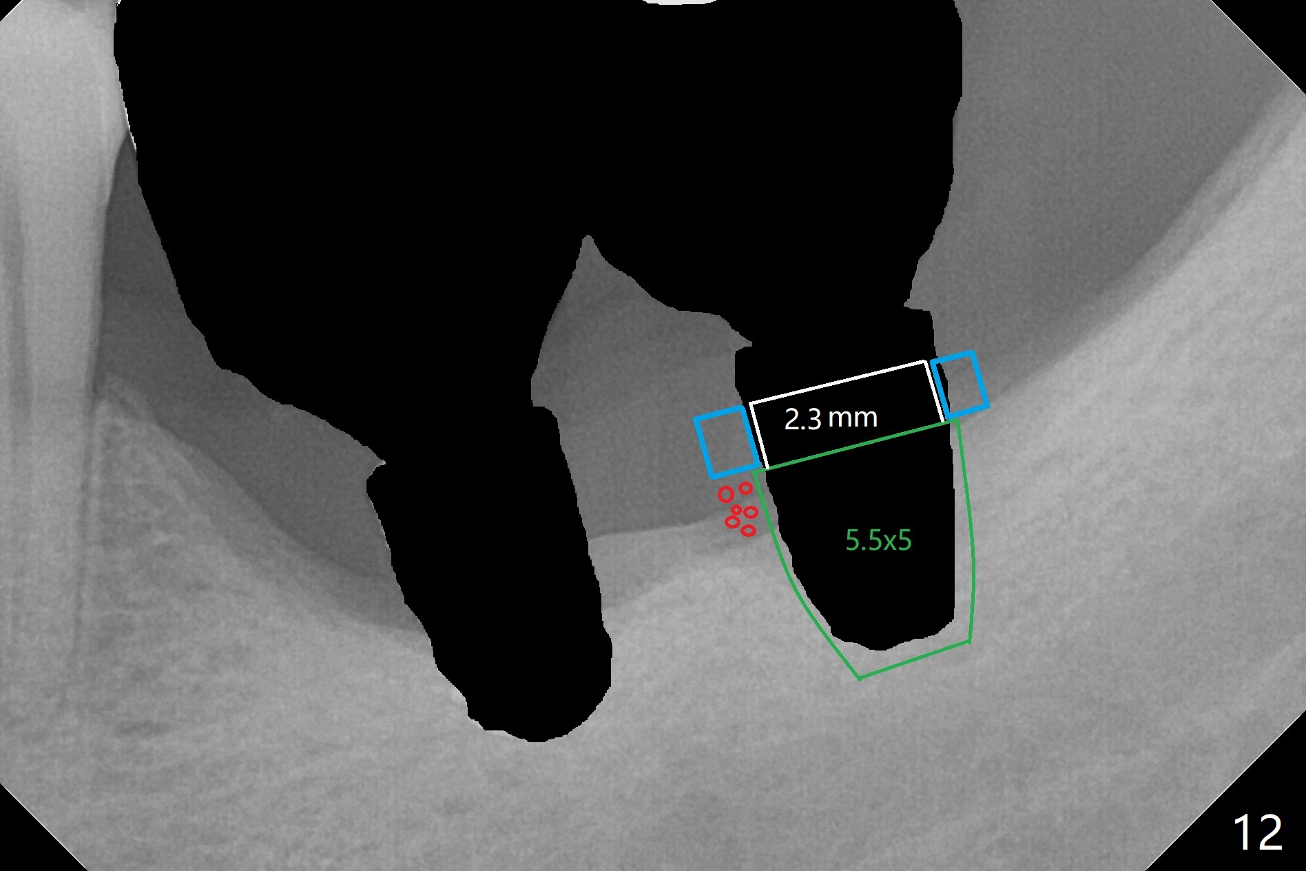 Preop photo shows severe mesial tilt of the tooth #18 (Fig.1). After extraction, the osteotomy is established in the apical end of the socket, where the buccolingual width is limited. It appears that an extra wide implant (5.9 mm) may perforate one of buccolingual plates. On the other hand, the buccal plate (Fig.2 double arrows) is intact and approximately 2 mm tall, whereas the lingual one is thin and lower. Initial osteotomy confirms that bone heights at #18 and 19 are 6 and 8 mm, respectively. Counting 2 mm of the buccal plate and bone graft lingually, a 8 mm long implant may be a practical option at the site of #18. After initial placement of two of 5x8 mm SM implants (Fig.3), the depth of the implant at #19 is adjusted twice (Fig.4,5). With placement of autogenous and allograft (Vanilla, Fig.5 *)) and abutments, a piece of cotton pellet is placed in each abutment well (access, Fig.6 *). Periodontal dressing is applied to the abutment wells for additional retention (Fig.7 *). Due to local poor oral hygiene, splinted provisional is fabricated 4 months postop (Fig.8) in preparation for limited orthodontic uprighting the tooth #20. The patient has pain with mastication at #18 eleven months post cementation (Fig.9). It appears that both of the implants should be removed with immediate replacement and bone graft. Prepare 4 PRF and sticky bone. The new implant will be 5.0 or 5.5x5 mm (Fig.10 green) with 2.3 mm platform (white). A block graft will be harvested from the ipsilateral ramus using 9/8 and 6/5 mm trephine burs for 2-3 mm in depth (Fig.11 blue). The ring graft will be seated around the platform over the implant (Fig.12).