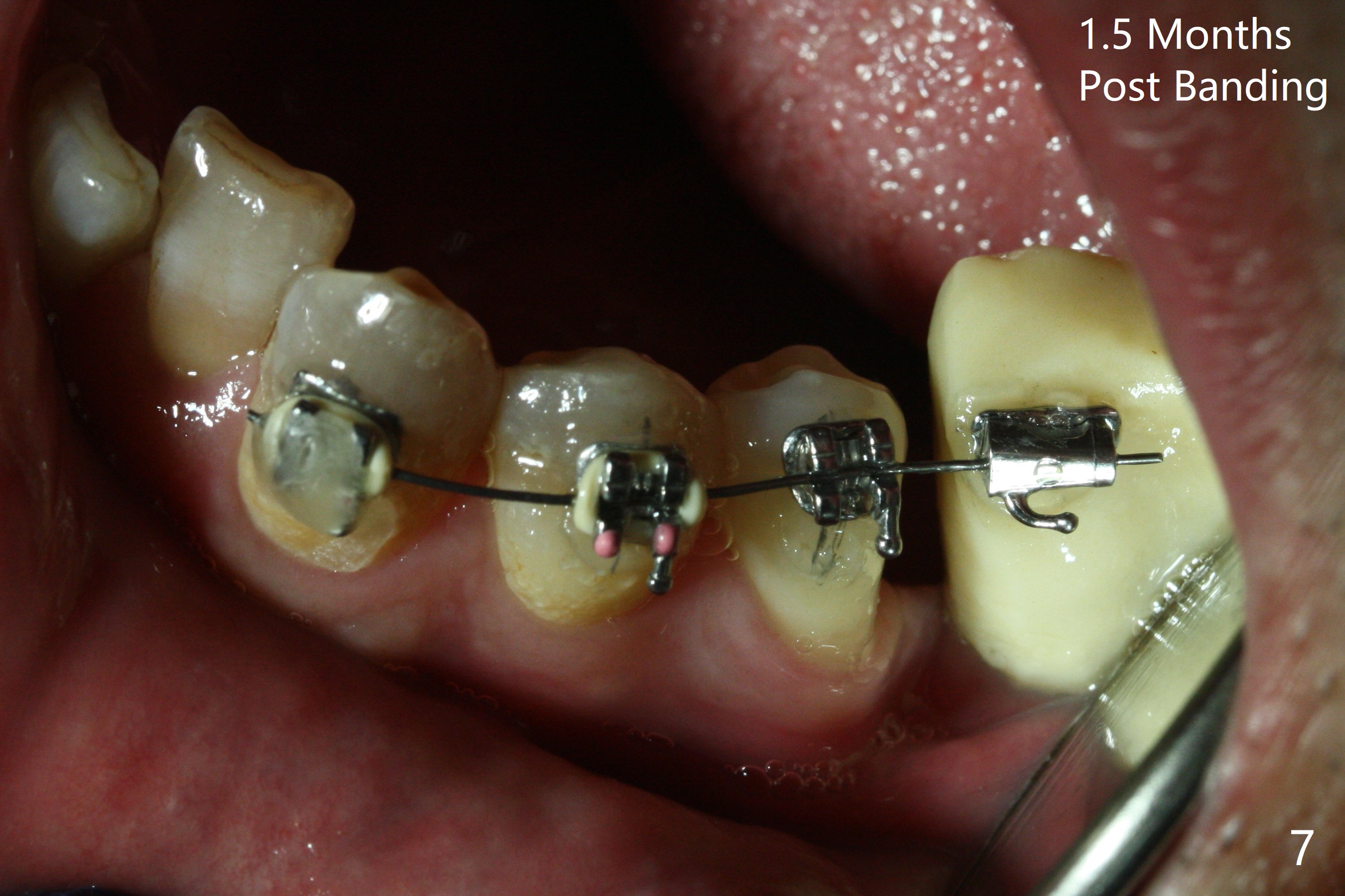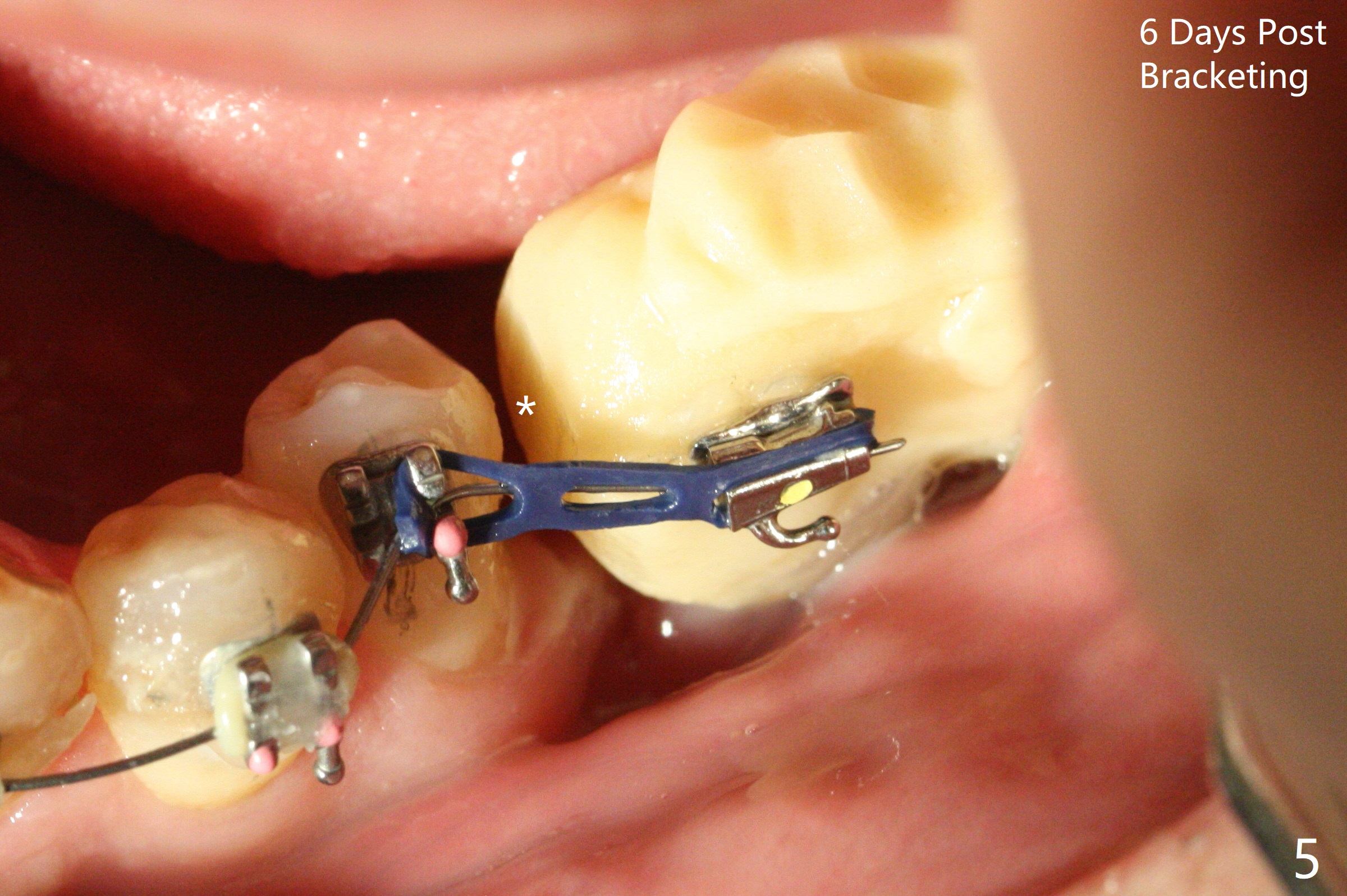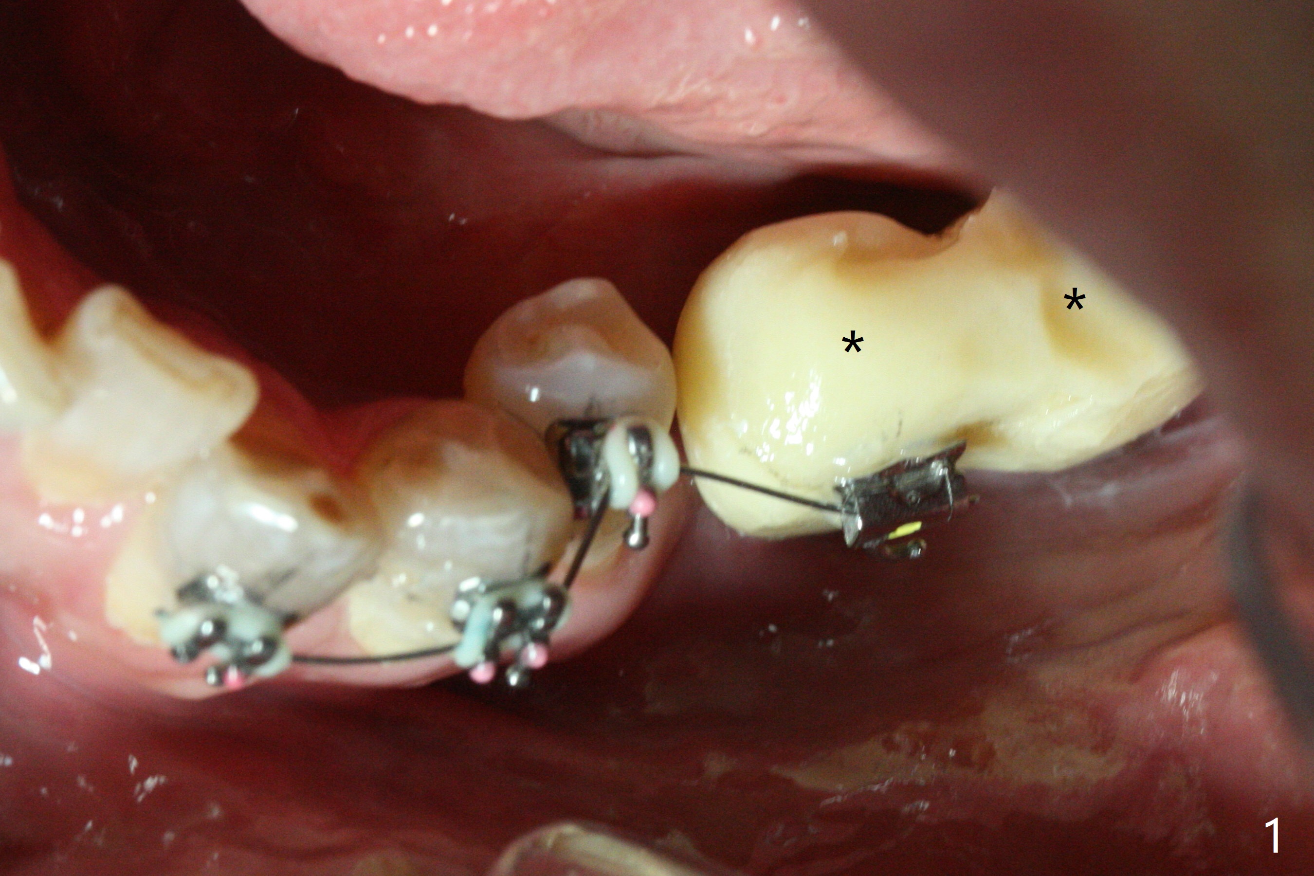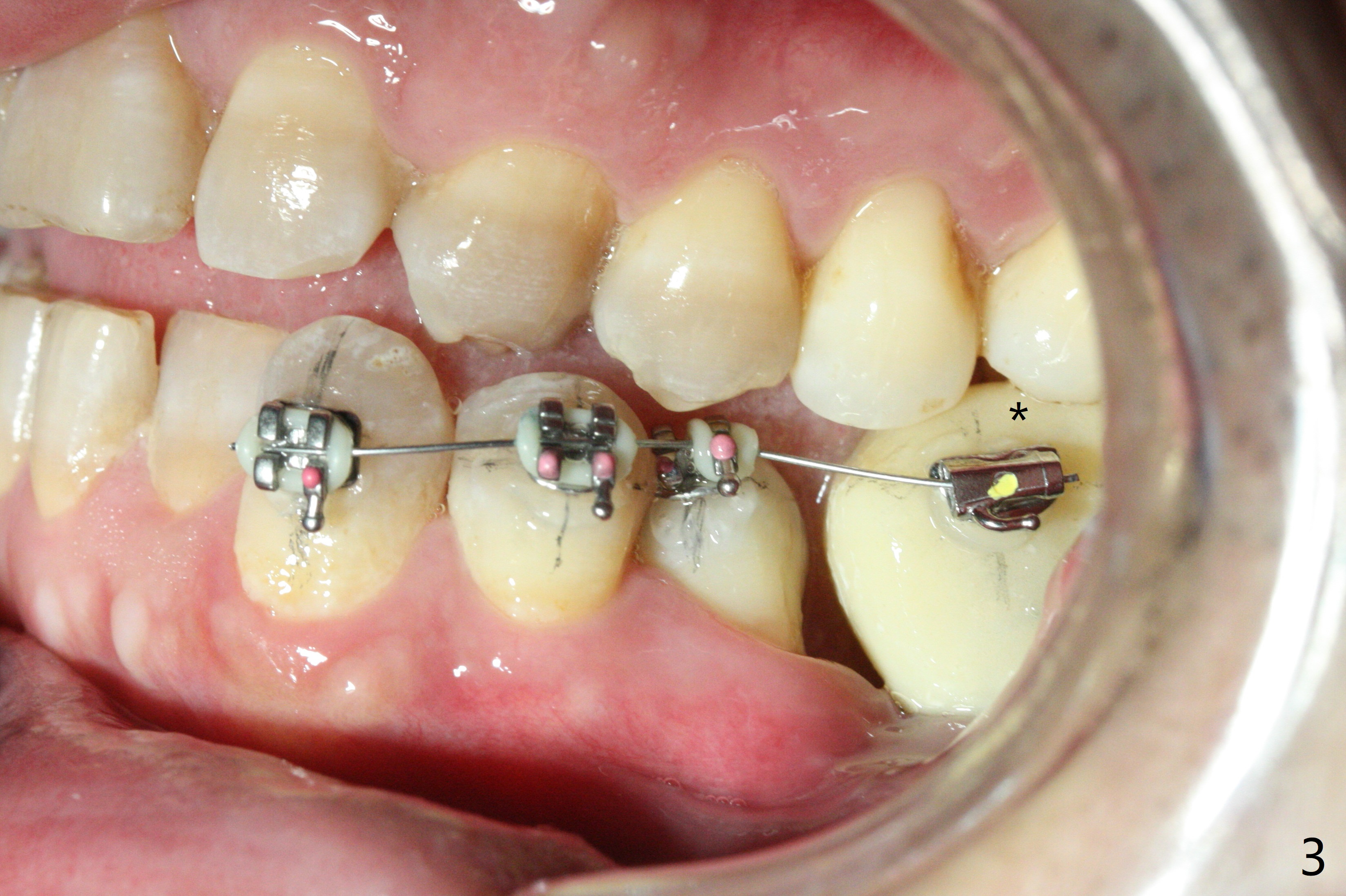 Two weeks post provisionalization over implants at #18 and 19 (4.5 months postop), acrylic is added to the provisional (Fig.1 *) and composite is placed on the other side (Fig.2 *) for clearance (Fig.3). Six days post bracketing, the diastema between LL5 and 6 decreases (Fig.4 between arrows, as compared to Fig.3), suggesting uprighting and distalization of the affected tooth. The diastema increases by trimming the mesial surface of LL6 provisional (Fig.5 *) prior to power chain placement. More acrylic is added to the occlusal surface of LL 6 and 7; more composite to that of UR3 (as compared to Fig.2) for clearance. Power chains change every week. LL5 is uprighted and distalized 1.5 months post banding (Fig.6,7 (14 niti)). Anterior brackets will be placed to correct LL2 cross bite next visit. Three weeks post open coil spring (5 months post initial banding), there is a space between LL2 and 3 (Fig.8) and between LL3/4 (Fig.9). The latter reduces instantly post power chain between LL3 and 6 (Fig.10). There is enough space for LL2 and sling shot is used to correct the cross bite 6.5 months post initial banding (Fig.11). The cross bite is corrected in 1.5 months after occlusal clearance is established (Fig.12). The lower left alignment is within normal limit, although in cross bite with the opposing dentition, immediate post molar crown cementation (Fig.13).