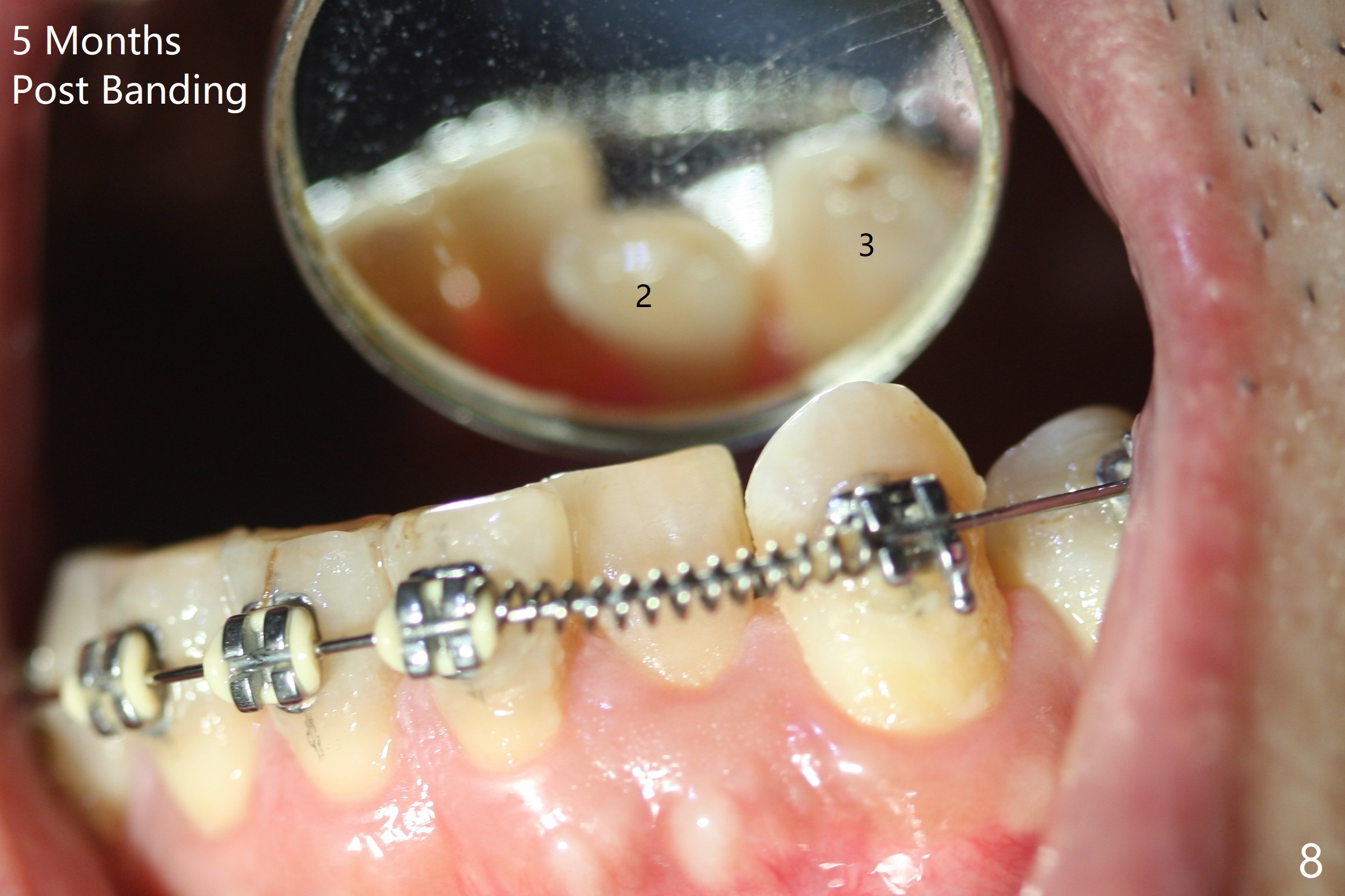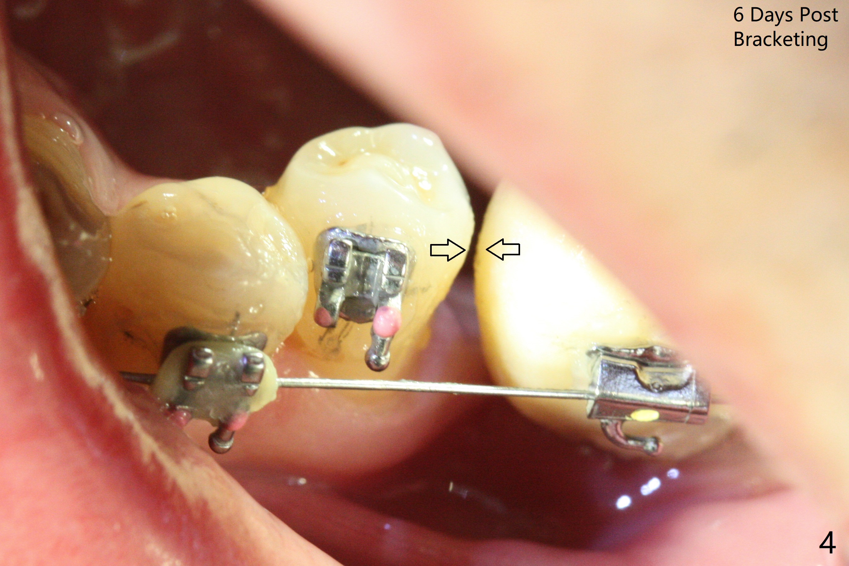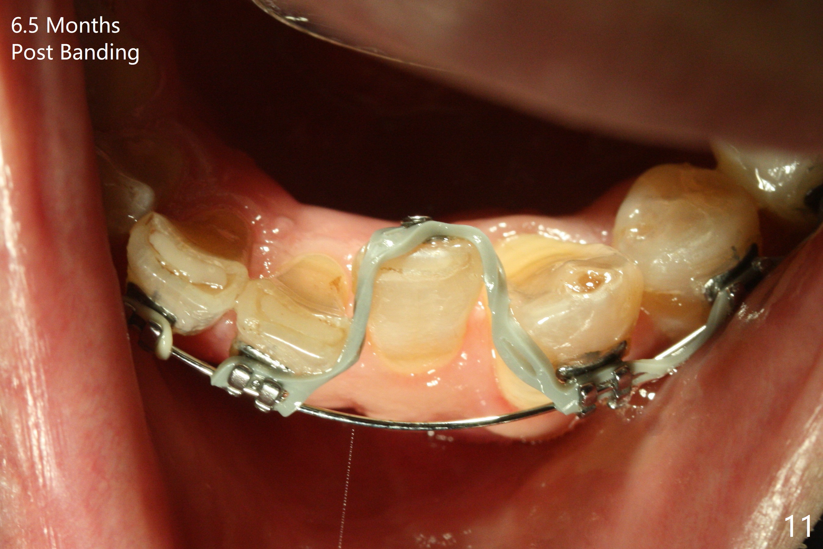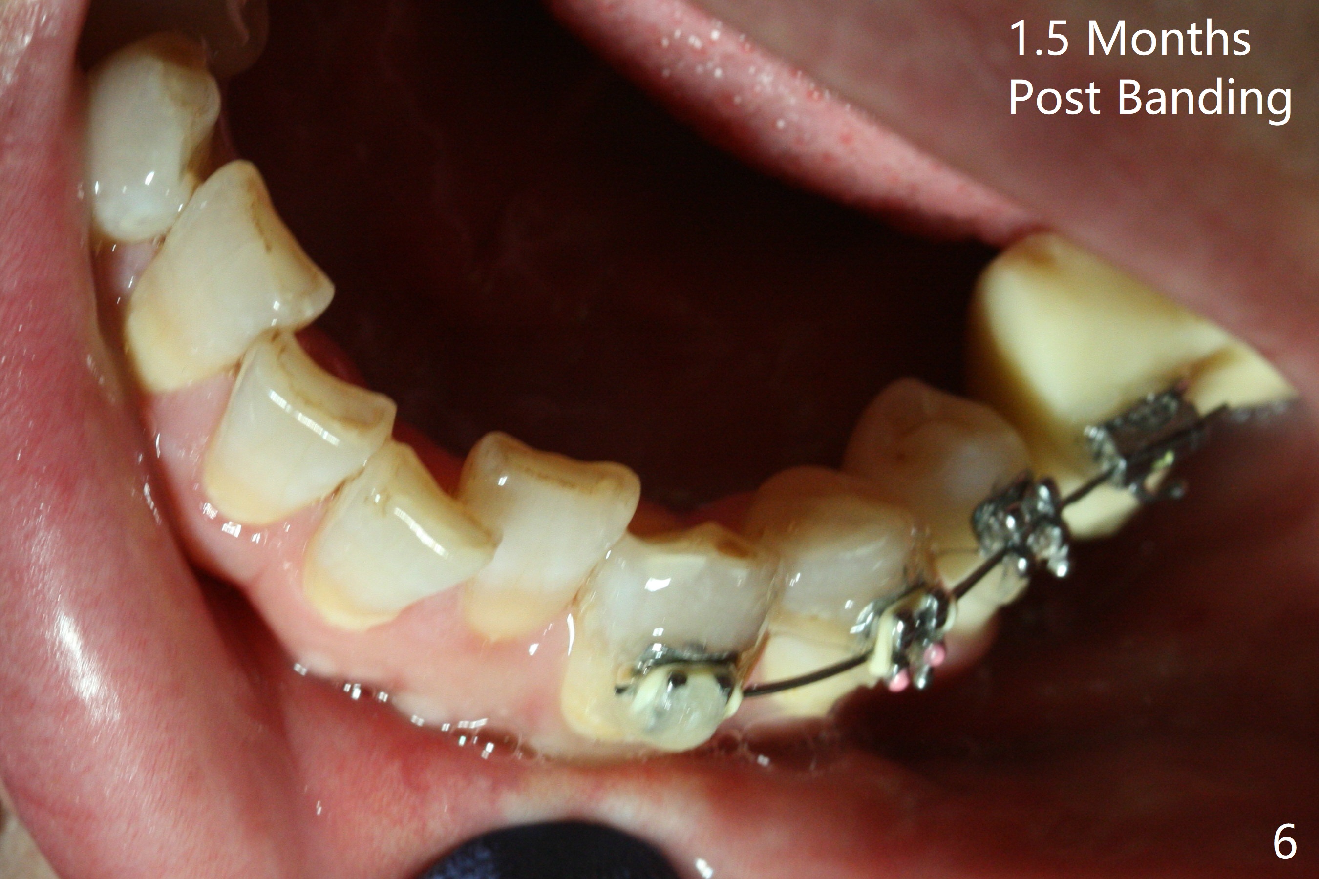Two weeks post provisionalization over implants at #18 and 19 (4.5 months postop), acrylic is added to the provisional (Fig.1 *) and composite is placed on the other side (Fig.2 *) for clearance (Fig.3). Six days post bracketing, the diastema between LL5 and 6 decreases (Fig.4 between arrows, as compared to Fig.3), suggesting uprighting and distalization of the affected tooth. The diastema increases by trimming the mesial surface of LL6 provisional (Fig.5 *) prior to power chain placement. More acrylic is added to the occlusal surface of LL 6 and 7; more composite to that of UR3 (as compared to Fig.2) for clearance. Power chains change every week. LL5 is uprighted and distalized 1.5 months post banding (Fig.6,7 (14 niti)). Anterior brackets will be placed to correct LL2 cross bite next visit. Three weeks post open coil spring (5 months post initial banding), there is a space between LL2 and 3 (Fig.8) and between LL3/4 (Fig.9). The latter reduces instantly post power chain between LL3 and 6 (Fig.10). There is enough space for LL2 and sling shot is used to correct the cross bite 6.5 months post initial banding (Fig.11). The cross bite is corrected in 1.5 months after occlusal clearance is established (Fig.12). The lower left alignment is within normal limit, although in cross bite with the opposing dentition, immediate post molar crown cementation (Fig.13).
