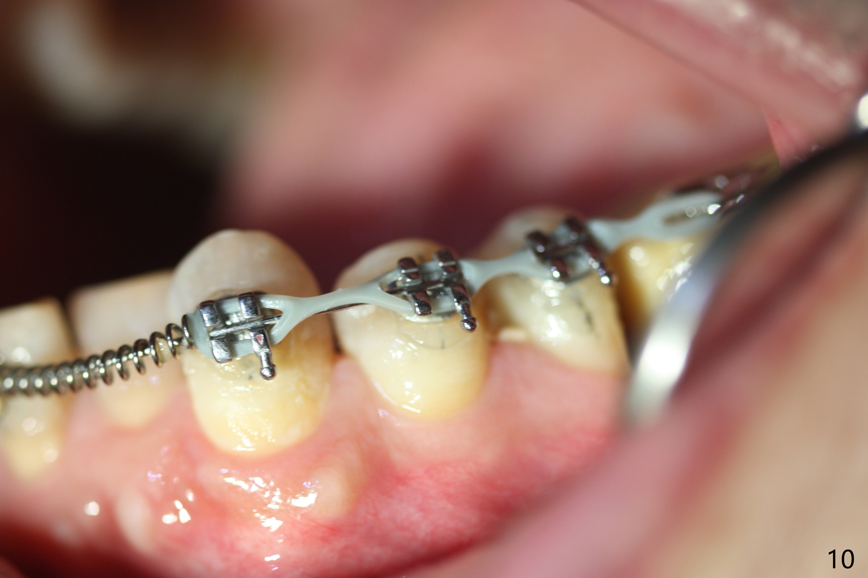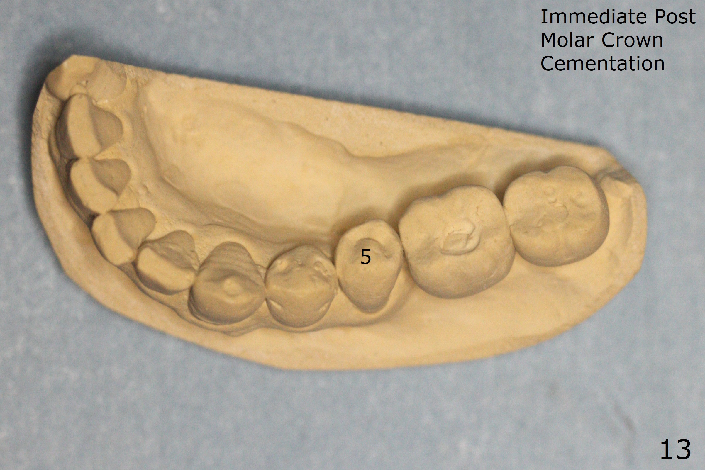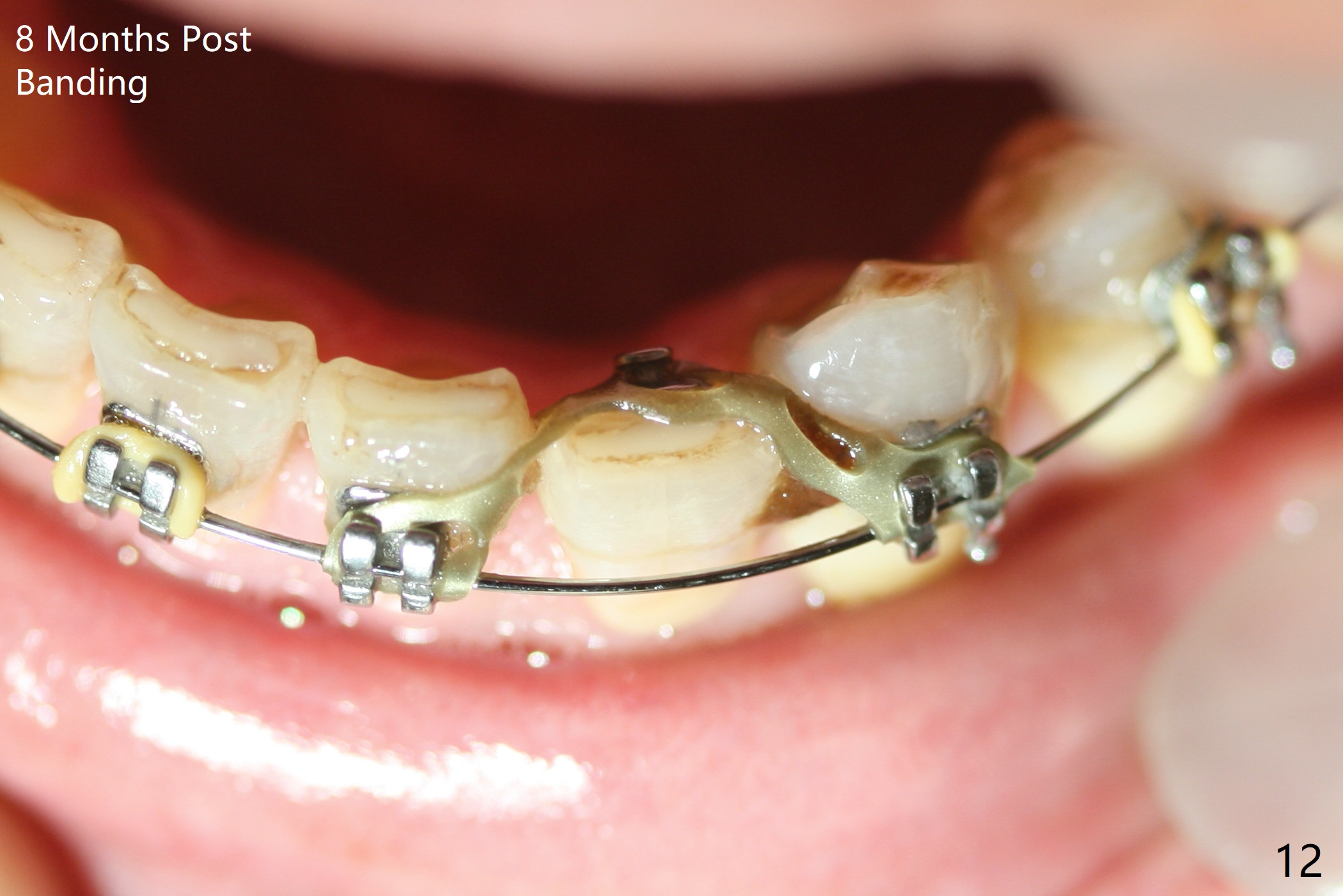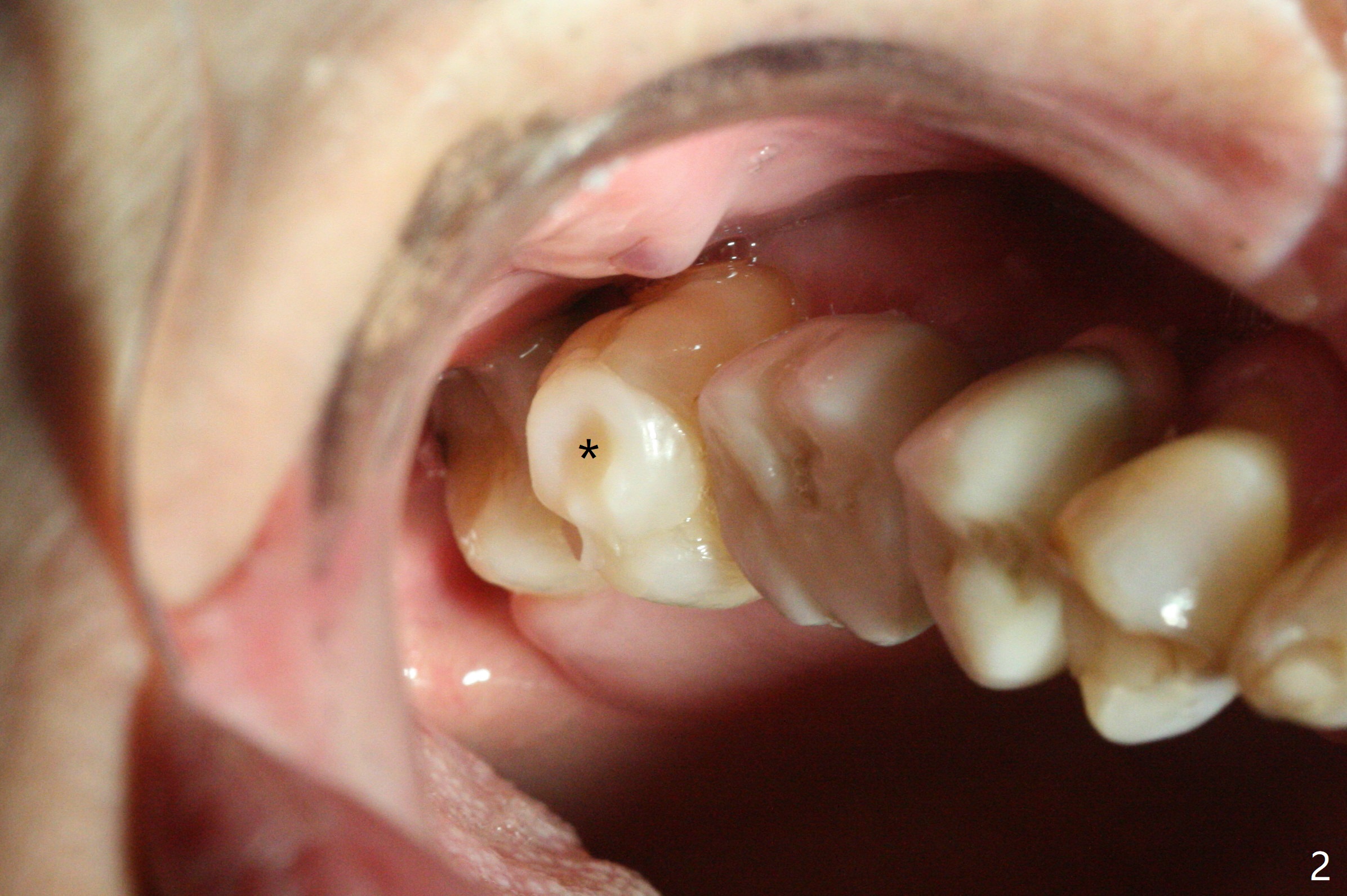 Two weeks post provisionalization over implants at #18 and 19 (4.5 months postop), acrylic is added to the provisional (Fig.1 *) and composite is placed on the other side (Fig.2 *) for clearance (Fig.3). Six days post bracketing, the diastema between LL5 and 6 decreases (Fig.4 between arrows, as compared to Fig.3), suggesting uprighting and distalization of the affected tooth. The diastema increases by trimming the mesial surface of LL6 provisional (Fig.5 *) prior to power chain placement. More acrylic is added to the occlusal surface of LL 6 and 7; more composite to that of UR3 (as compared to Fig.2) for clearance. Power chains change every week. LL5 is uprighted and distalized 1.5 months post banding (Fig.6,7 (14 niti)). Anterior brackets will be placed to correct LL2 cross bite next visit. Three weeks post open coil spring (5 months post initial banding), there is a space between LL2 and 3 (Fig.8) and between LL3/4 (Fig.9). The latter reduces instantly post power chain between LL3 and 6 (Fig.10). There is enough space for LL2 and sling shot is used to correct the cross bite 6.5 months post initial banding (Fig.11). The cross bite is corrected in 1.5 months after occlusal clearance is established (Fig.12). The lower left alignment is within normal limit, although in cross bite with the opposing dentition, immediate post molar crown cementation (Fig.13).