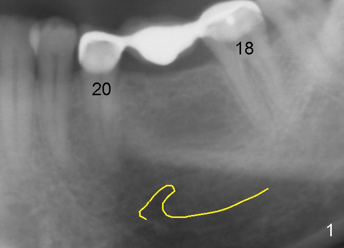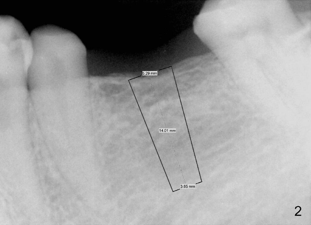 A 47-year-old man has lost a lower left fixed partial denture (FPD) for a while (Fig.1,2). There is limited space between the abutments (of the teeth #18 and 20) and the opposing dentition. The edentulous ridge is wide enough to use a 4 mm tissue punch. A 5.3x14 mm bone-level implant is to be placed (Fig.2). The base of the implant is at the level of the apices of the neighboring teeth. As compared to Fig.1 in term of the Inferior Alveolar Canal (yellow line), there should be enough safe margin. The first intraop PA is taken after 2 mm pilot drill for depth and trajectory check, Drill stops are to be used for safety. If primary stability is achieved, an abutment is placed and a provisional bridge will be fabricated to prevent further narrowing of the interocclusal clearance during 3-4 months of osteointegration. How is outcome?