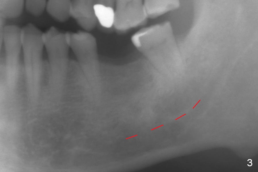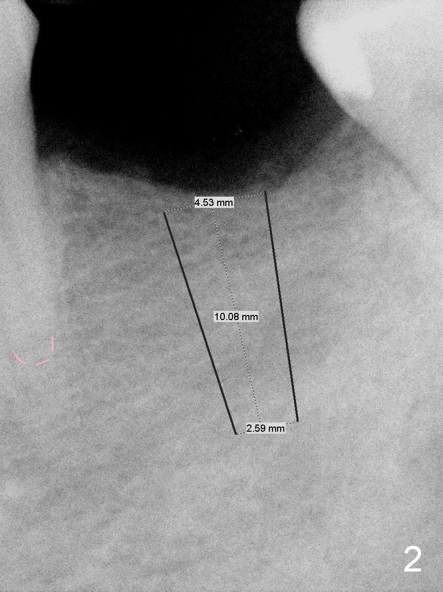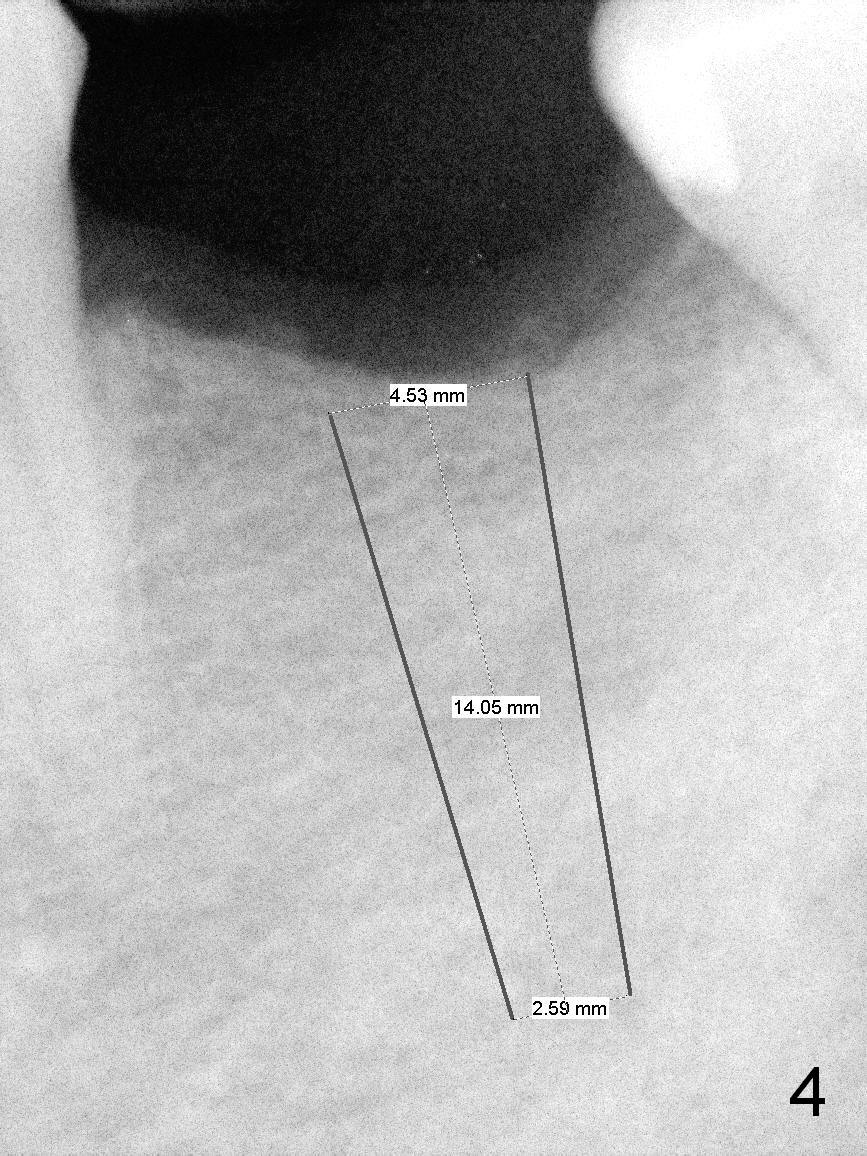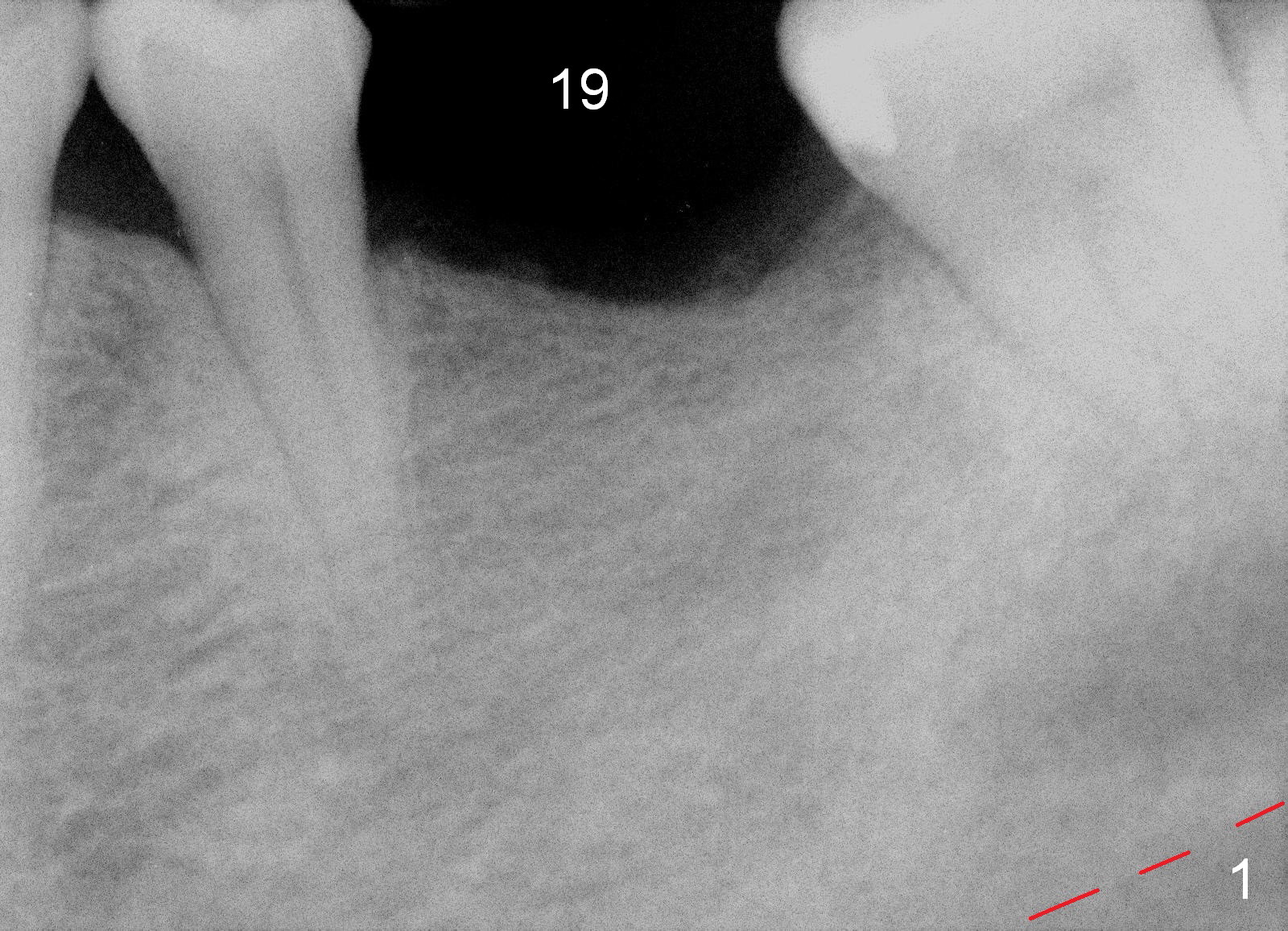 A 60-year-old man has lost the tooth #19 for approximate 20 years (Fig.1). The superior border of the Inferior Alveolar Canal is not distinct in PA. An implant that is slightly longer than the root of the neighboring tooth should be safe (Fig.2). Panoramic X-ray reveals plenty of bone height (Fig.3). Therefore, initial osteotomy depth will be 10 mm. Insert a parallel pin and take the 1st intraop PA for depth confirmation. If there is enough bone to place a 14 mm implant (Fig.4), but the crestal width is insufficient, place a 12 mm implant subcrestally to prevent thread exposure.