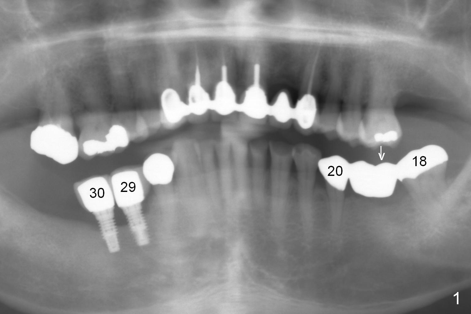 A 71-year-old man has lost an implant at #29 (Fig.1 (taken 3 years earlier)). CT shows that the implant at #30 is failing. The biggest challenge of re-placing implants at the lower right is lack of keratinized gingiva. Gingival graft is mandatory.