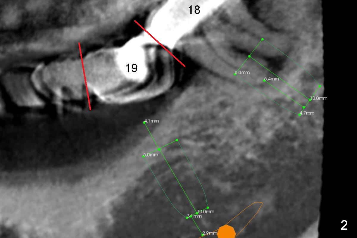 The 3-unit bridge (#18-20 in Fig.1) will be sectioned (Fig.2 red lines) with the pontic of #19 to be removed. The ridge top is narrow (Fig.3). To place a 5 mm UF implant, the triangular ridge top should be reduced (result).