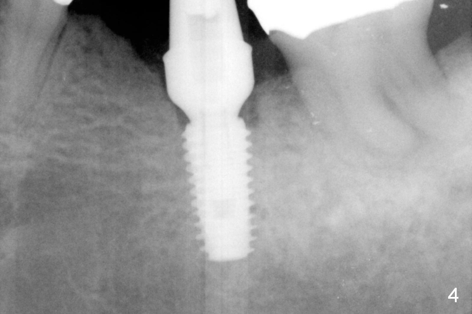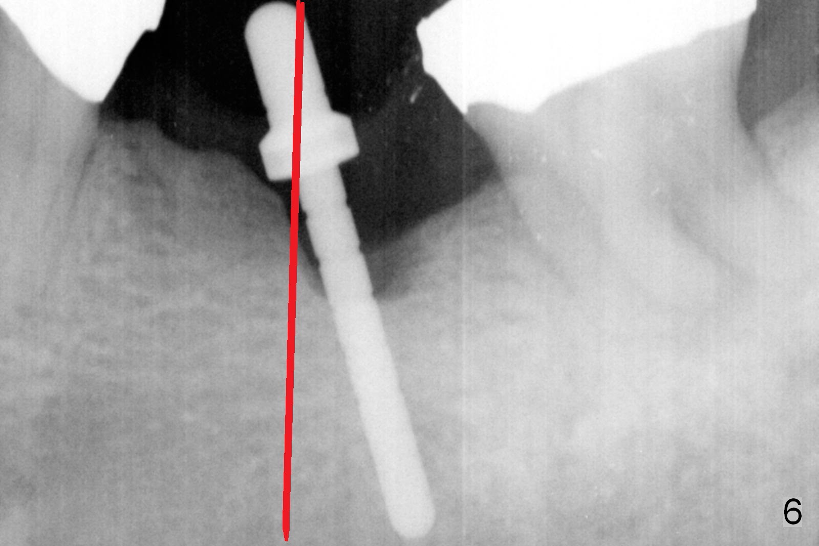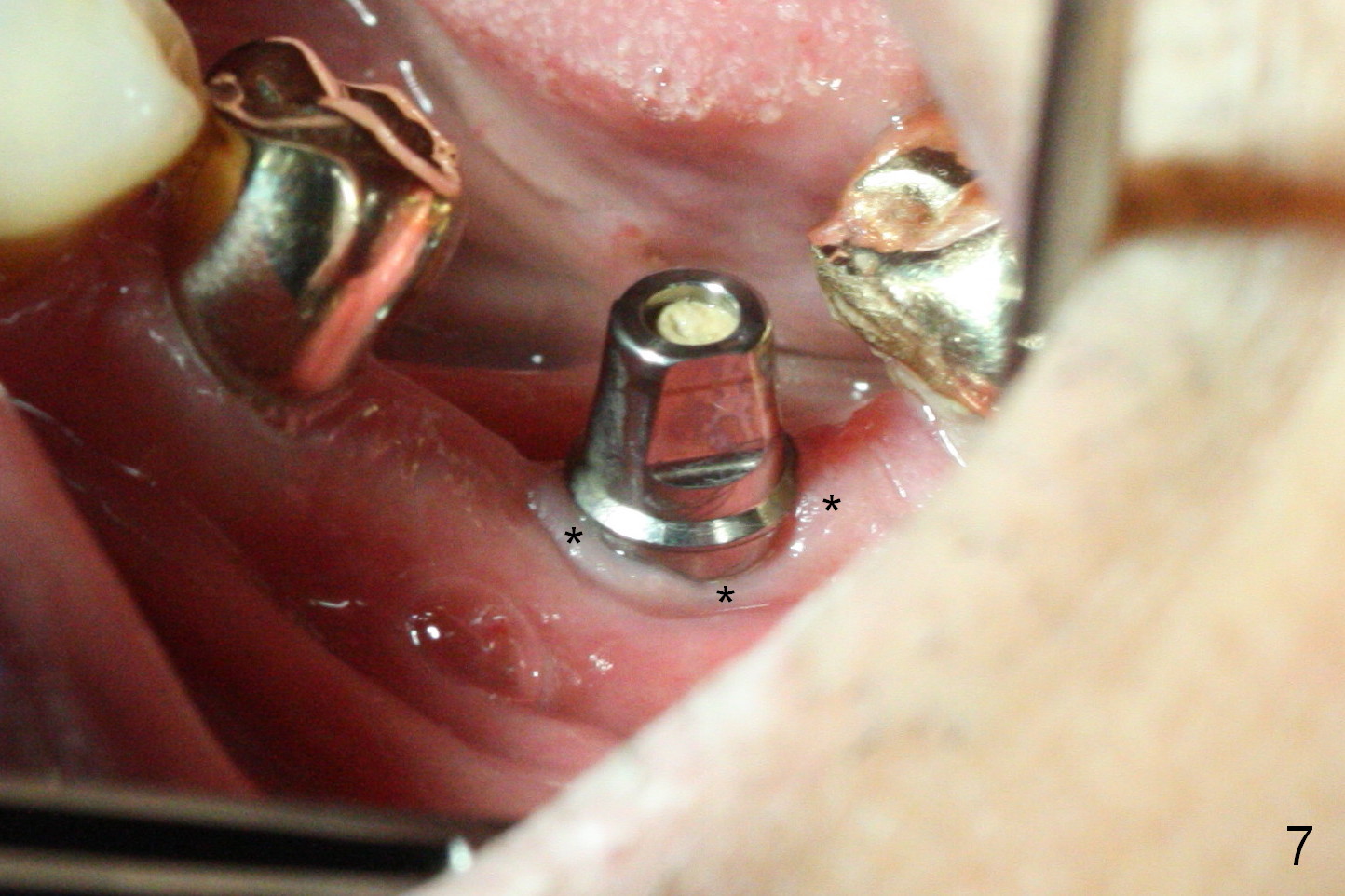 The narrow ridge top is trimmed until the buccolingual width is 7-8 mm; osteotomy starts in the flattened ridge (Fig.1, 2). A 5x10 mm implant is being placed (Fig.3). A cemented abutment (6.5x5.5(5) mm) is placed after adjusting the mesial and distal walls of the trimmed ridge (Fig.4). The patient returns for restoration 6 months postop. The coronal opening of the osteotomy becomes flared (Fig.5). The position and trajectory of the osteotomy should have been changed as early as possible (Fig.6, more or less parallel to the premolar) to avoid necessity of changing the cemented abutment (Fig.7 (* keratinized gingiva)) to an angled one (5.5 x15 degree A (4) mm).