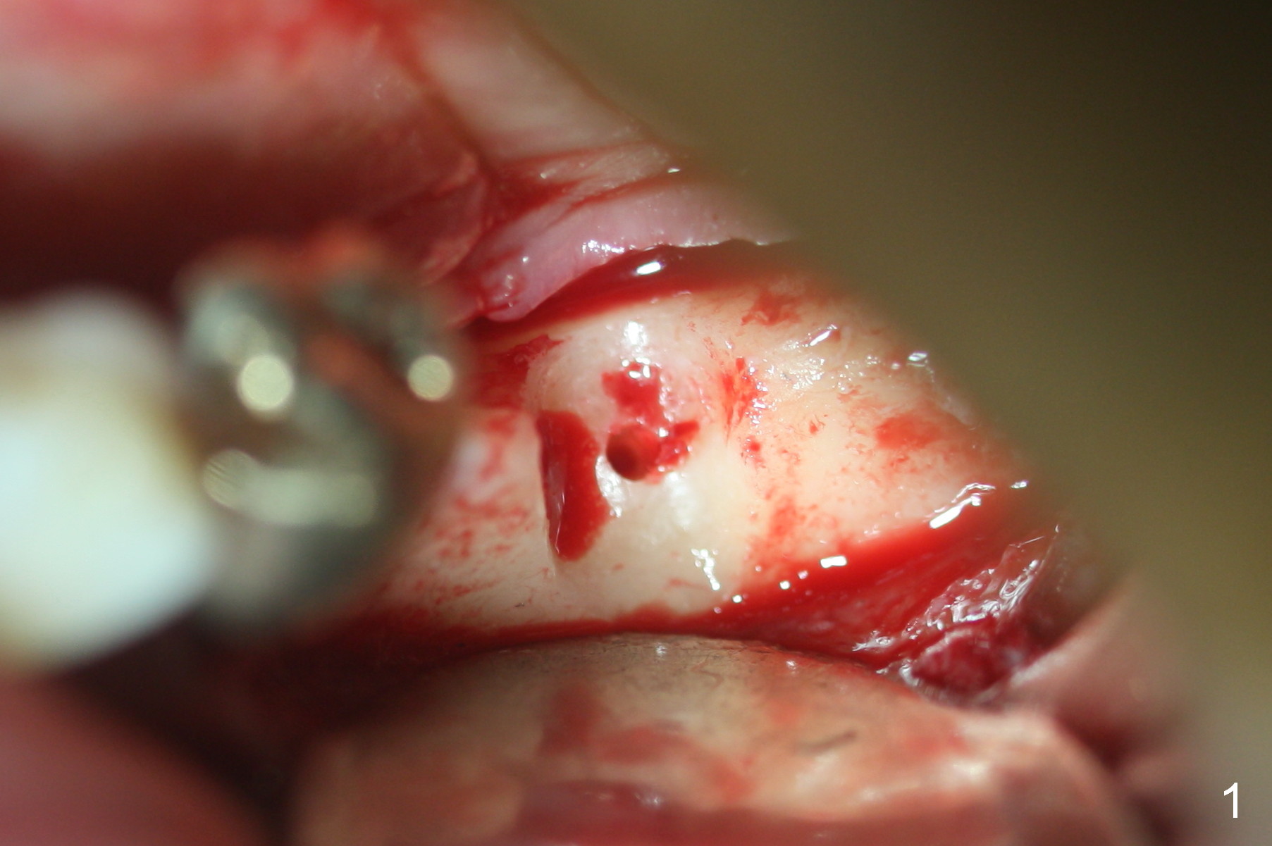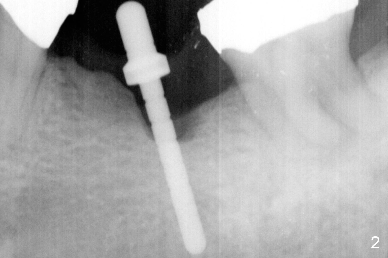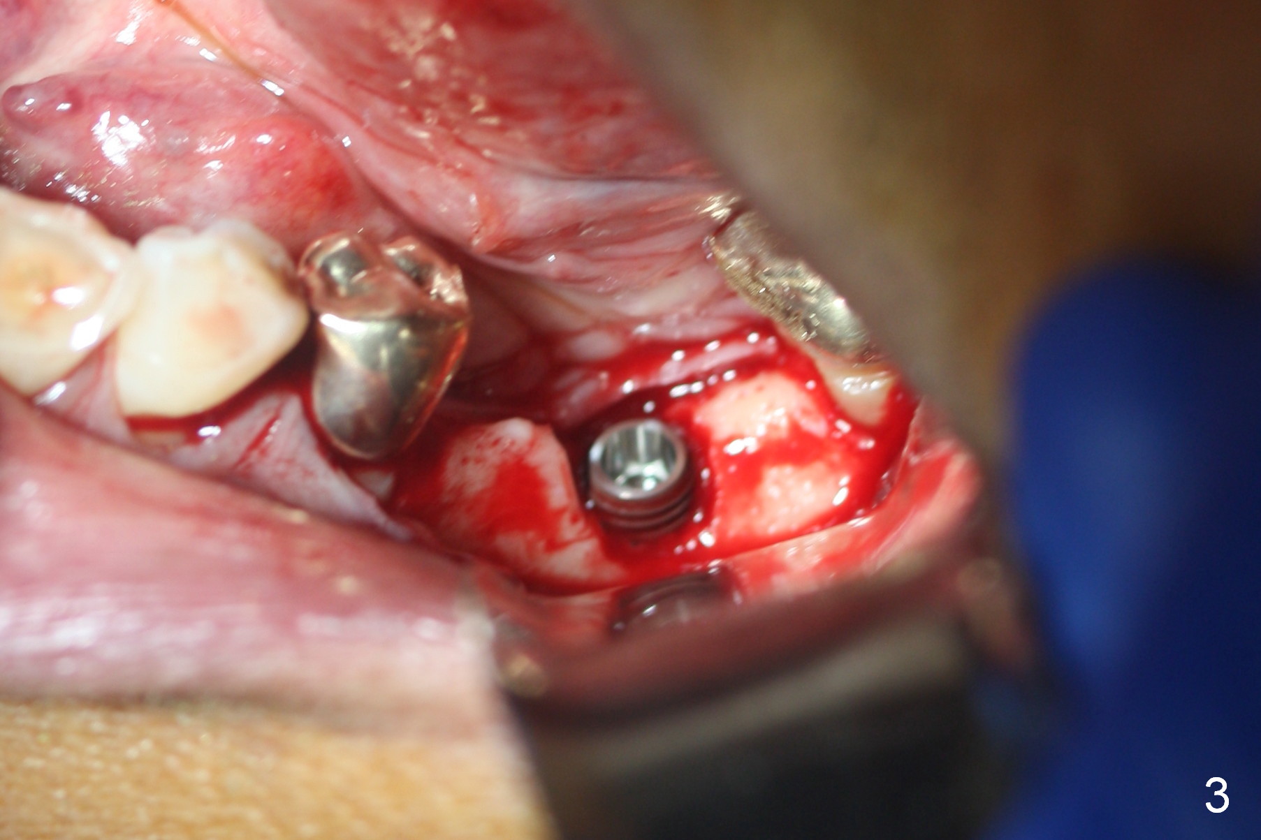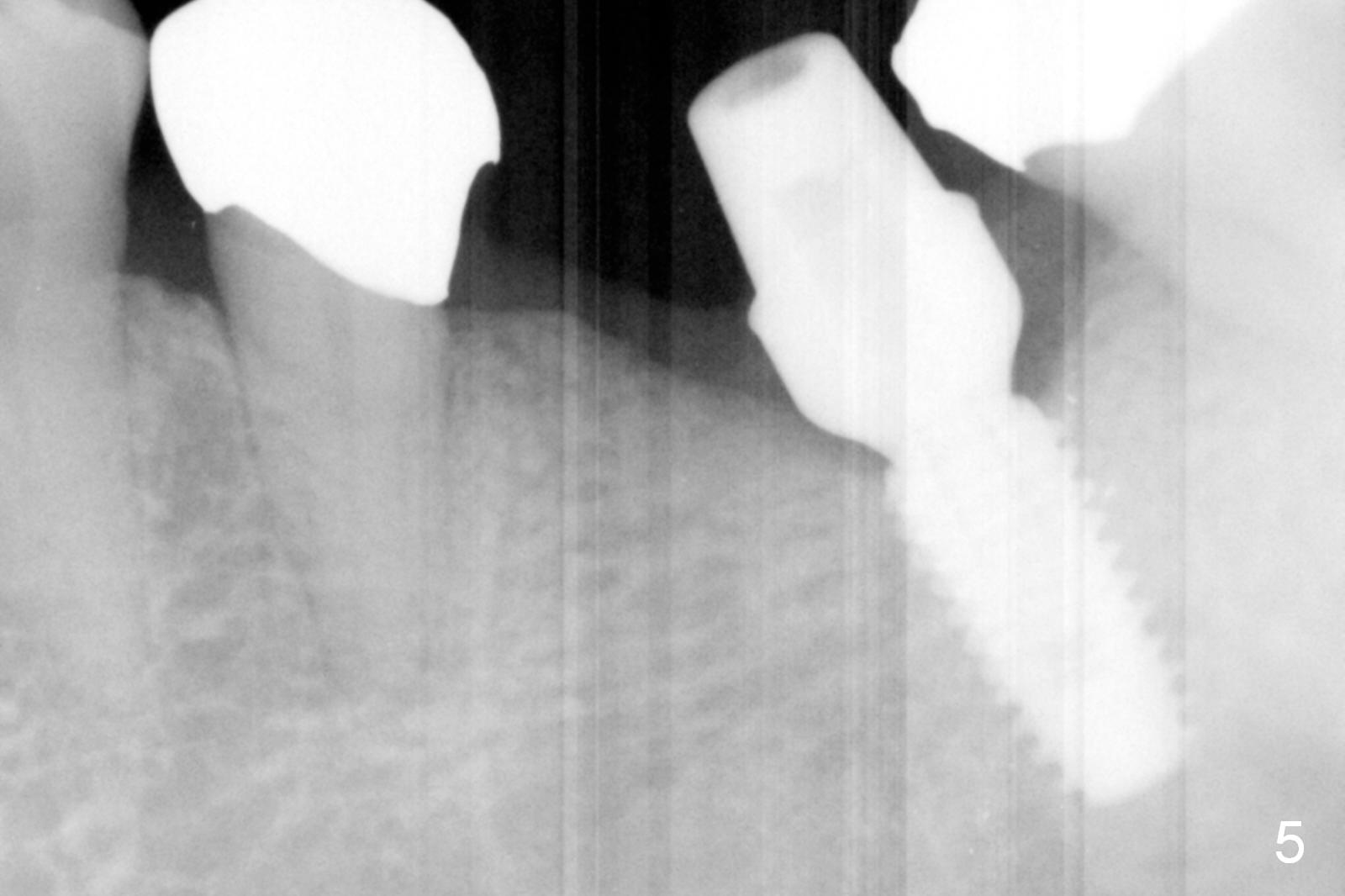 The narrow ridge top is trimmed until the buccolingual width is 7-8 mm; osteotomy starts in the flattened ridge (Fig.1, 2). A 5x10 mm implant is being placed (Fig.3). A cemented abutment (6.5x5.5(5) mm) is placed after adjusting the mesial and distal walls of the trimmed ridge (Fig.4). The patient returns for restoration 6 months postop. The coronal opening of the osteotomy becomes flared (Fig.5). The position and trajectory of the osteotomy should have been changed as early as possible (Fig.6, more or less parallel to the premolar) to avoid necessity of changing the cemented abutment (Fig.7 (* keratinized gingiva)) to an angled one (5.5 x15 degree A (4) mm).